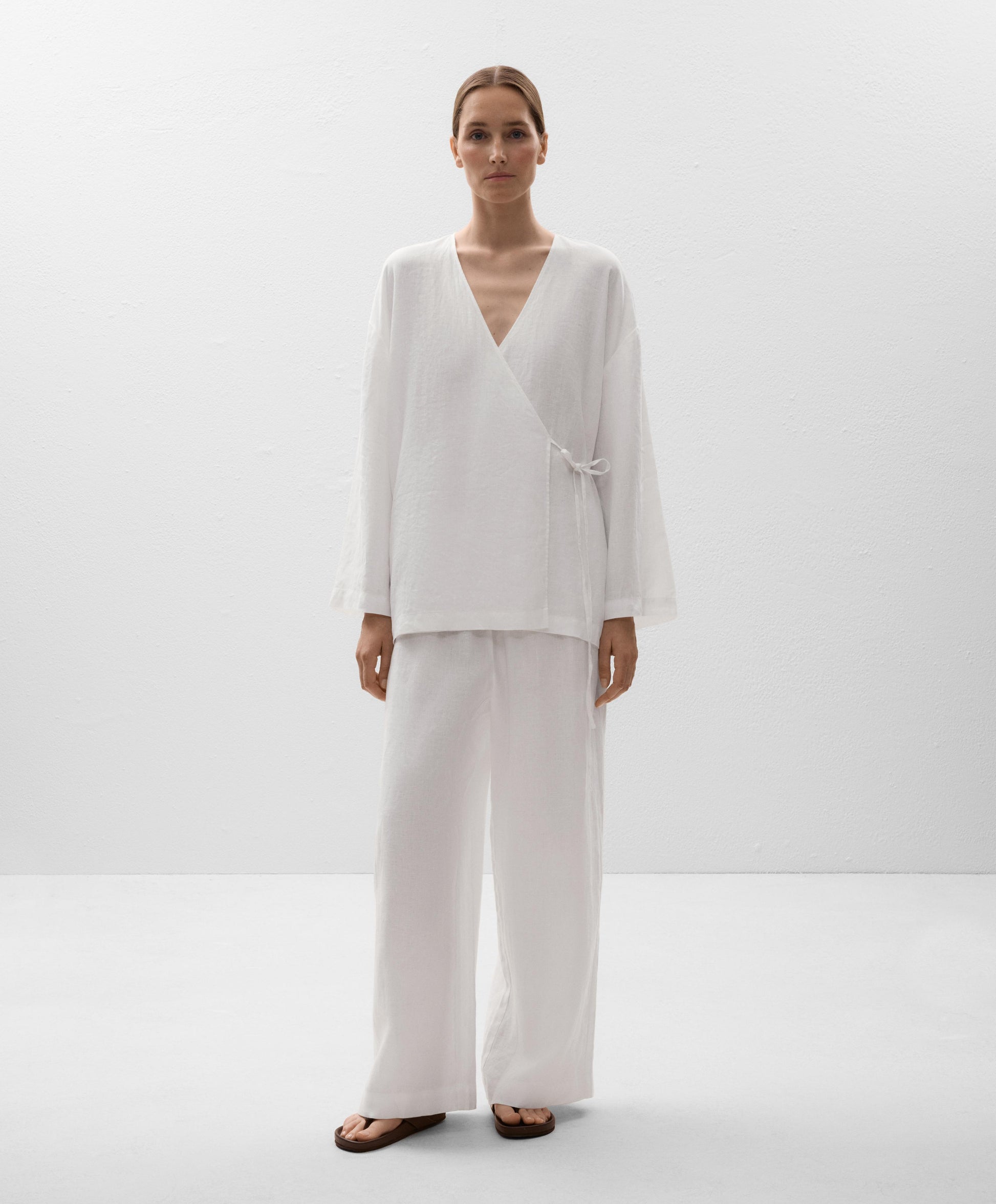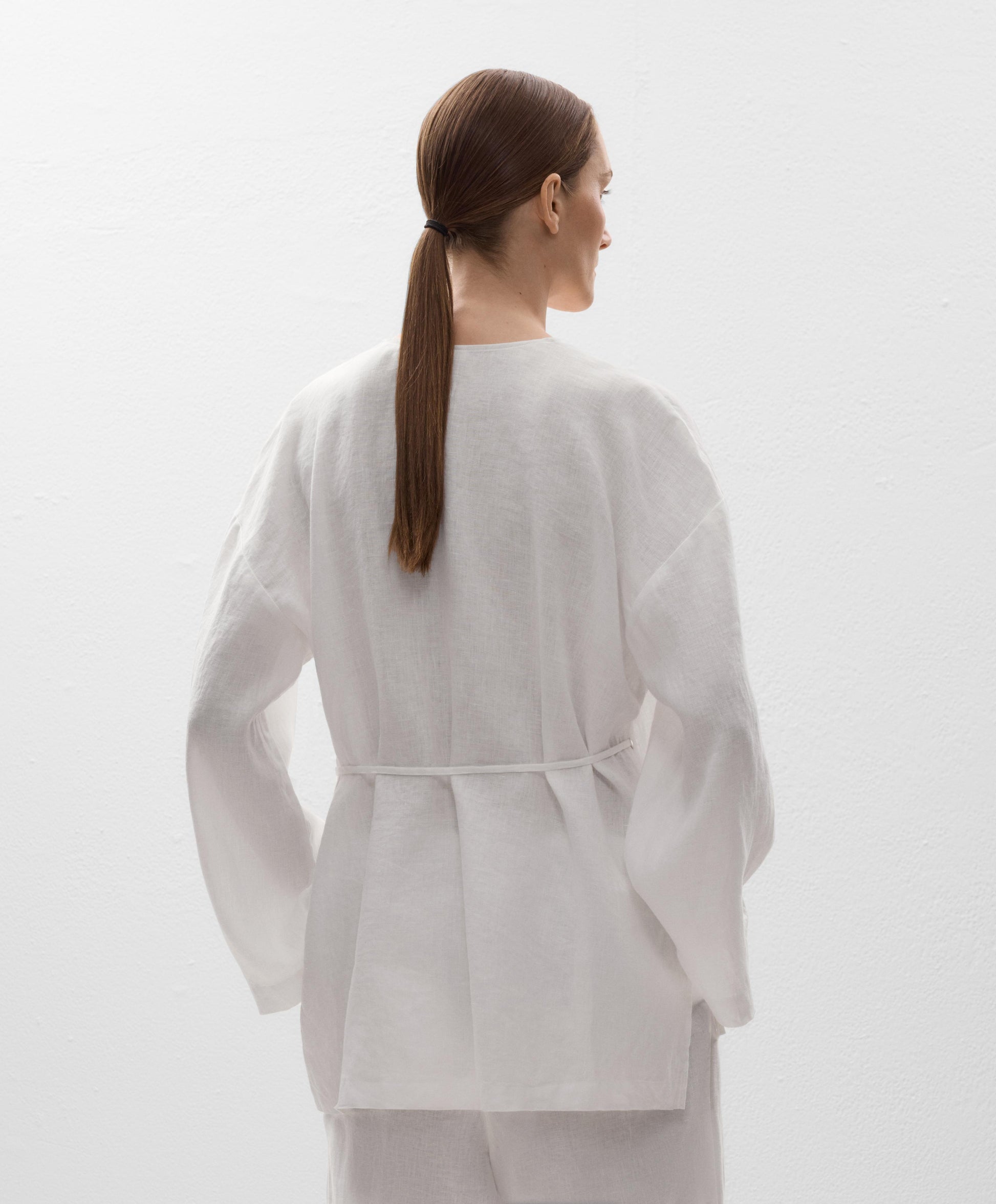 Ref. 0094/023/251 Kimono-style shirt with wrap V-neck and long sleeves. Wrap fastening with side tie. Made with 100% linen fabric.Materials and care instructions