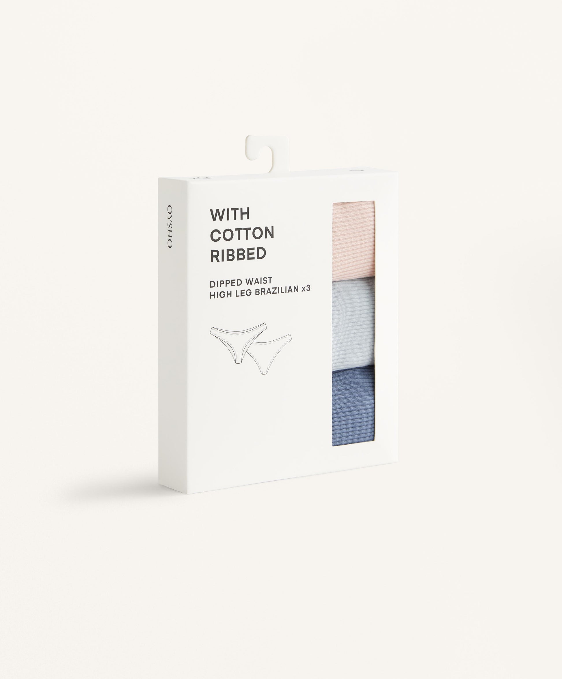 Ref. 1474/561/920 Pack of three U-cut Brazilian briefs in cotton blend rib fabric in different plain colours. Stretch waist.Materials and care instructions