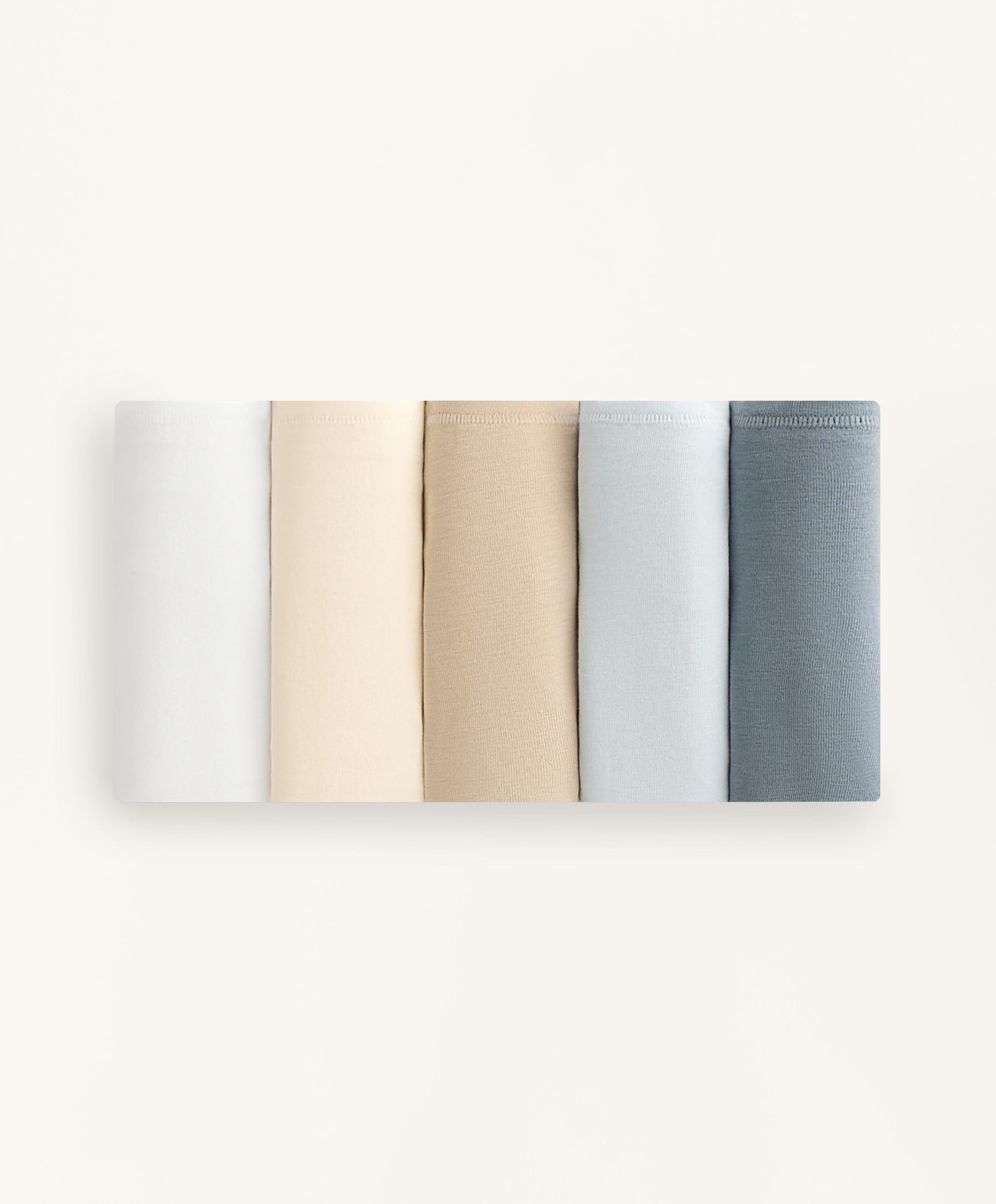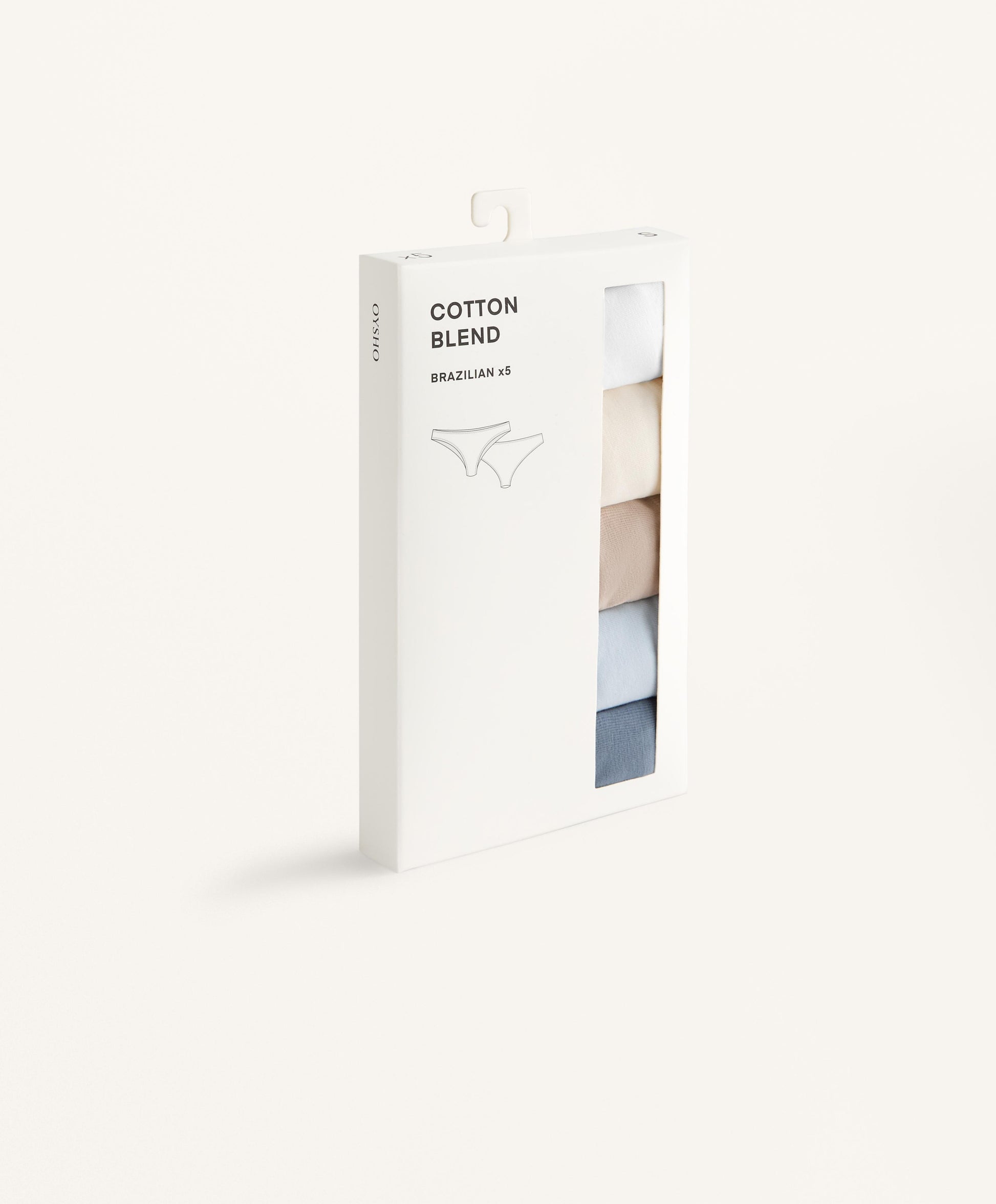 Ref. 1622/596/477 Pack of 5 Brazilian knickers in a cotton blend in various plain colours. Elasticated waist.Materials and care instructions