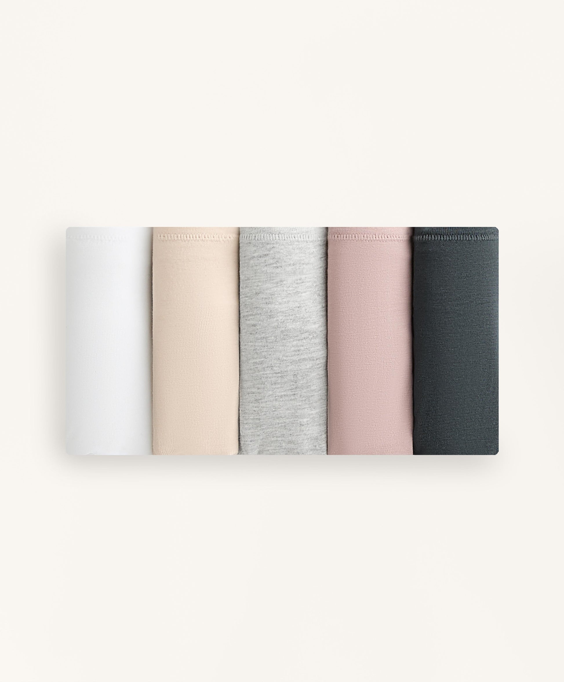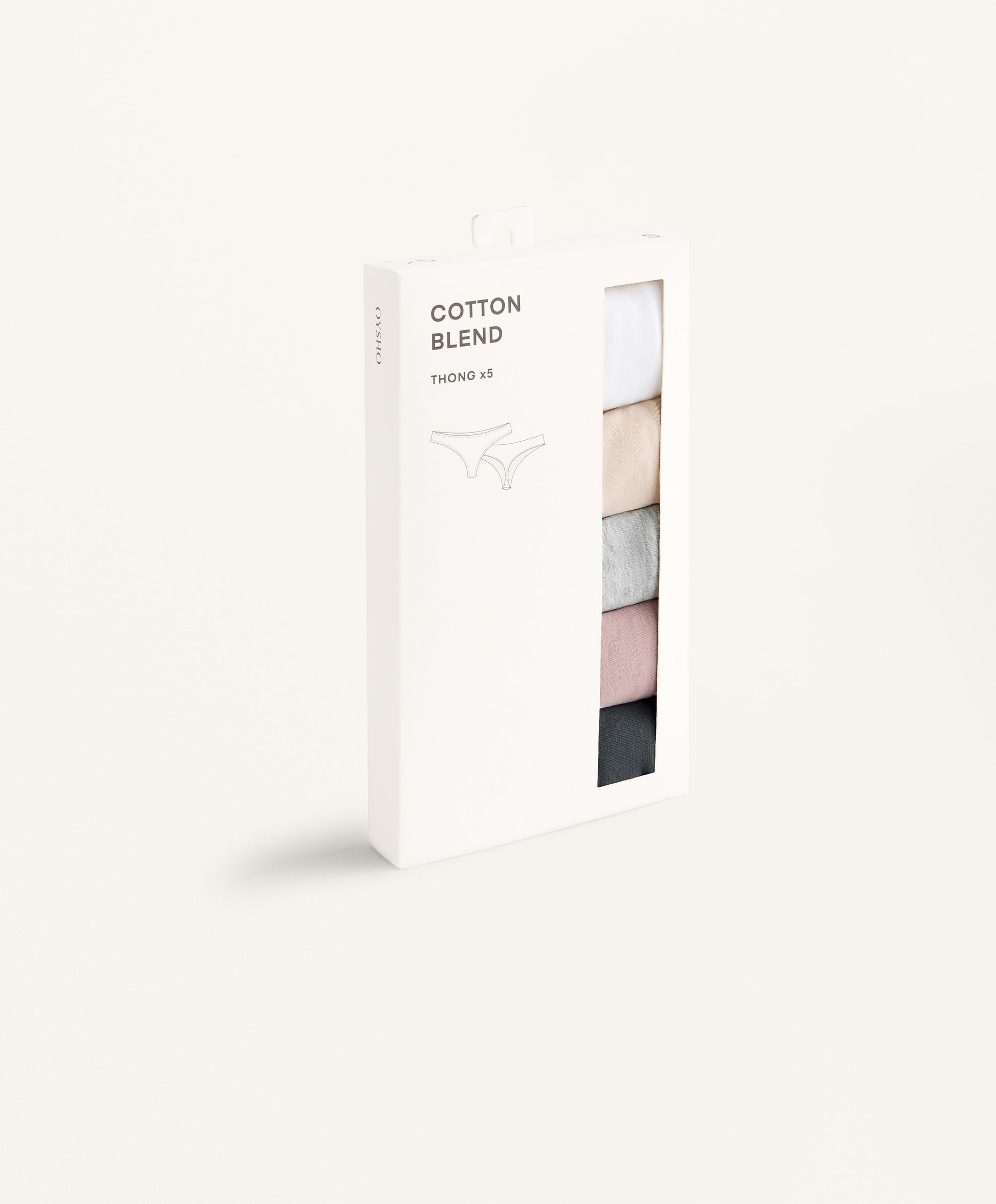 Ref. 1582/598/479 Pack of 5 cotton blend thong briefs in assorted plain colours. Elasticated waistband and flat seams.Materials and care instructions