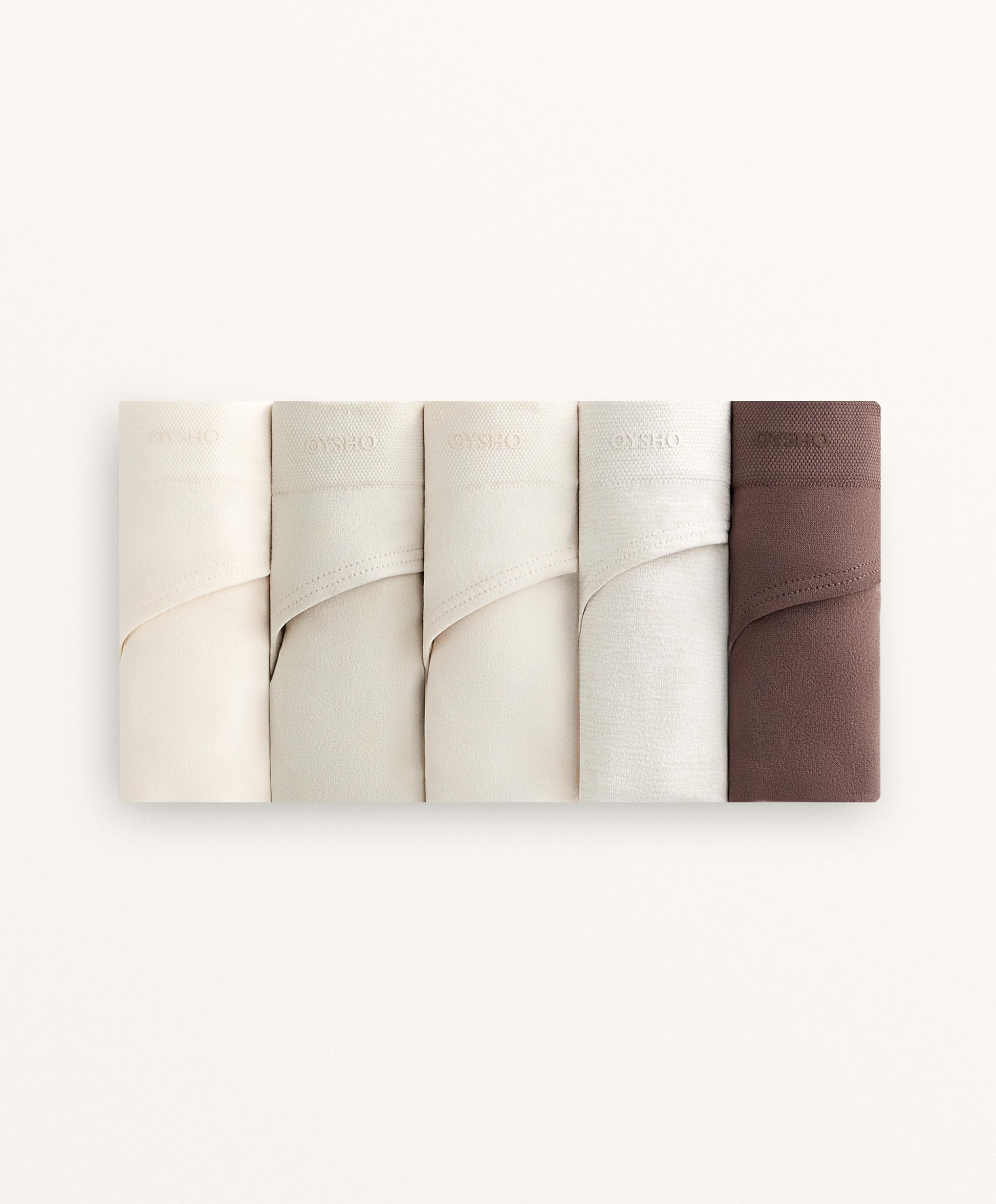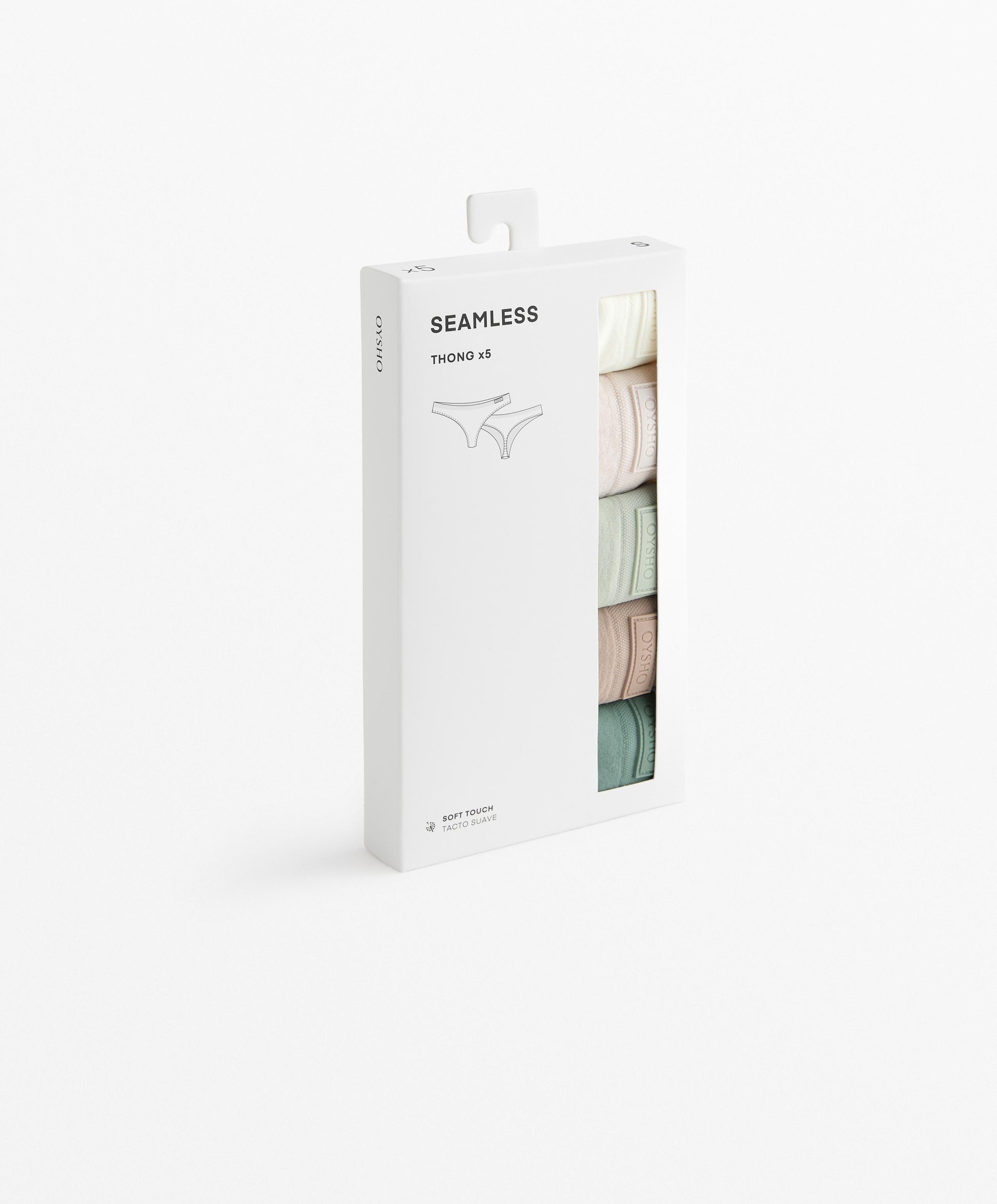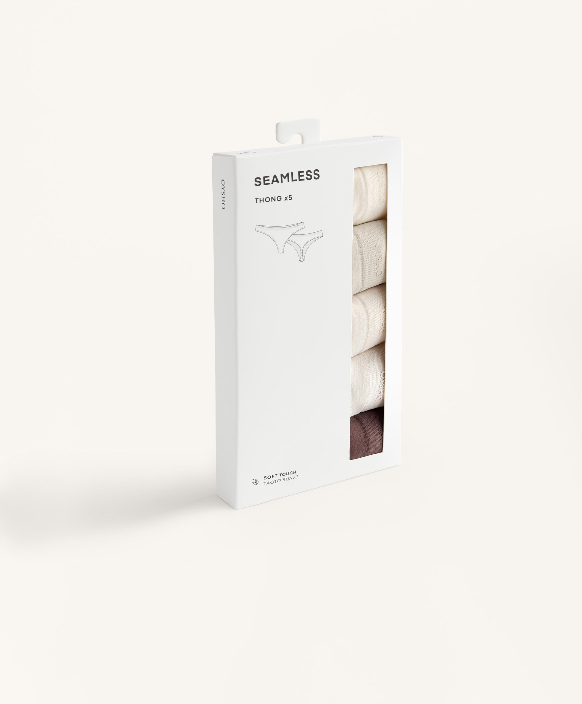 Ref. 3593/598/862 Pack of five seamless thongs in different plain colours. Stretch waist with tonal silicone logo detail. Soft-touch seamless fabric.Materials and care instructions