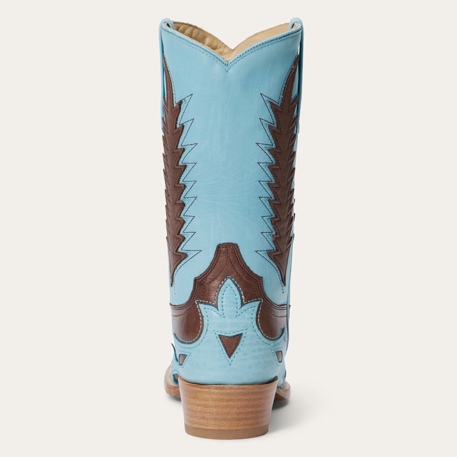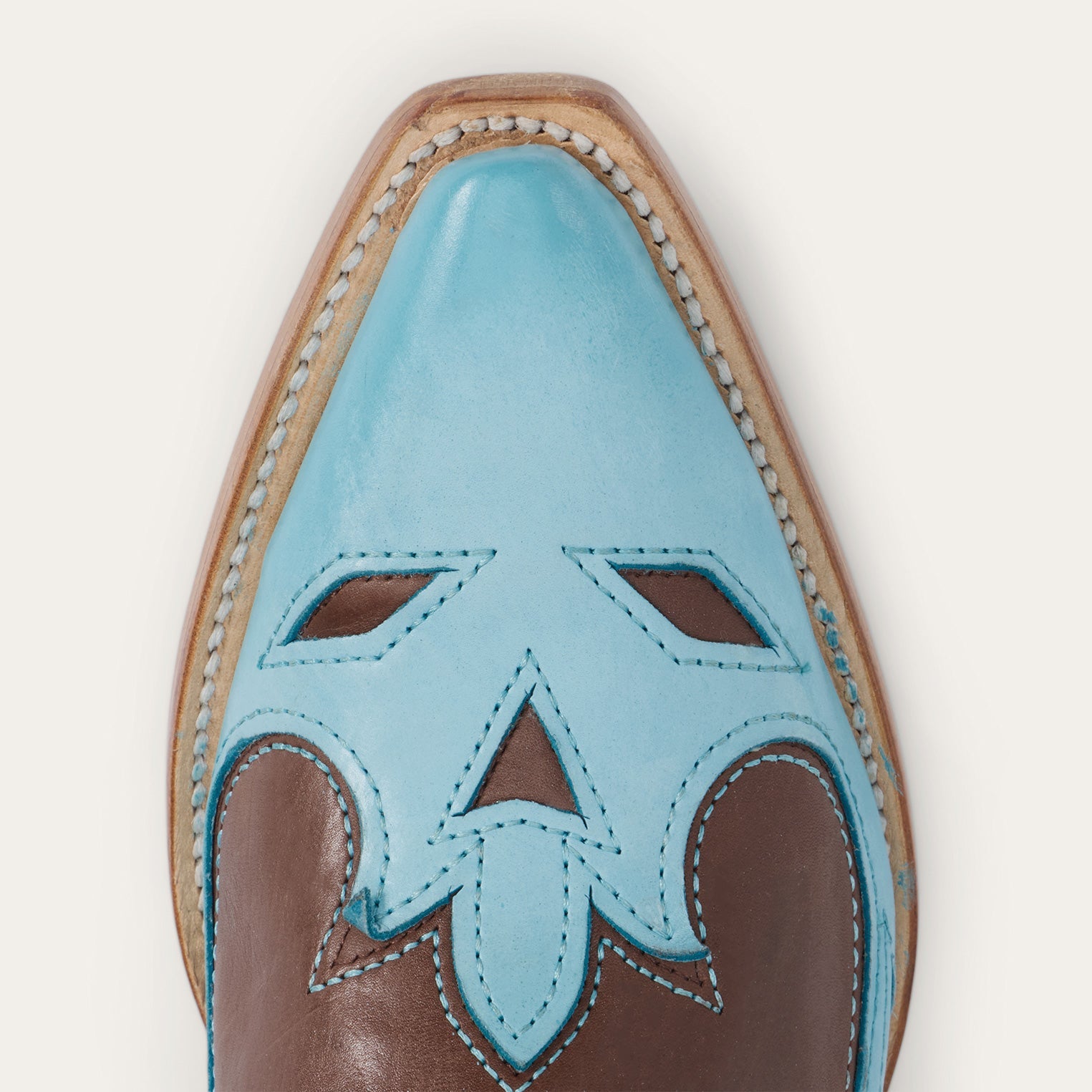 A statement-making western boot with bold contrast and timeless character, the two-tone Alix Boot features a calf leather vamp and 10" shaft with an intricate vintage flame underlay design. It has a snip toe, a stylish, flattering silhouette, and hand-stacked leather heel. An all-leather sole, crafted with lemonwood pegs and brass nails, provides a firm foundation, while premium cowhide leather lining and a cushioned leather insole ensure all-day comfort and support.