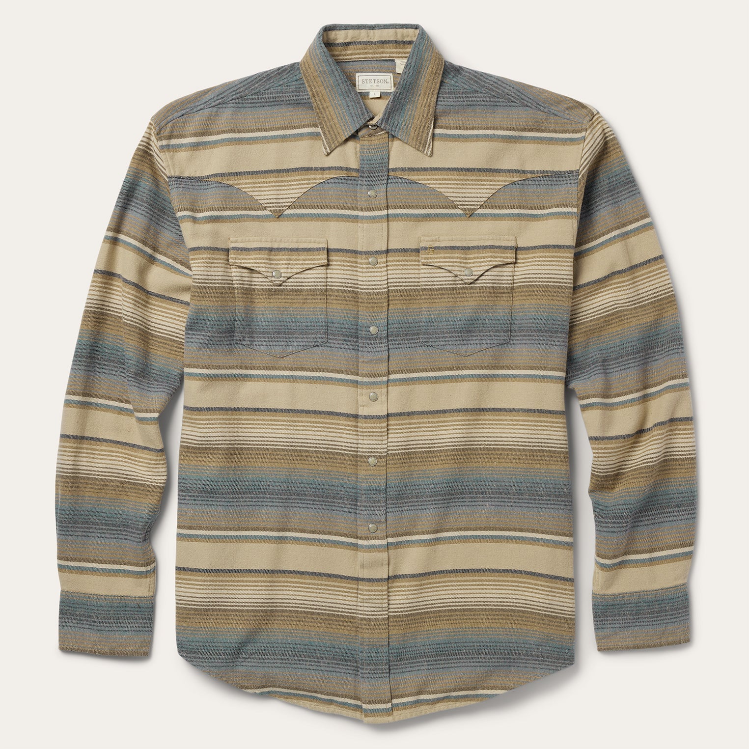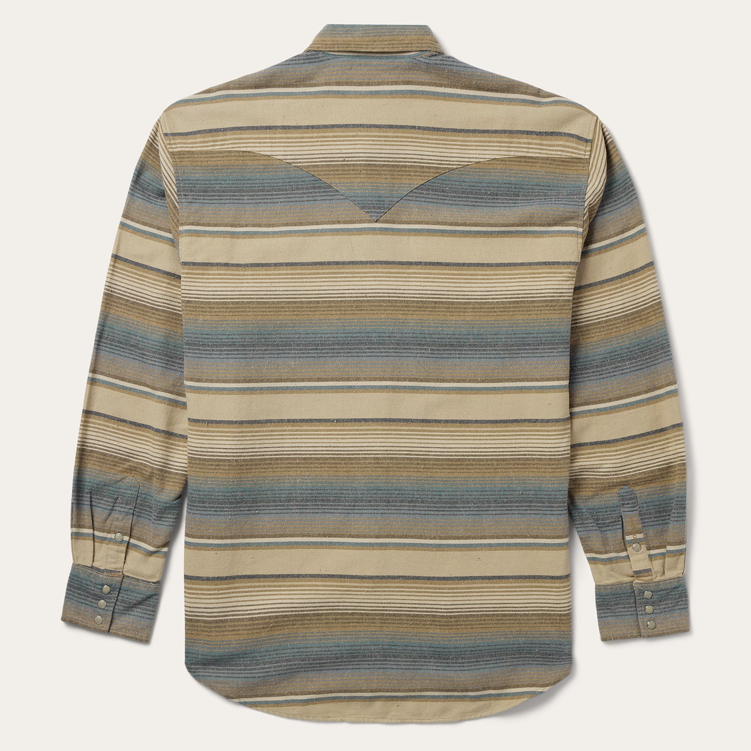 This rugged snap-front flannel shirt features a blue horizontal stripe pattern along with classic western style details like a one-point curved back yoke and a three-snap roper cuff. Crafted from a 100% cotton twill flannel that has been yarn-dyed for rich, lasting color and brushed for a soft appearance, the shirt is garment washed, giving it the lived-in feel of an old favorite that will break in further over time. It has a spread collar with collar stays to keep it in place and is cut in our Original Fit, which allows for comfort and freedom of movement. Exceedingly durable and always comfortable, our shirts are hard-wearing and built to last.