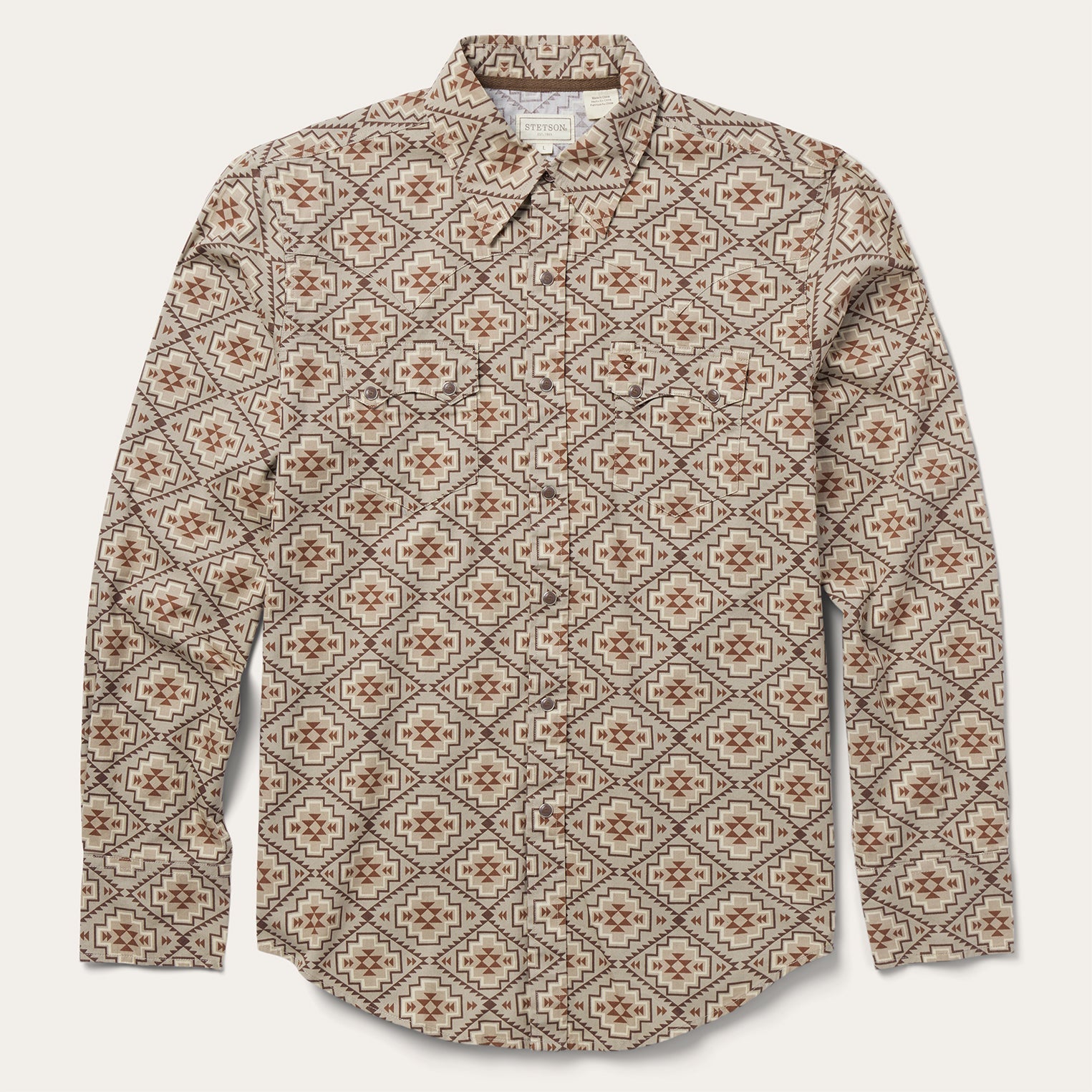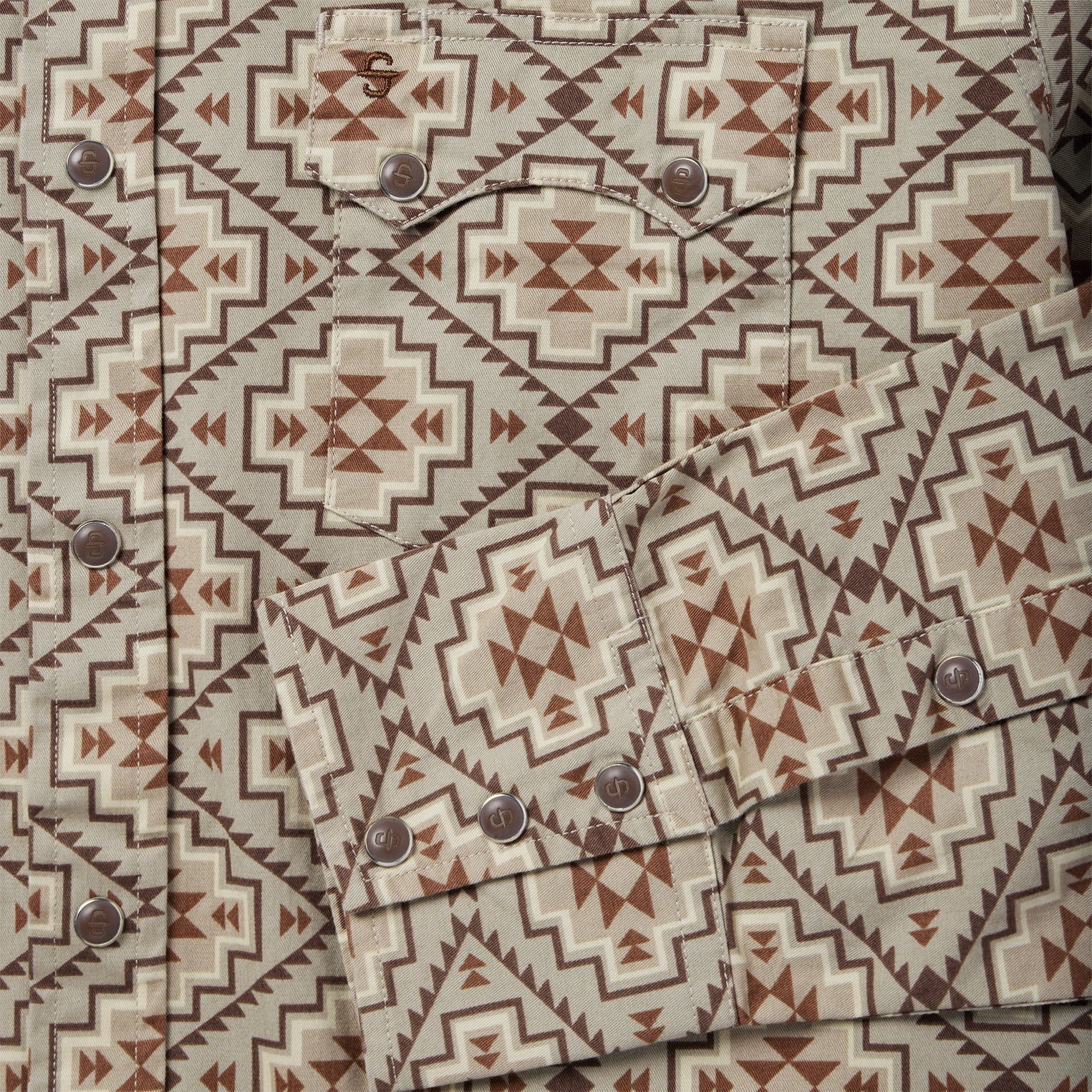 We set the standard for snap fronts. They're not just Western-inspired, they're imbued with a Western spirit. This modern fit shirt is crafted from crisp, breathable 100% cotton poplin that has been yarn-dyed for rich, lasting color and made to get better with age and wear. Featuring our exclusive all-over brown aztec print, it has a two-point curved back yoke, two-point curved pocket flaps, twill tape inside trim, subtle "S" and "It" embroidery at the chest and right sleeve placket, a three-snap cuff and a classic snap front featuring opaque logo snaps.