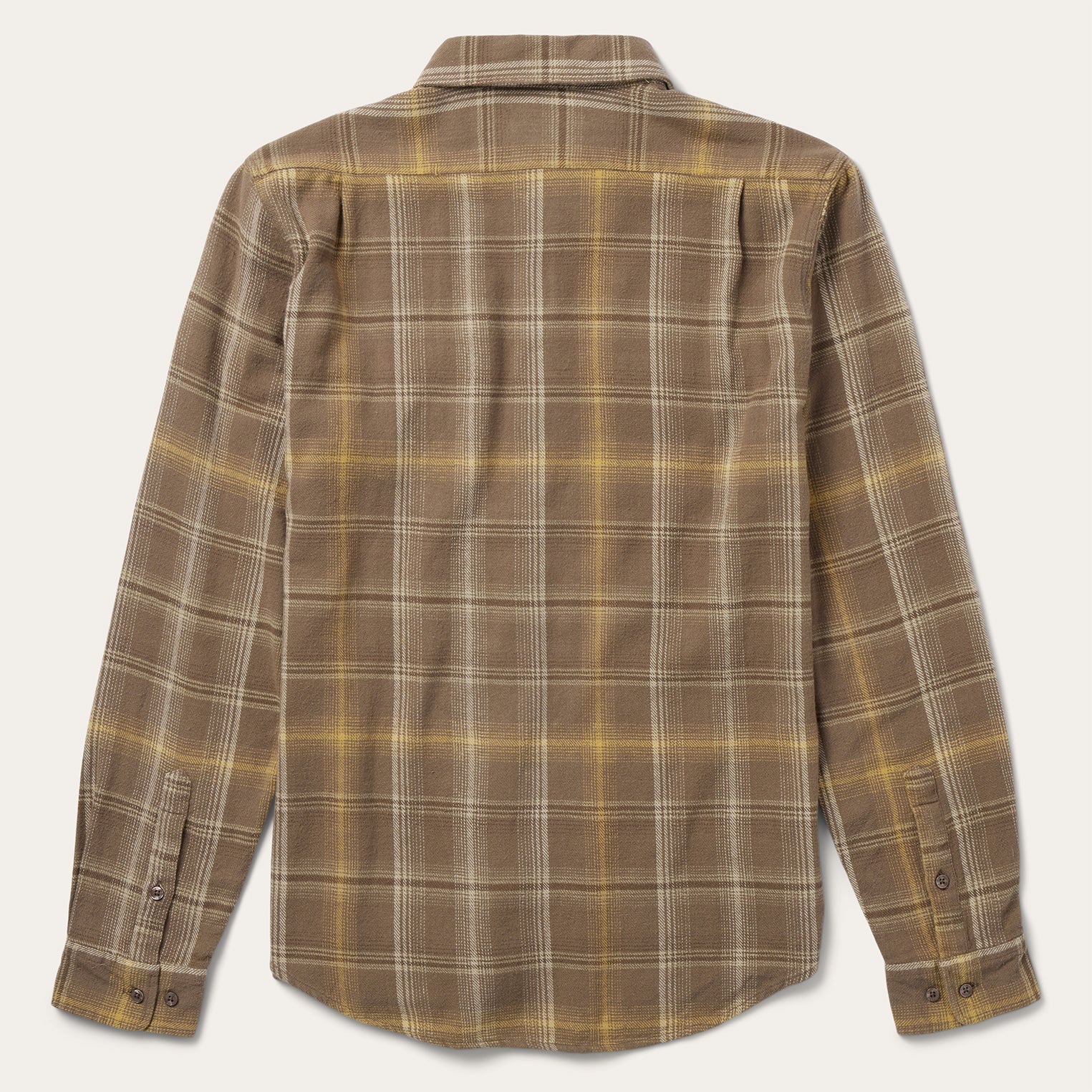 This button-front flannel shirt features an exclusive brown plaid pattern and is crafted from 100% cotton that has been yarn-dyed for rich, lasting color. It has no front yoke, a shallow straight back yoke with pleats, square pockets with flaps and button closures, two-button adjustable cuff, as well as contrast inside denim trim. Cut in our Modern Fit, for a trim, neat appearance that allows for comfort and freedom of movement. Exceedingly durable and always comfortable, our shirts are hard-wearing and built to last.