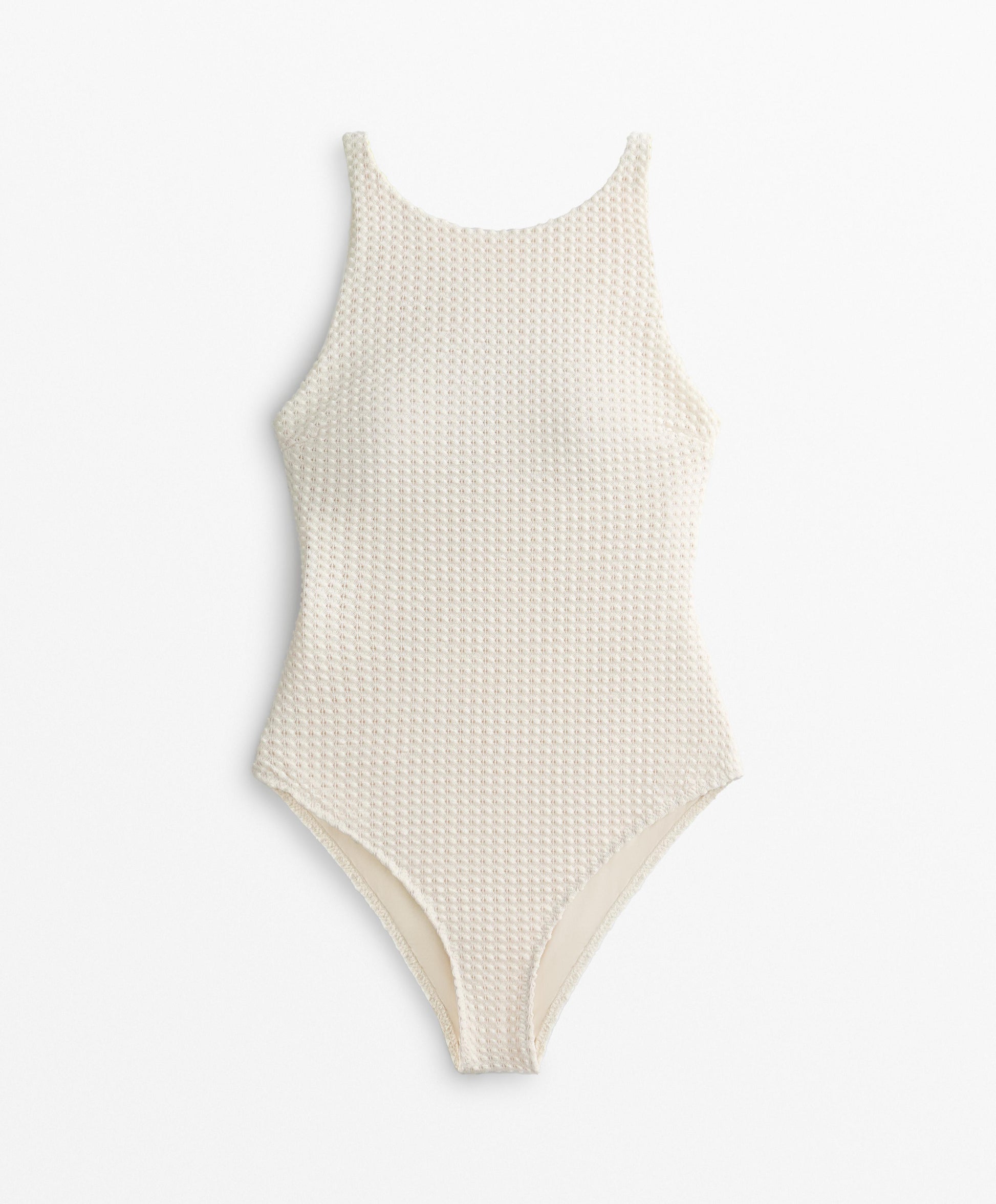 Ref. 2473/730/712 Halterneck swimsuit with open back and tie fastening at the neck with open back. Non-wired with removable cups and medium coverage at the leg. Bubble-texture crochet fabric.Materials and care instructions