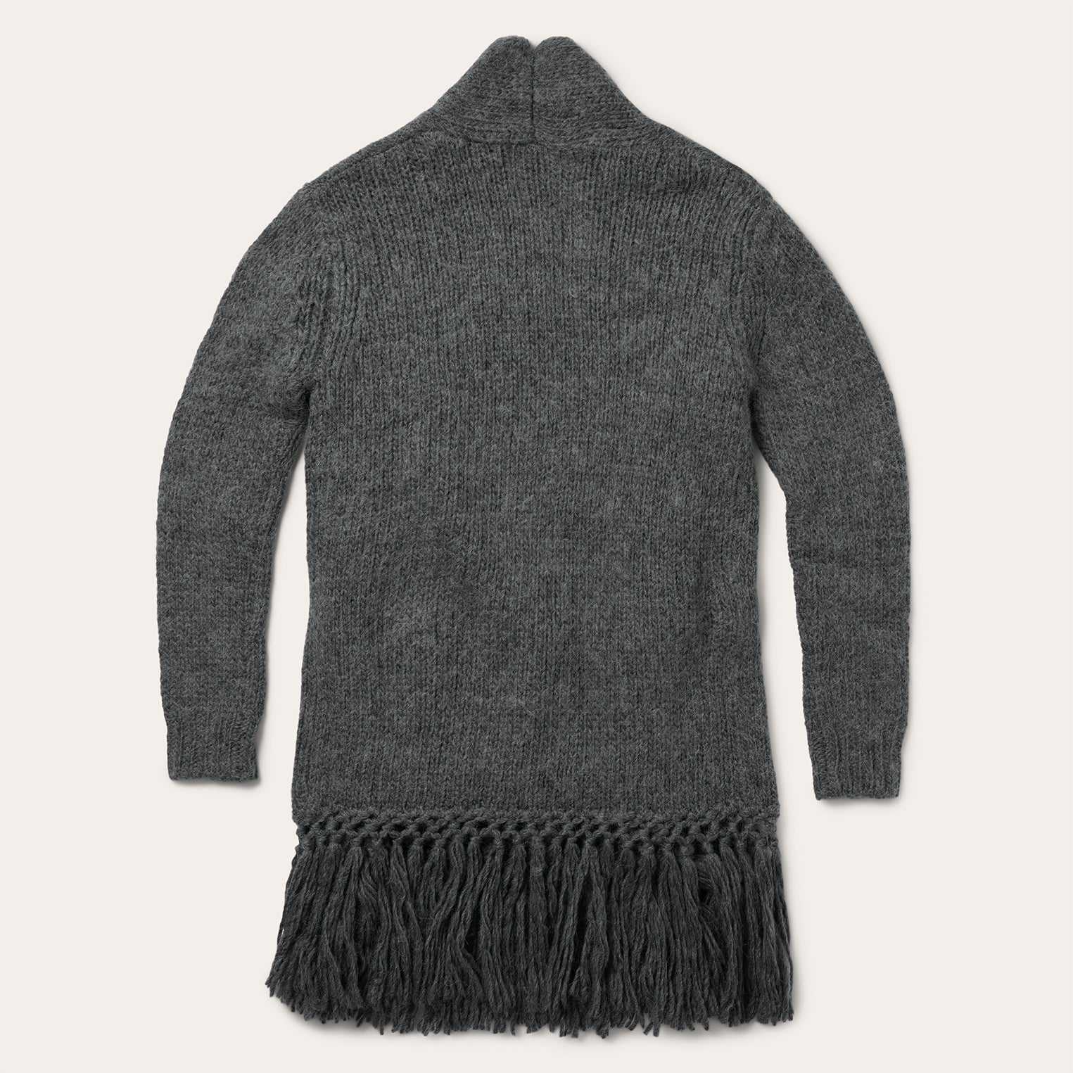 This shawl collar cardigan sweater features drop shoulders and a statement-making fringed hem. Made from a cozy wool blend, it has a flowing drape and an easy, Western-inspired style that pairs perfectly with your favorite jeans.