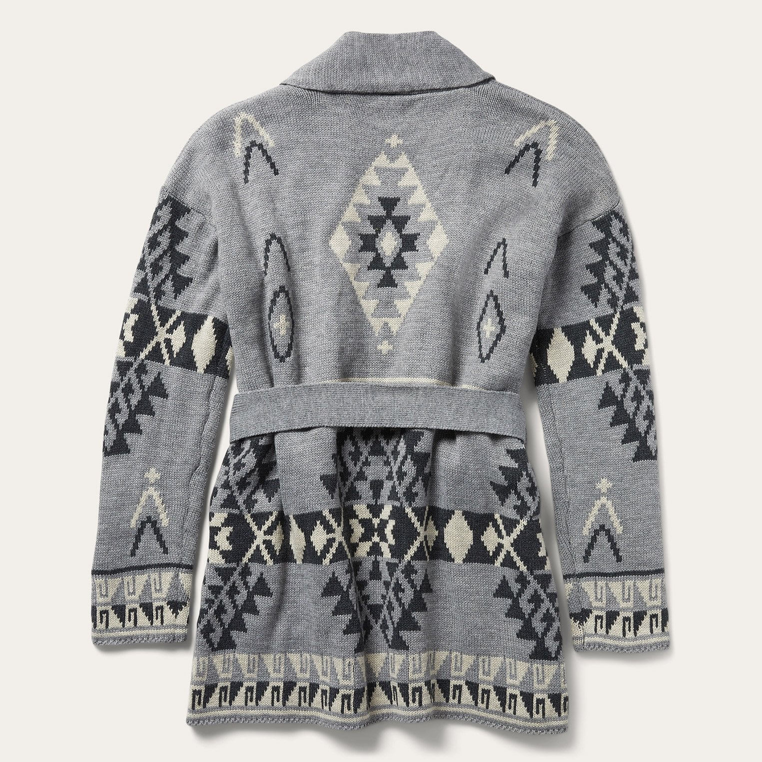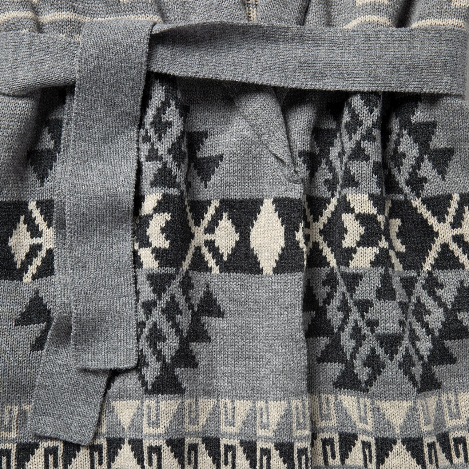 Ultra-plush, this chunky-knit shawl collared southwestern print sweater is dependable for warmth and comfort. Versatile and flattering, this piece can be belted or buttoned over your favorite jeans for a polished winter look.