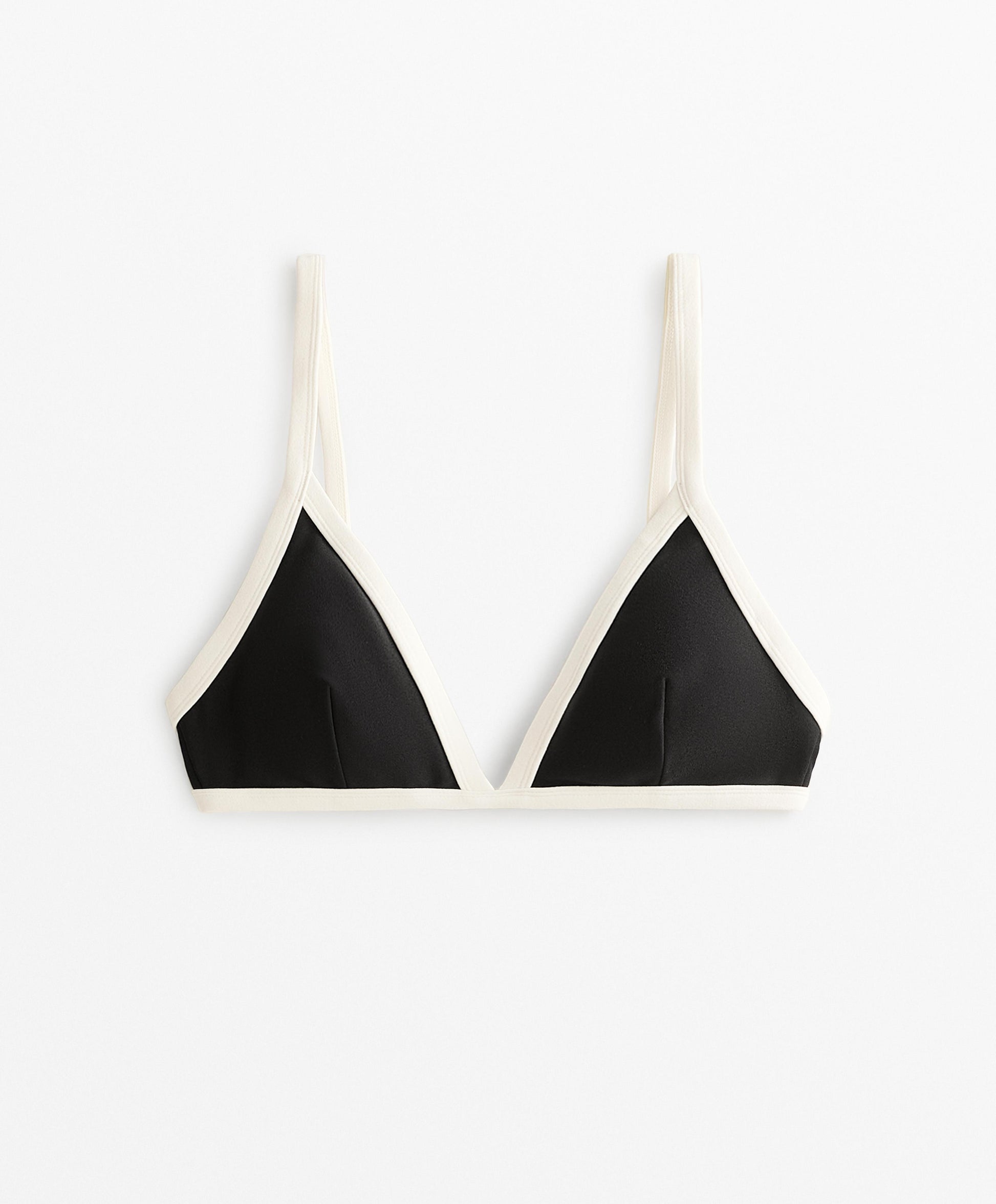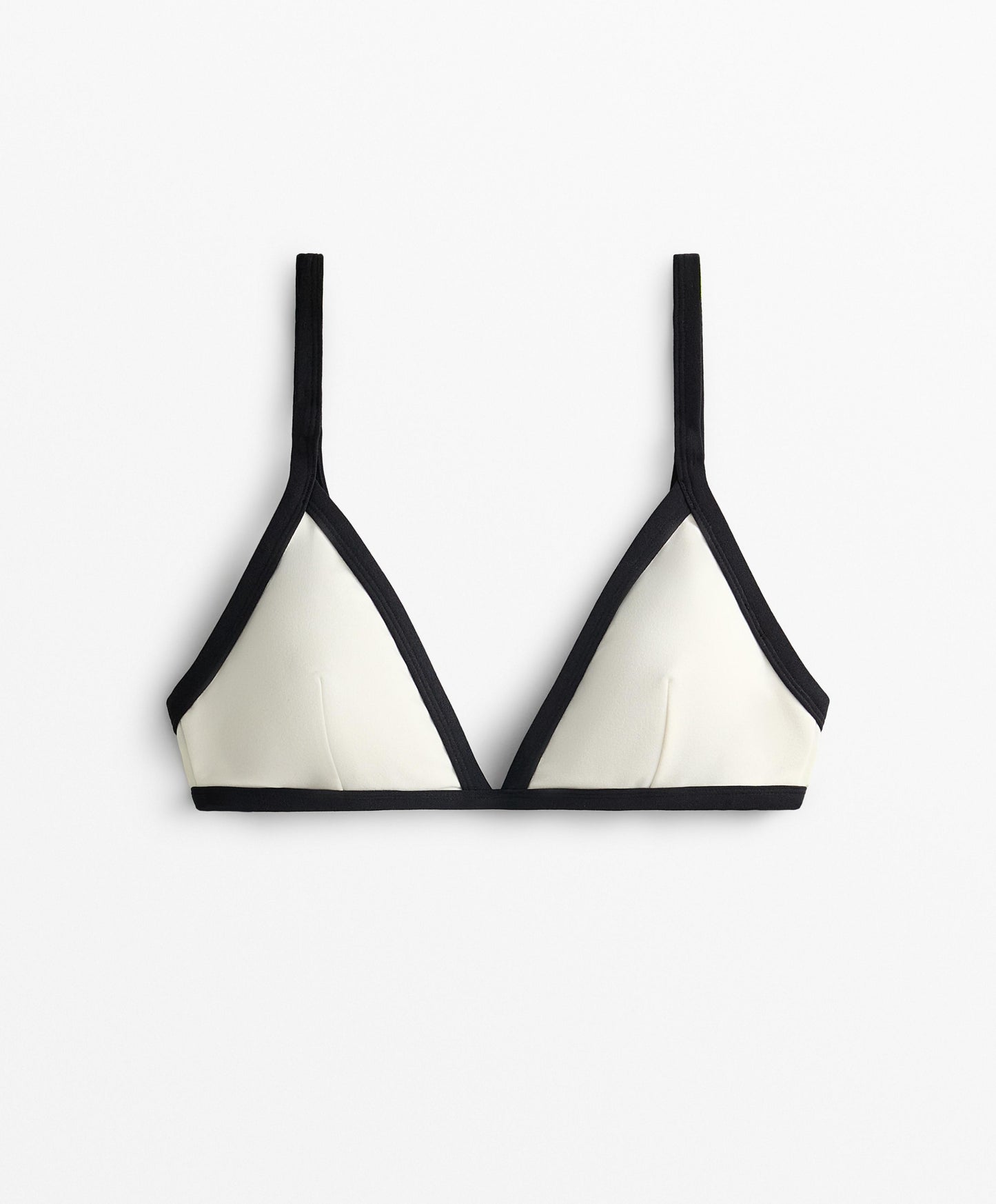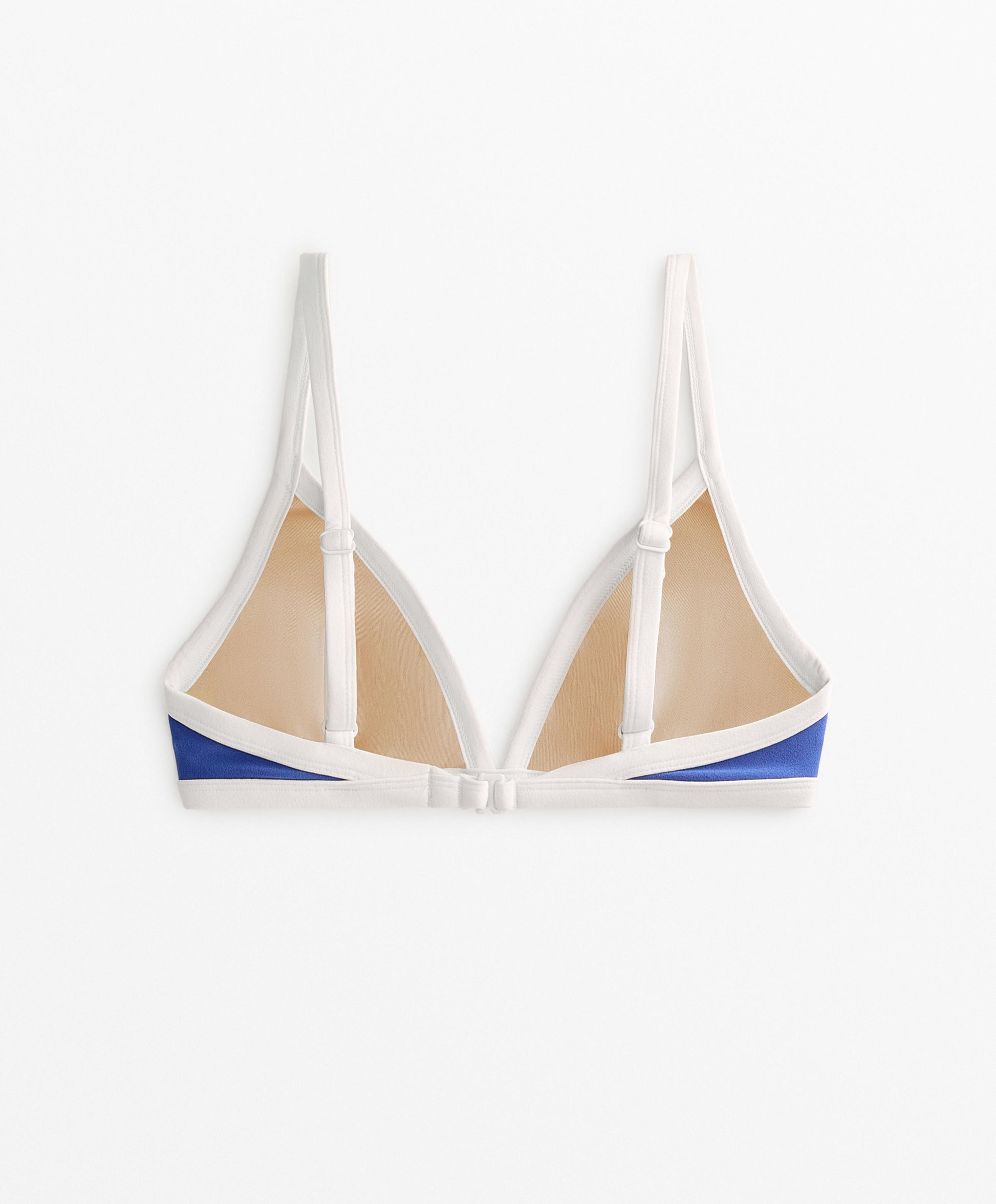 Ref. 0712/121/497 Triangle bikini top with contrast trim. Non-wired with removable cups. Adjustable straps and back fastening.Materials and care instructions