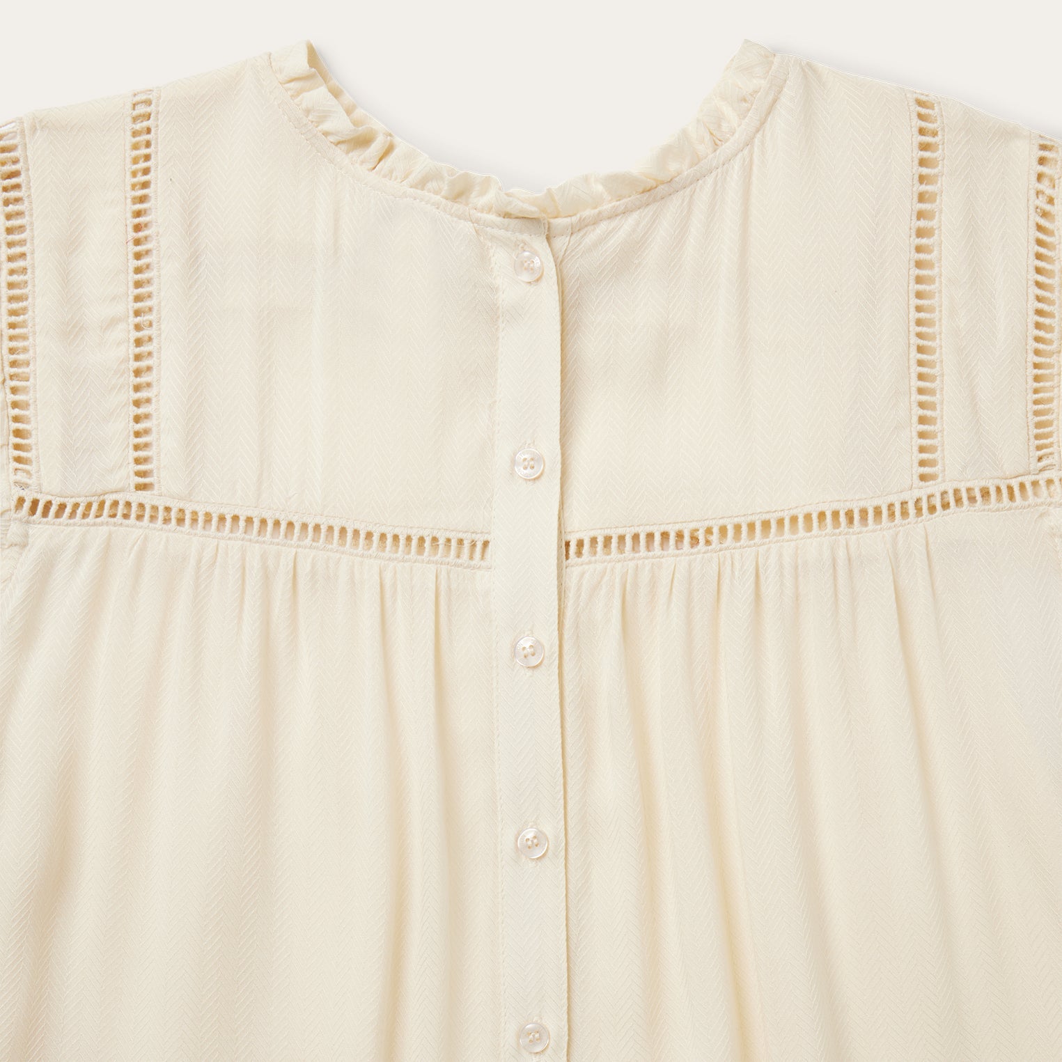 This short-sleeved blouse is crafted from soft, stylish 100% rayon herringbone. It has a full back button placket, flutter cap sleeves, straight front and back yokes with open loop stitching, a swing fit below the yoke and a ruffle at the neck. Cut with an easy, flattering drape, the blouse allows for all-day comfort and freedom of movement.