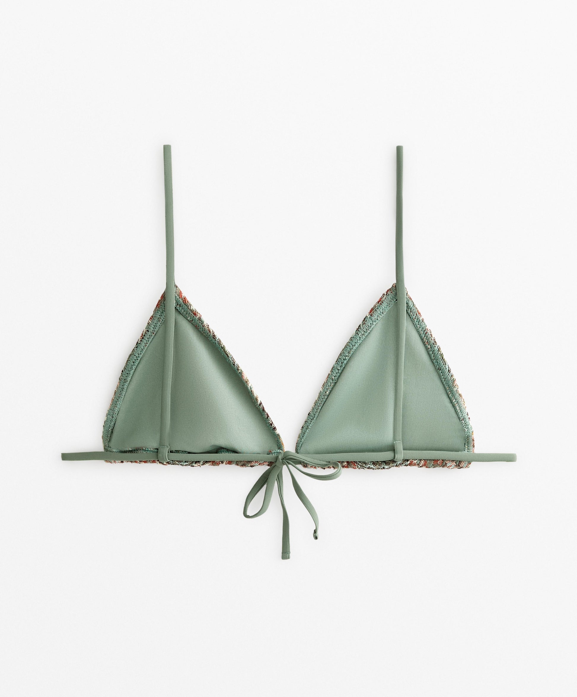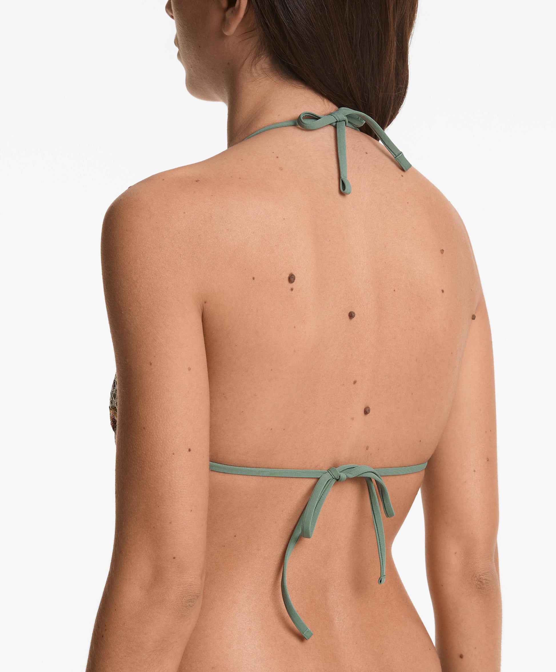 Ref. 0712/394/586 Triangle bikini top with adjustable coverage, non-wired and with removable cups. Thin straps and ties at the back. Crochet fabric.Materials and care instructions