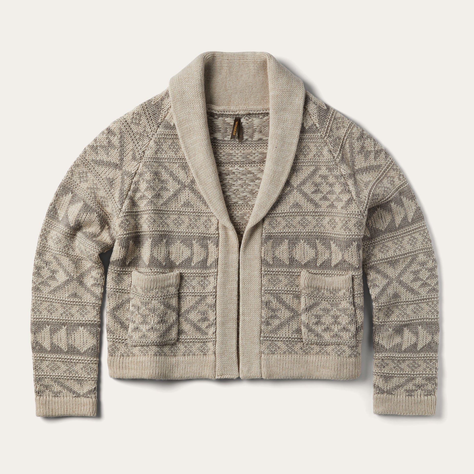 This stylish cropped cardigan features a neutral-toned Aztec-inspired print and is made of a cozy wool blend that's perfect for when temperatures drop. It features ribbing at the shawl collar, cuff and hem, as well as two front patch pockets for added convenience. Easily paired with jeans and boots, it also lends a dash of Southwestern style over any dress.