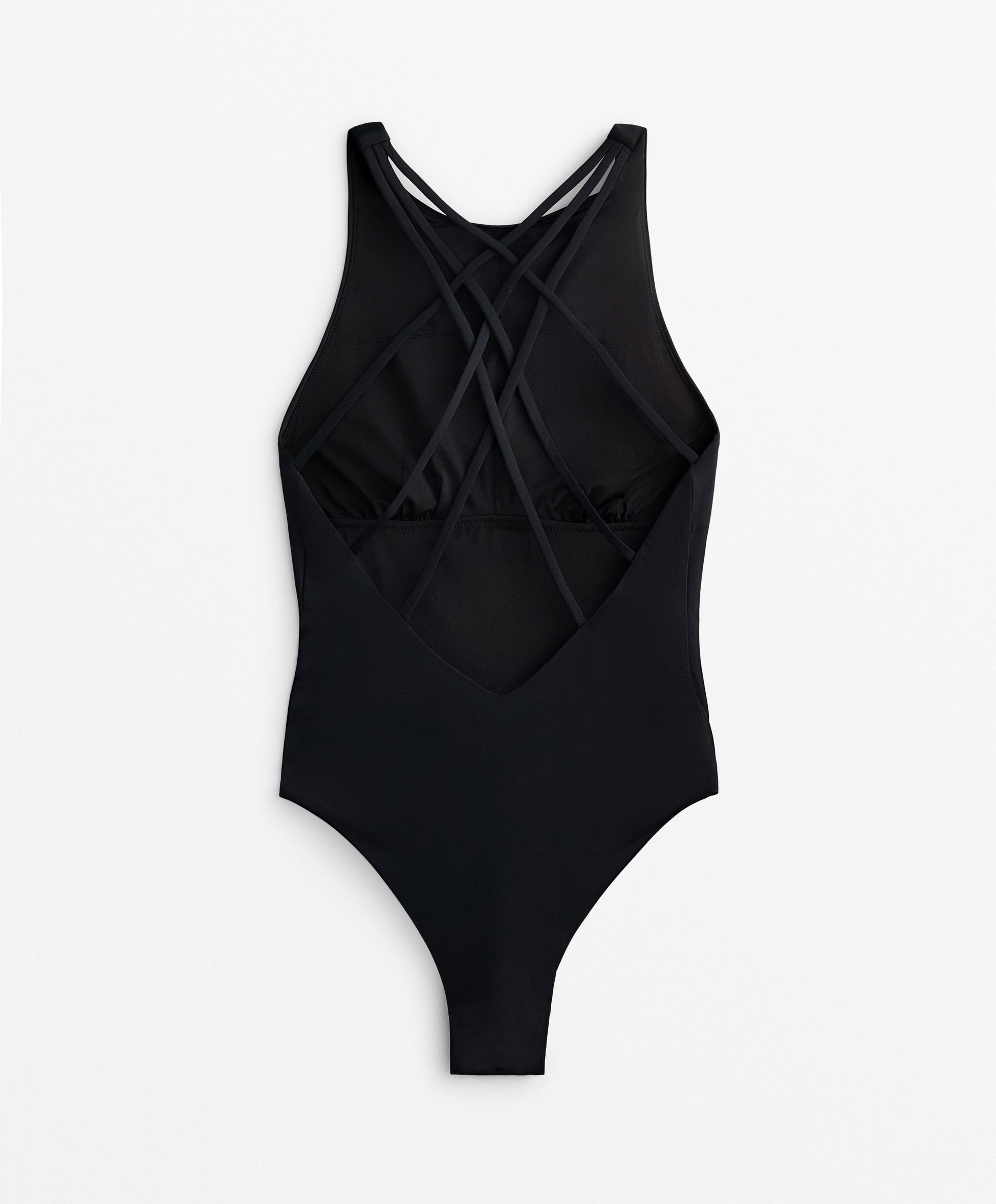 Ref. 2473/303/800 Halterneck swimsuit with open back and non-adjustable crossover straps at the back. Non-wired with removable cups and medium coverage at the leg.Materials and care instructions