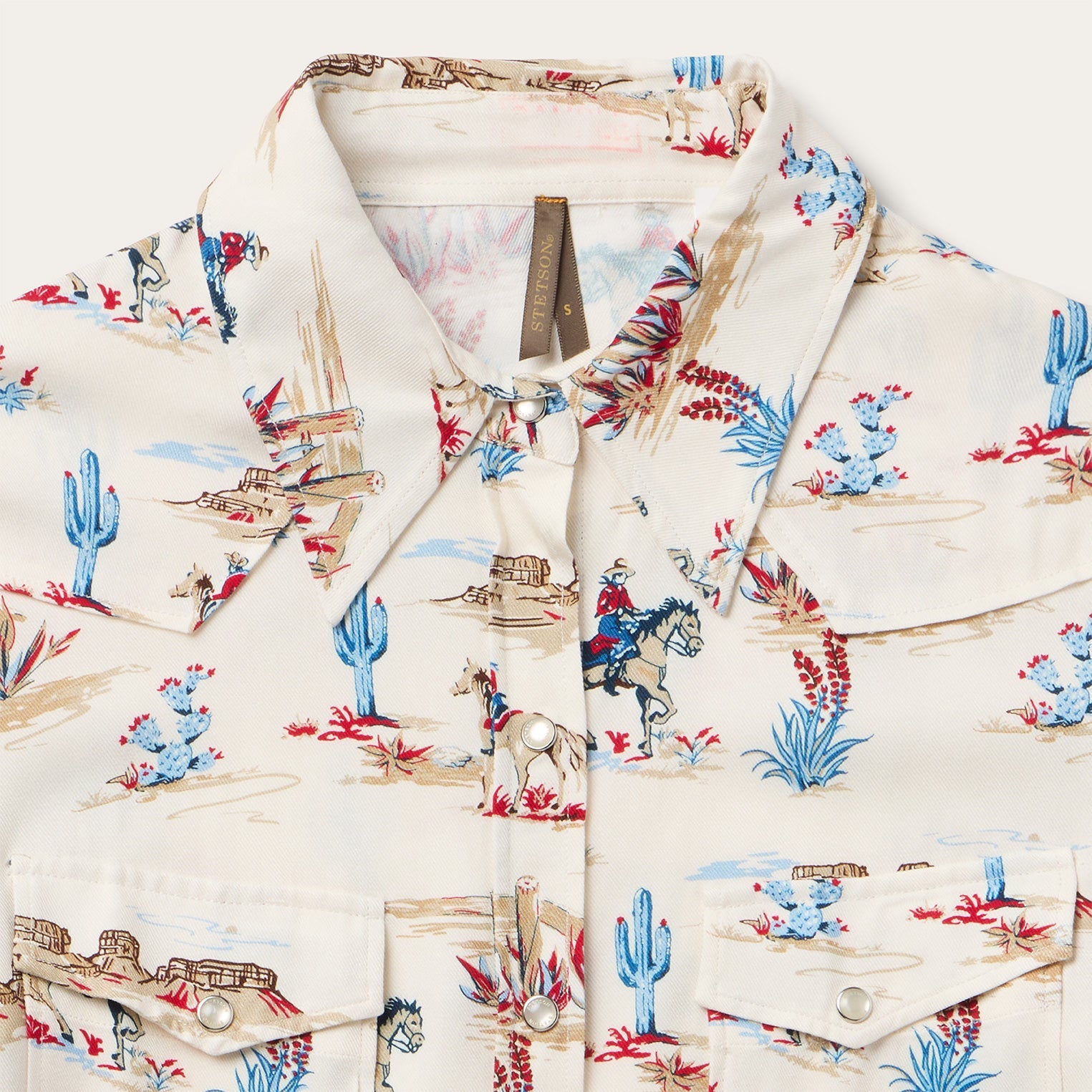 This stylish shirt is crafted from high-quality 100% rayon twill, which has a smooth, silky feel and features our western-inspired Desert Trail print. It has single point front and slightly curved back yokes, offset point chest patch pockets with snap closures, a full snap front and two snap cuffs.Cut with an easy, flattering drape, the dress allows for all-day comfort and freedom of movement.