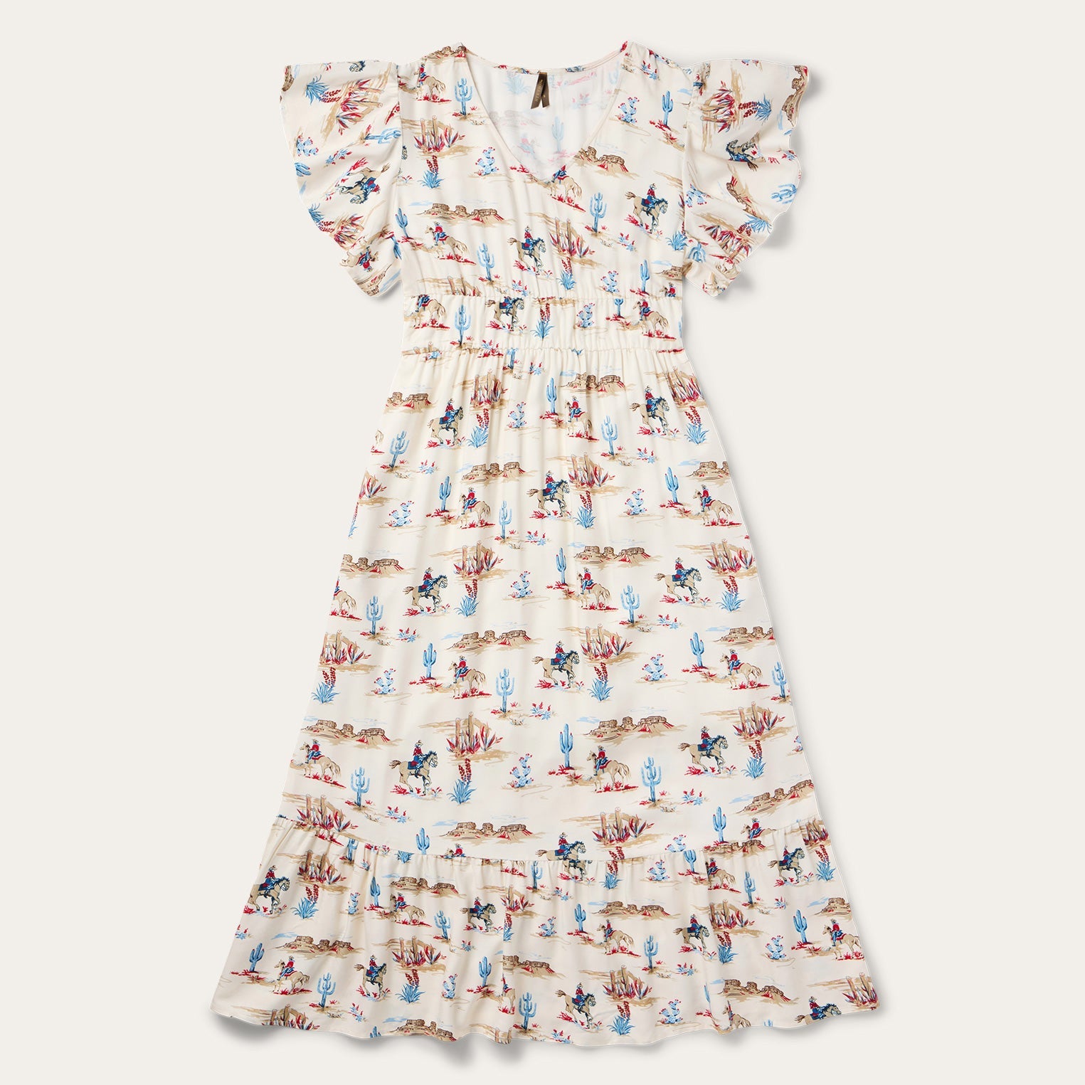 This stylish v-neck prairie dress is crafted from high-quality 100% rayon twill, which has a smooth, silky feel and features our western-inspired Desert Trail print. It has gathers at the shoulders and flutter ruffle short sleeves, two rows of elastic at empire and waits, large ruffle at bottom of hem and side seam pockets. Cut with an easy, flattering drape, that allows for all-day comfort and freedom of movement.