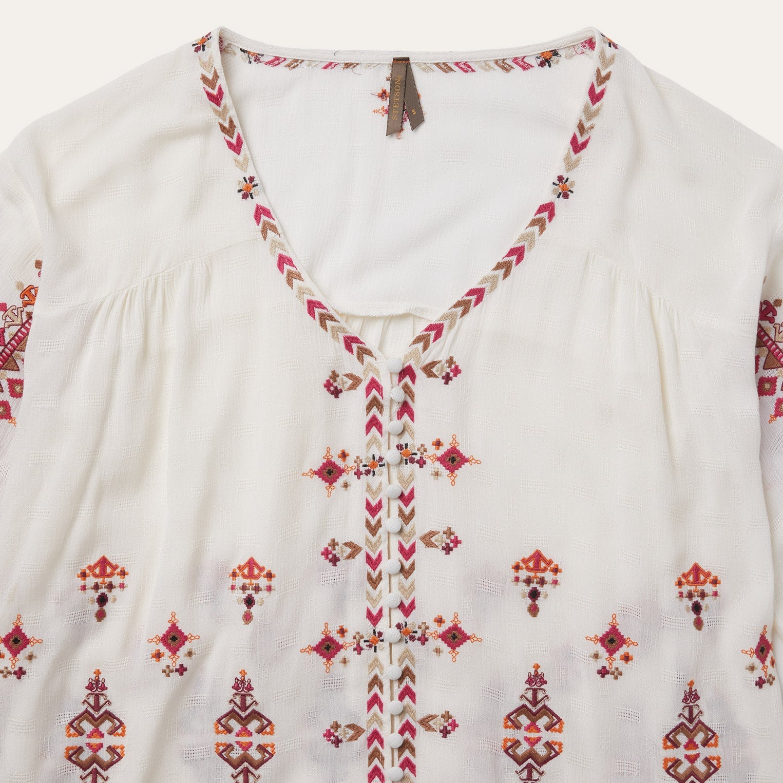 This top offers a soft and flowing silhouette with bohemian embroidered detailing throughout, including subtly hidden buttons at the front. A relaxed choice for brunch, a music festival, or wherever else the season takes you.
