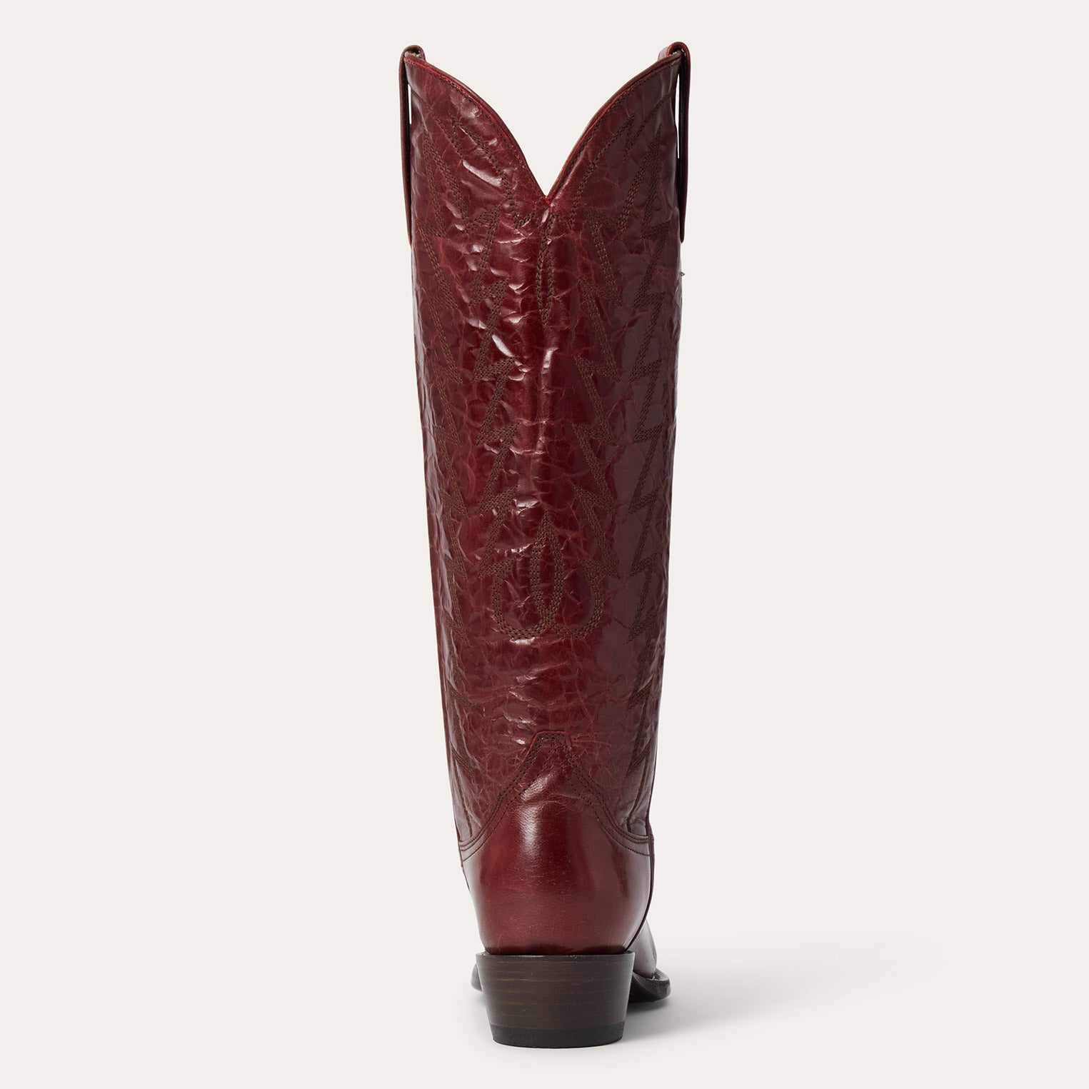A taller western boot with statement-making style, the Dove Boot features a goat leather vamp and 15" shaft embroidered with a distinctive vintage-inspired stitch pattern. It's designed with a snip toe for a refined profile and finished with a hand-stacked leather heel. An all-leather sole, crafted with lemonwood pegs and brass nails, provides a firm foundation, while premium cowhide leather lining ensures comfort in every step.