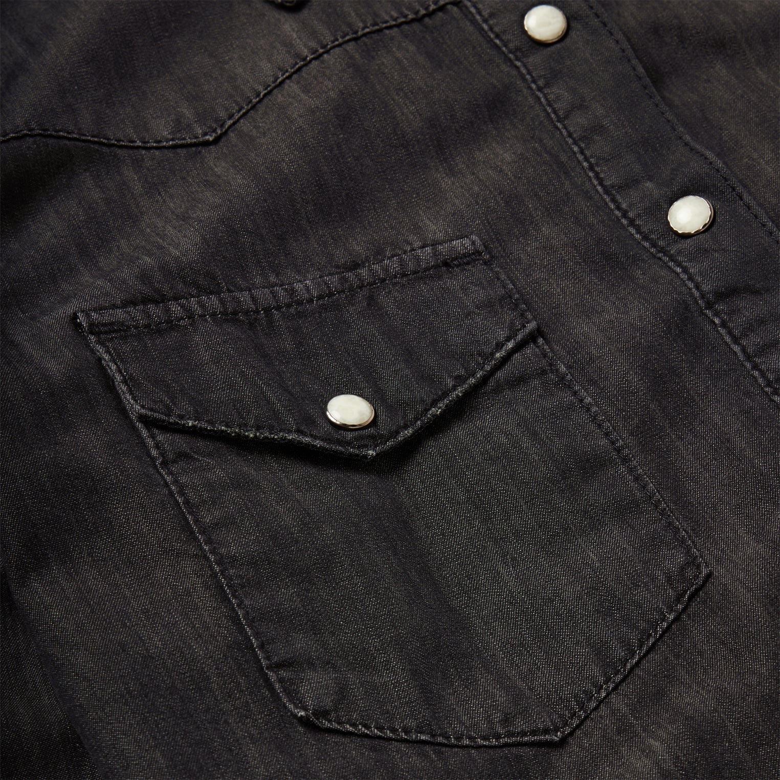 This long sleeve black denim shirt is crafted from 100% cotton that has been garment washed for a soft, comfortable feel that will only get better with time. Featuring a stunning embroidered detail on both sleeves, its Western-inspired style features include curved single point front and back yokes, patch front pockets with flaps and snap closure, three snap cuffs and a classic snap front.