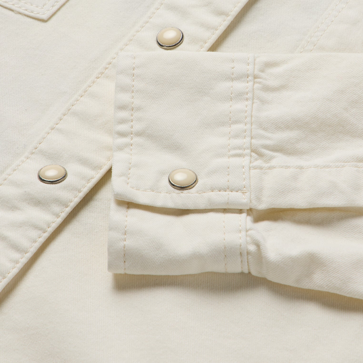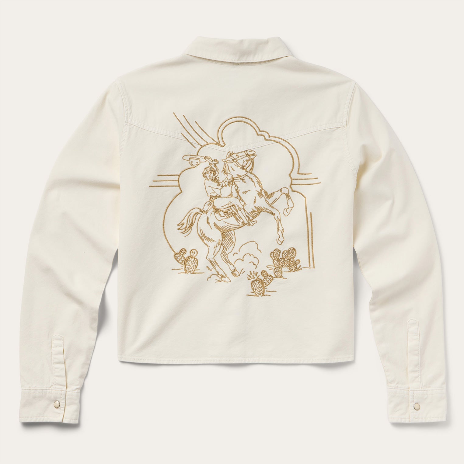 This long-sleeve cream denim shirt makes a statement with its cropped silhouette and large embroidered detail of a bucking cowgirl across its back. Crafted from 100% cotton, it's designed to get more comfortable with. It has a full snap front with fold down collar, single point front patch pockets with pointed detail stitch and a single point back yoke.