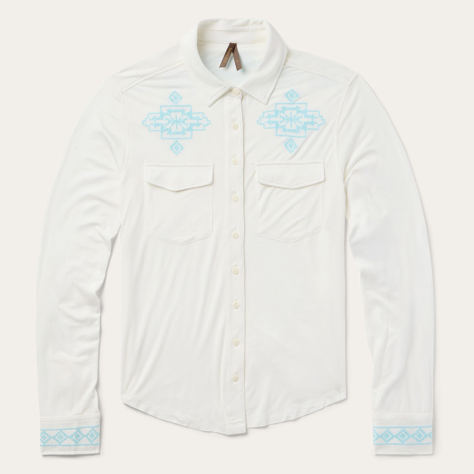 This long-sleeve button-up shirt is made from a soft, comfortable modal/spandex jersey knit and features eye-catching western-inspired embroidery. It has single point patch pockets with flaps, a fold-down collar, single point back yoke and single button cuffs.