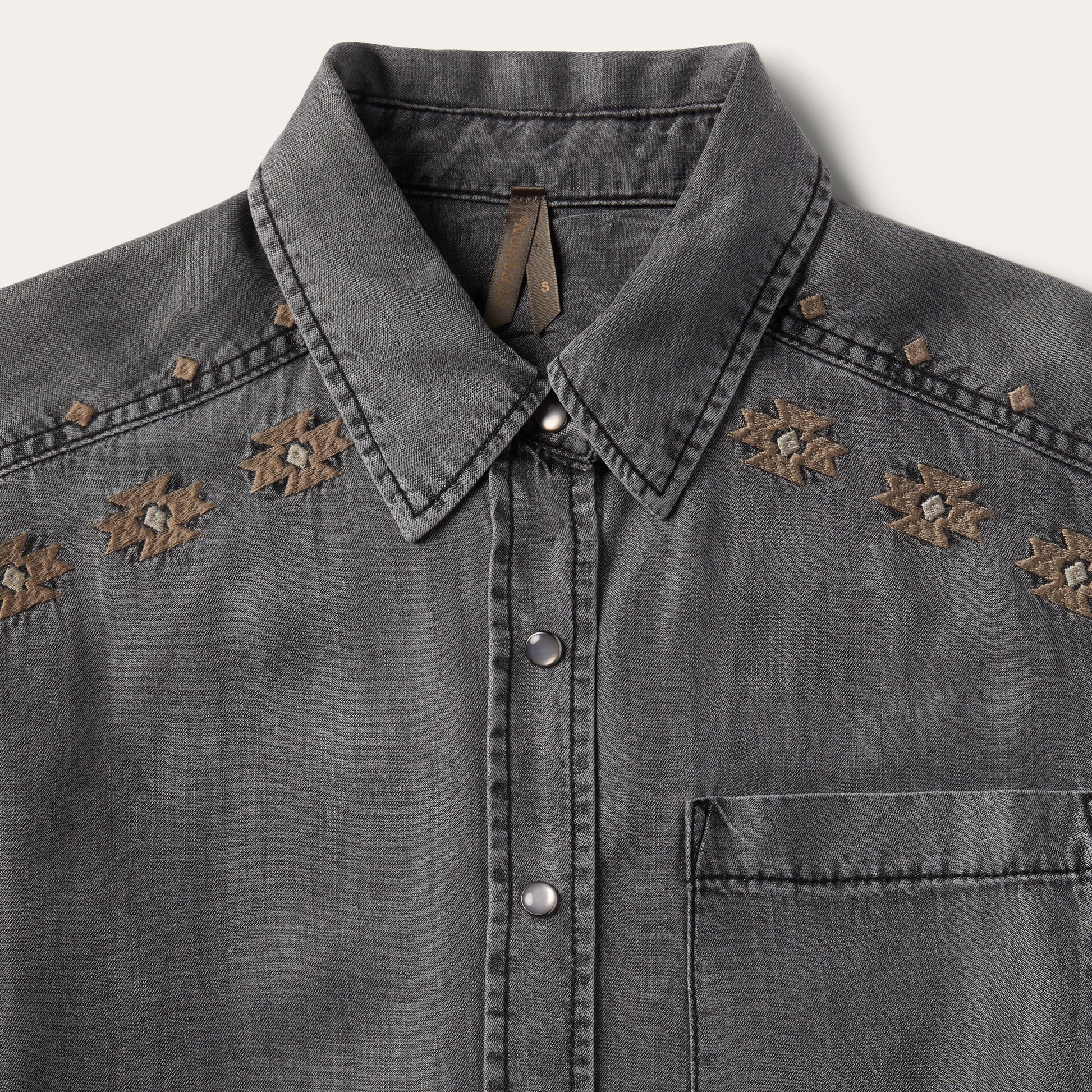 This snap front shirt dress features stunning Western-inspired embroidery and has a versatile style that can be worn on it's own or over jeans and your favorite t-shirt. Made of 100% Lyocell, a breathable, moisture-wicking, sustainable fiber, the black washed denim has a comfortable, broken-in feel and an easy drape. It has a fold colla, drop shoulders, a straight back yoke, a single point left chest pocket, single snap cuffs and a self tie at the wait.