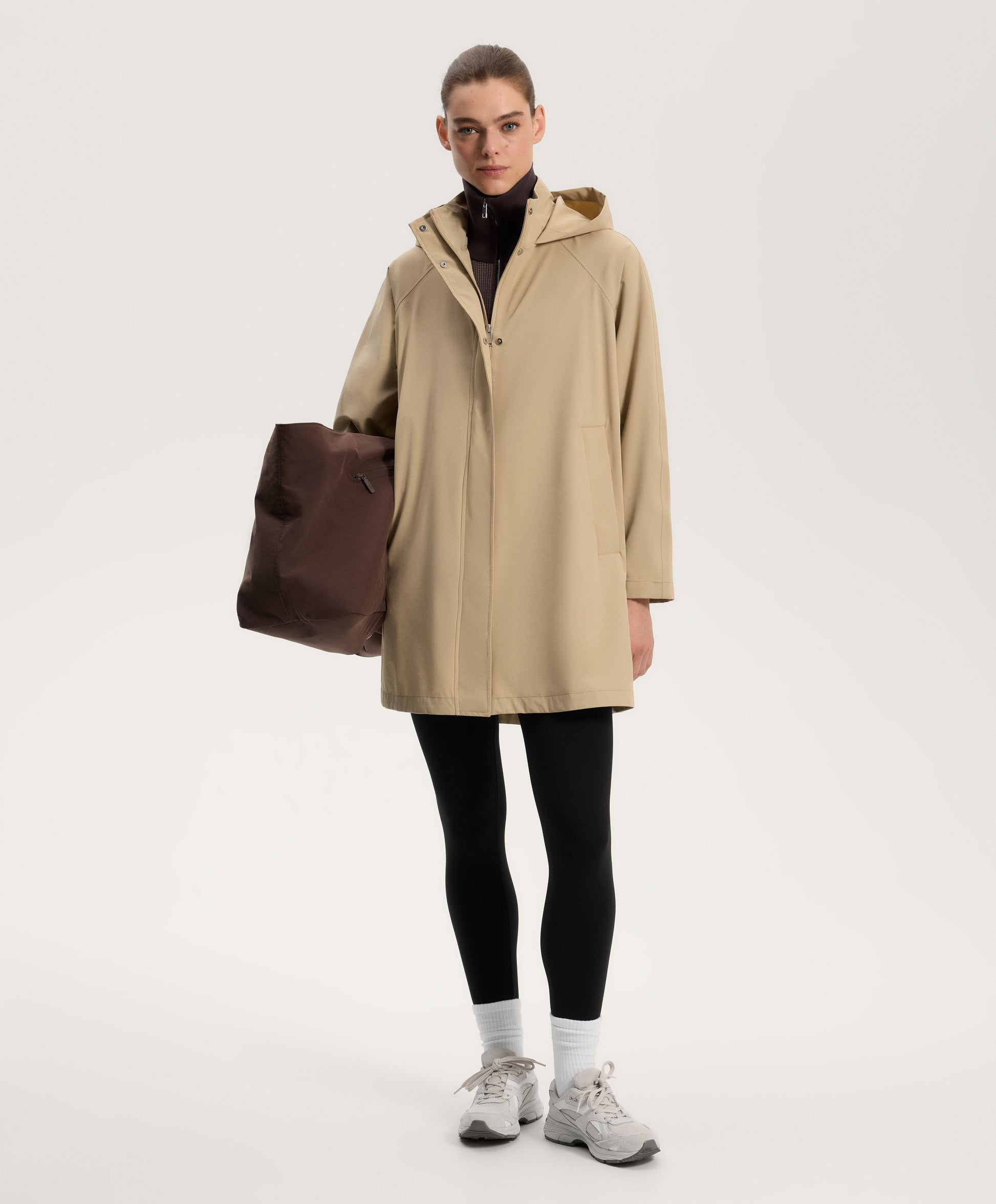 Ref. 3034/945/756 Midi waterproof jacket with high neck and hood. Front fastening with two-way zip and buttons. Cape detail and central pleat at the back. Side pockets with button fastening. Breathable, windproof fabric with heat-sealed seams. Heat-sealed zips to increase waterproofing. Magnetic button fastening.The fabric can withstand water penetration of ¡Ý10k (10,000 mm of pressurised water penetration). The garment is made with sealed (critical or complete) seams and airtight zips for greater waterproofing.