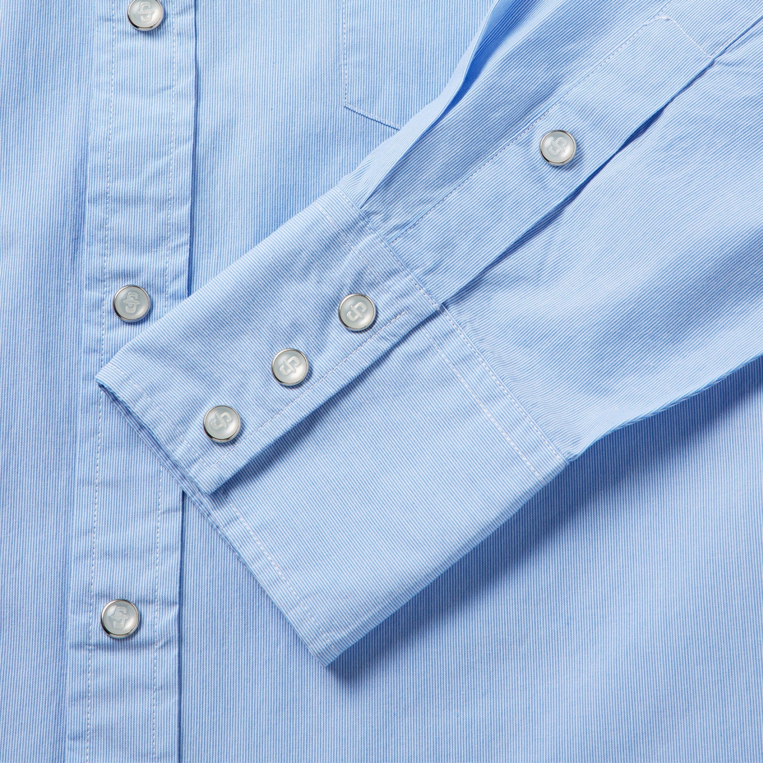 This western shirt is crafted from high-quality 100% cotton and features an exclusive fine line stripe pattern. It has a one point curved front yoke, one point ultra-deep curved back yoke, shaped pockets with one point curved flaps, classic snap front with logo snaps, and three snap cuffs, along with embroidered logo details. It's cut in our Tailored Fit, a versatile style that's slightly tapered at the sides for a streamlined appearance and a shorter length designed to look great tucked or untucked.