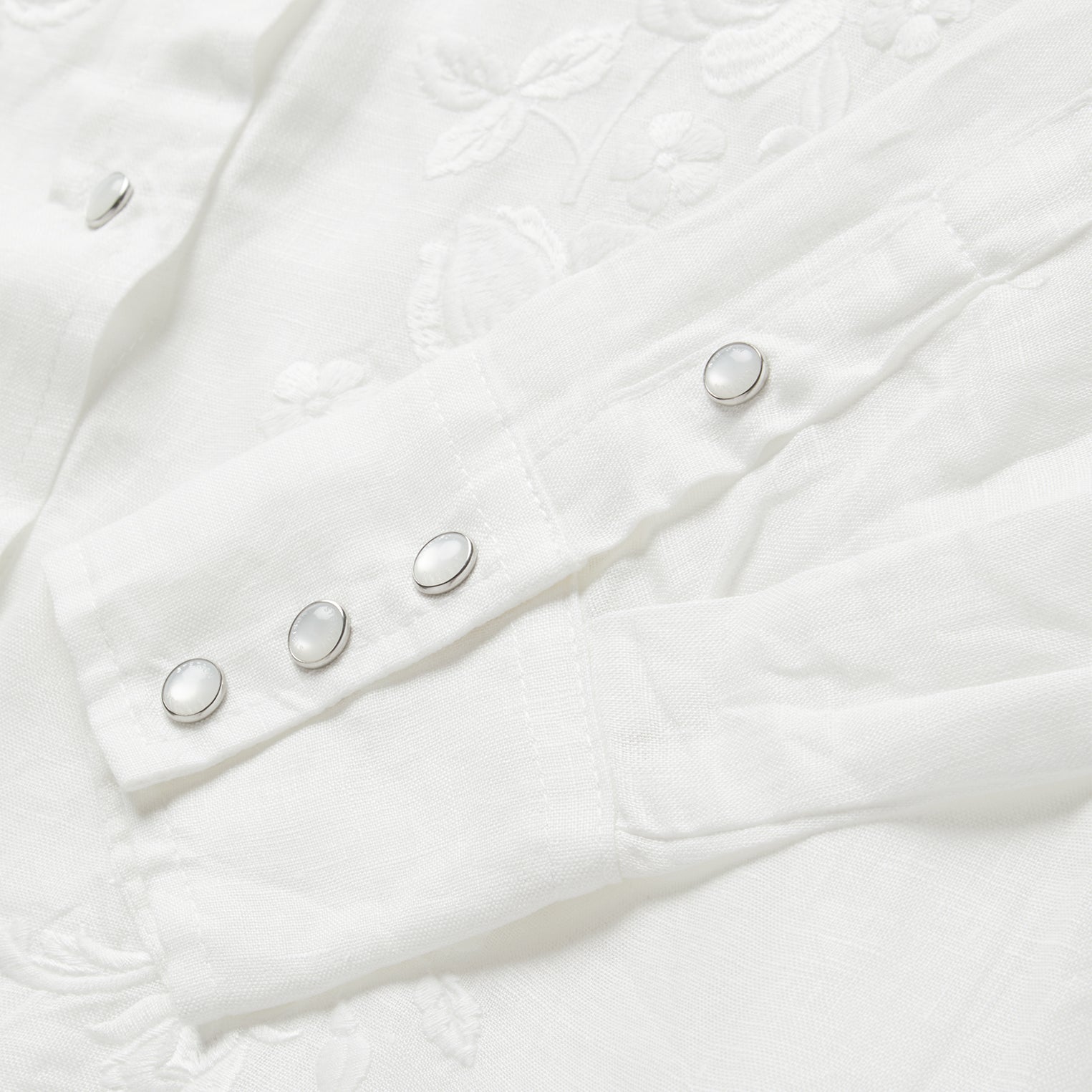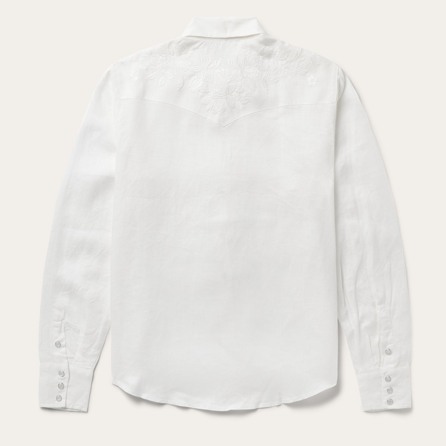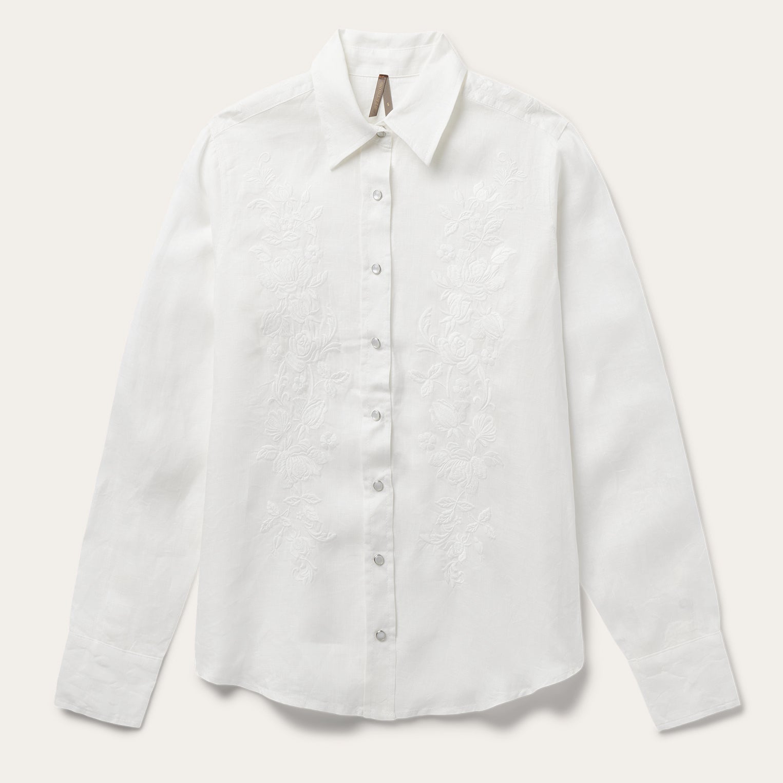This beautiful white linen shirt is crafted from crisp, cool 100% linen and features an intricate tonal embroidered floral detail that enhances its classic Western-inspired style. The contemporary silhouette features a dropped shoulder and straight back yoke with pleat and it's finished with single button cuffs and a curved hem. Lightweight and breathable, this blouse has an easy elegance that's perfect for warm-weather everyday wear.