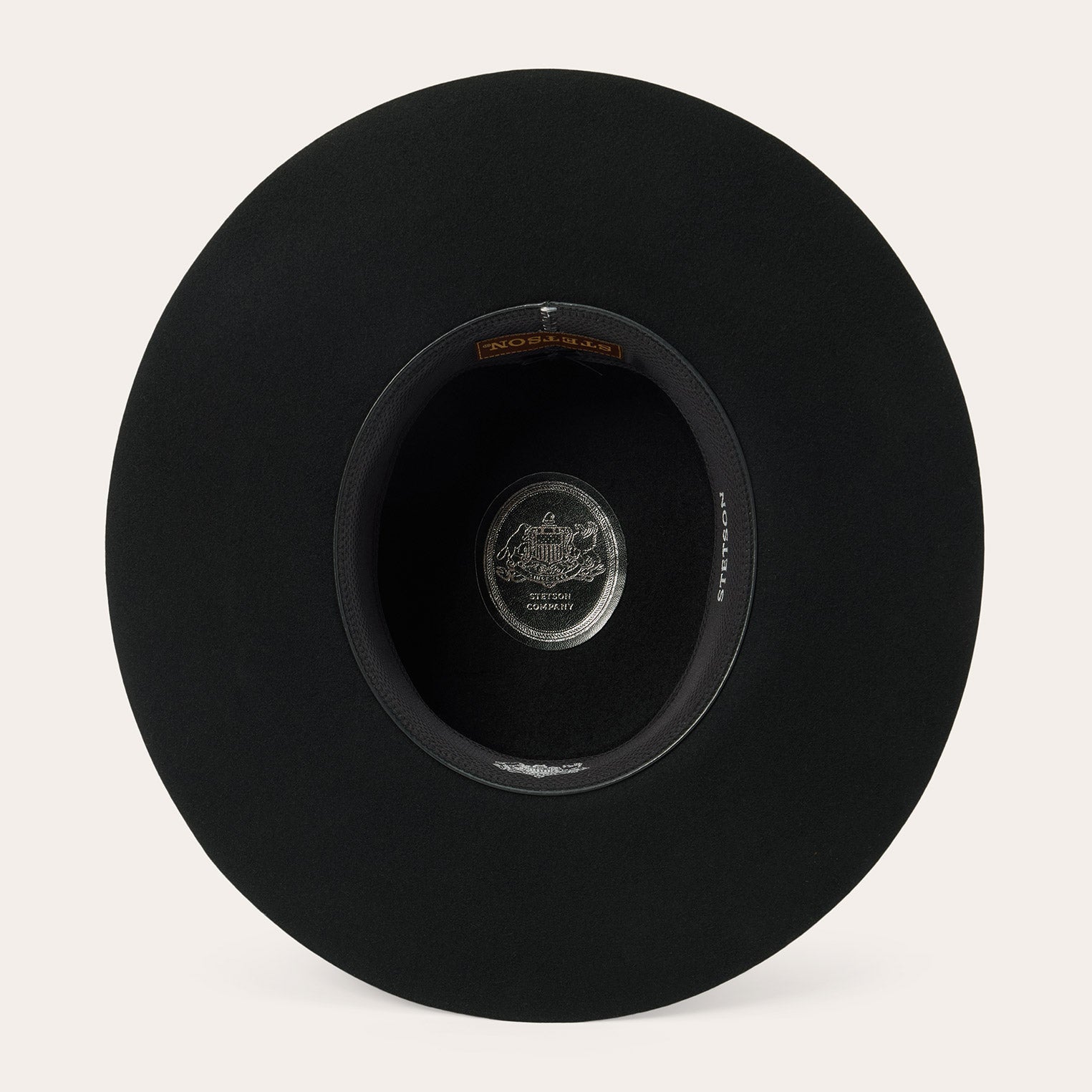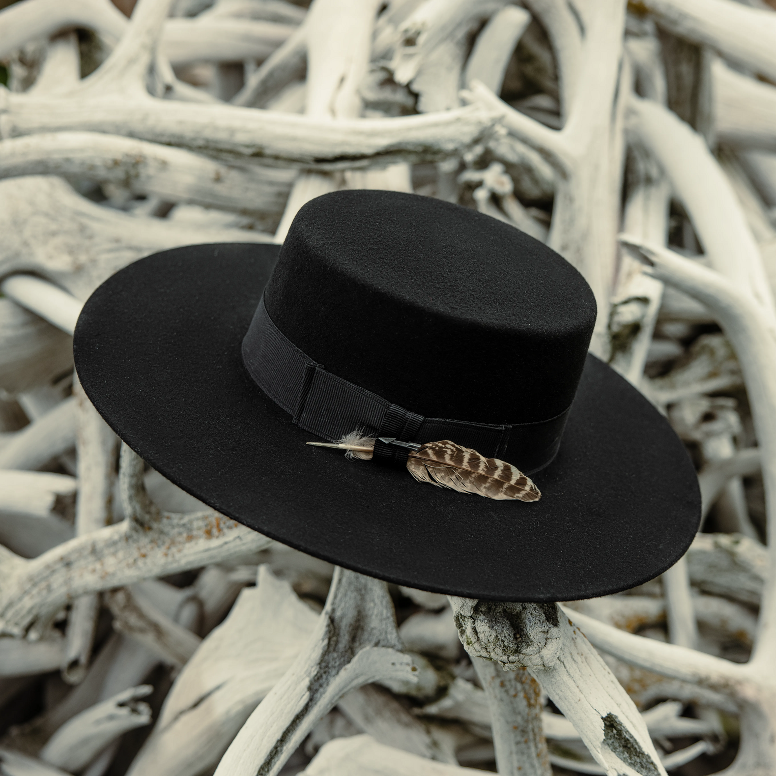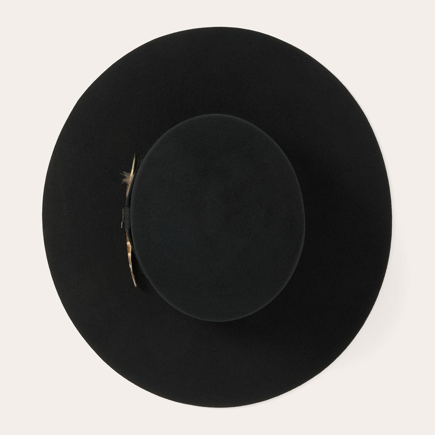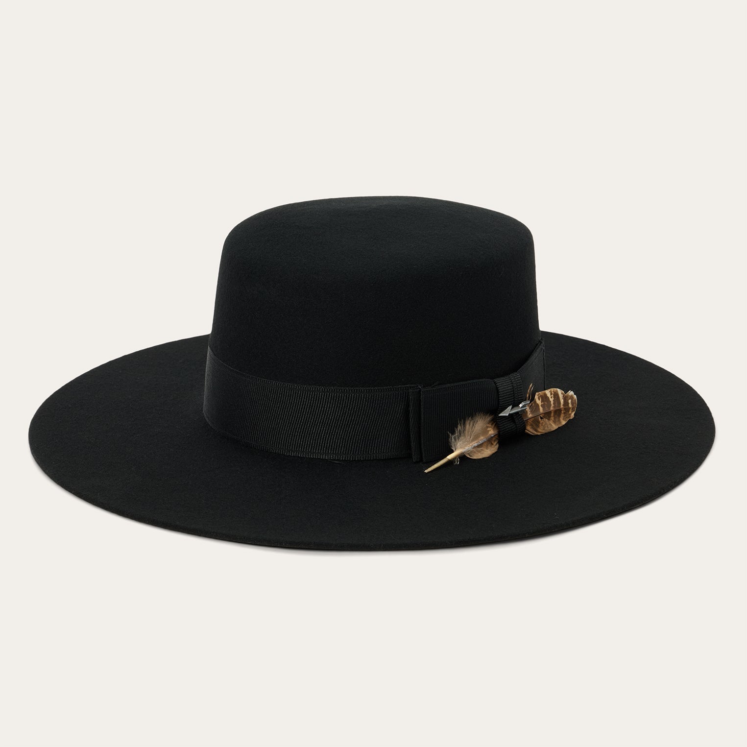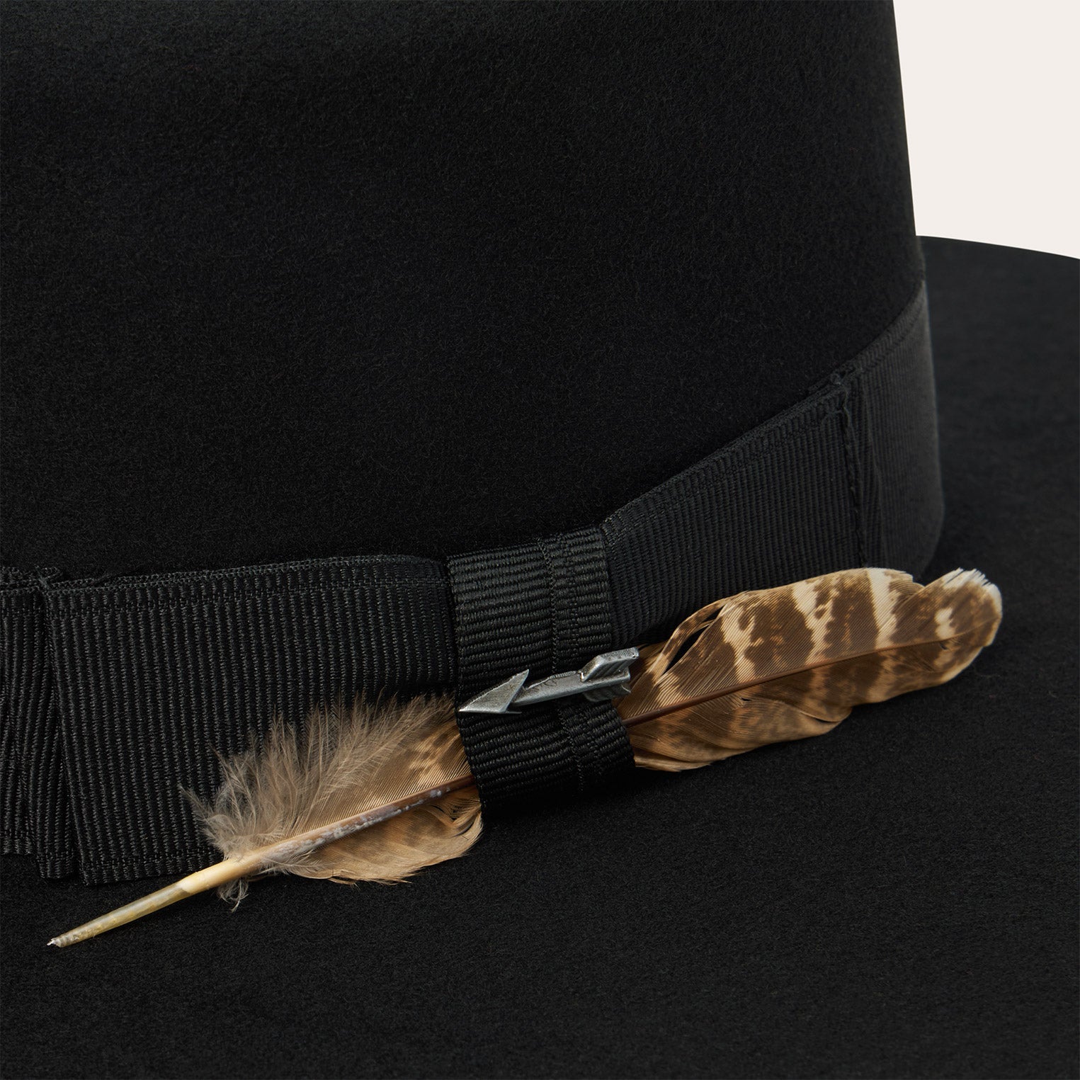 This western-inspired fashion hat makes a statement with its bold silhouette and bohemian style details. It has a 4 1/4" flat open crown, 3 1/2" flat brim, grosgrain band, silver-tone arrow hat pin and removable feather detail. Handmade in the U.S.A. with a firm finish from high-quality wool felt, it's unlined and finished with a cloth sweatband for all-day comfort.