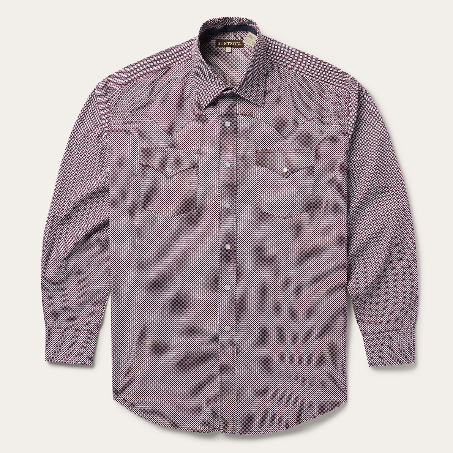 This Western shirt is crafted from a lightweight cotton poplin with an allover Blue Four Point Geo print. It features a one-point curved back yoke, snap front featuring logo pearl snaps, and three snap cuffs. The front left pocket is adorned with the It "S" logo and the right sleeve placket is embossed with "It". It has a denim inside trim and is crafted with 100% cotton for quality, breathability and a soft feel that will only get better with age.