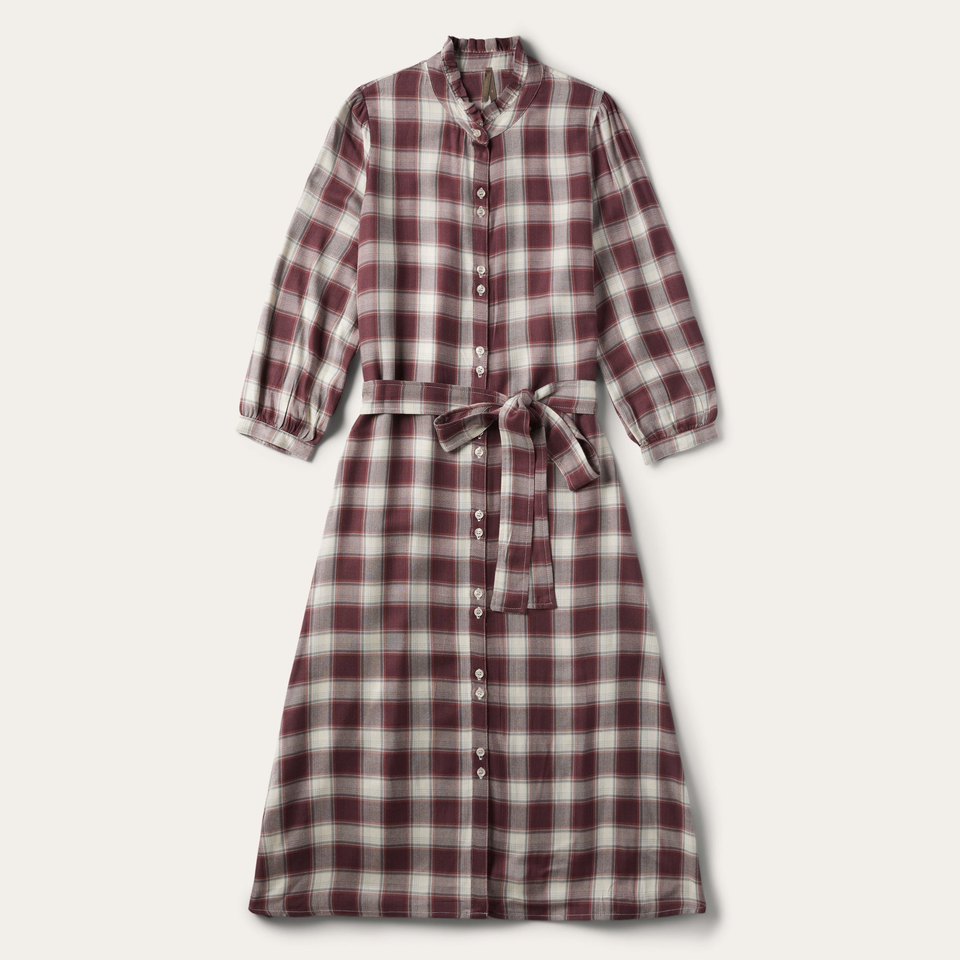Striking and unique, this belted shirt dress boasts a versatile style that can be worn on it's own as a dress or over jeans and your favorite t-shirt. Its Western-inspired Gaucho Plaid print recalls some of our rugged flannel shirts, but it's crafted in a silky, yarn-dyed 100% rayon fabric for a soft, smooth feel and easy drape. It has a ruffled stand collar and full front button placket, cuffed 3/4 length ruffled sleeves with button closure, a straight back yoke with gathers, a self-tie belt with thread belt loops and two side seam pockets.
