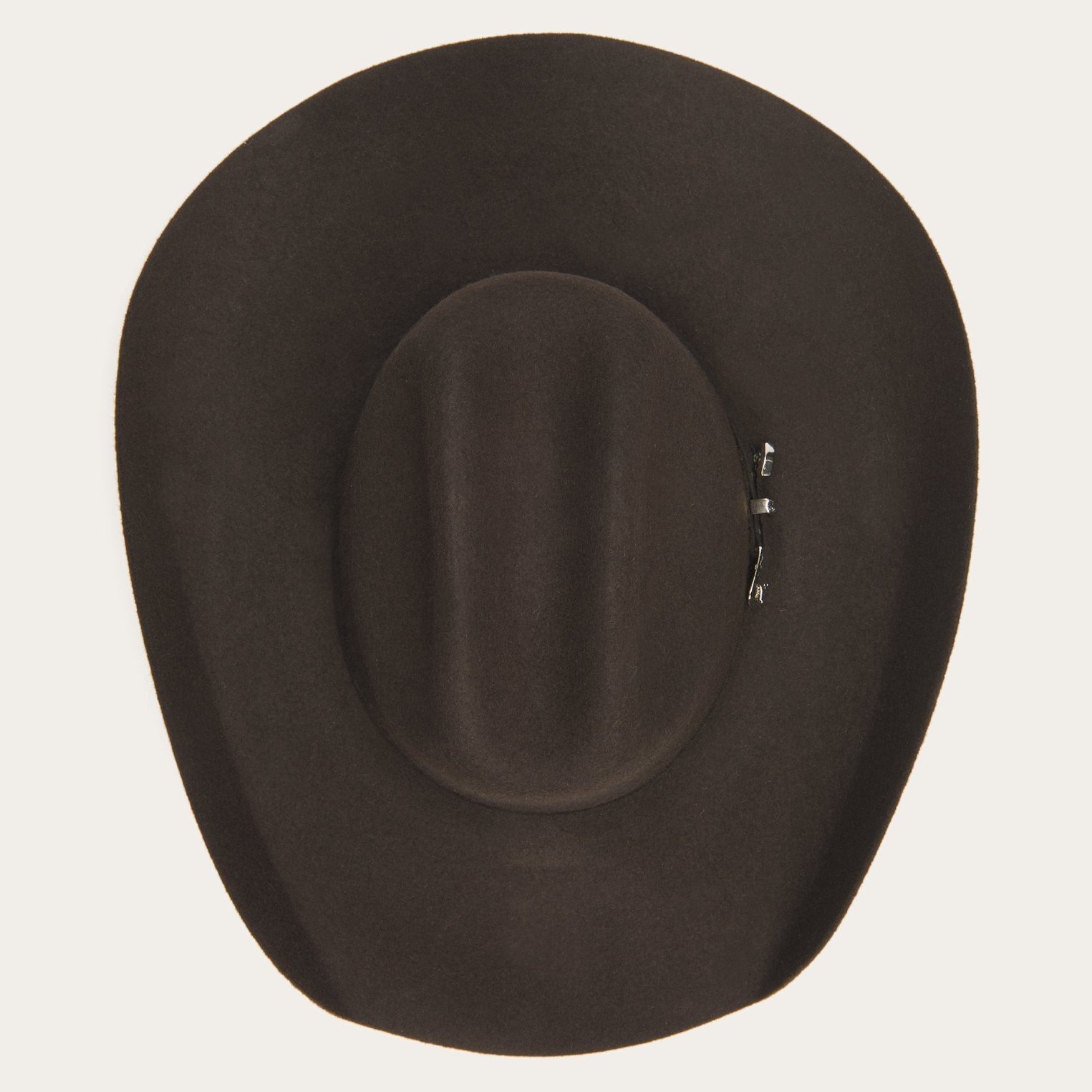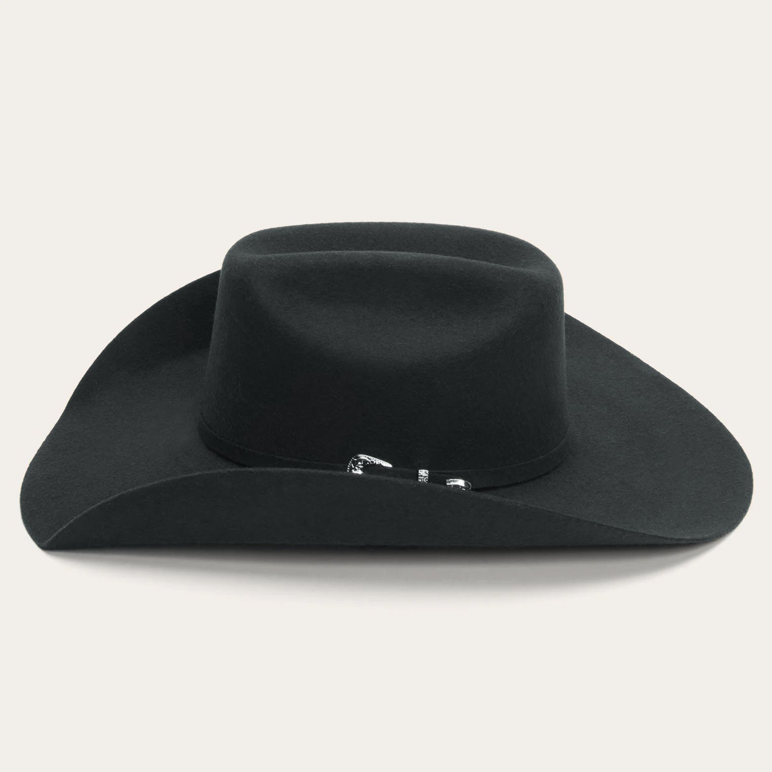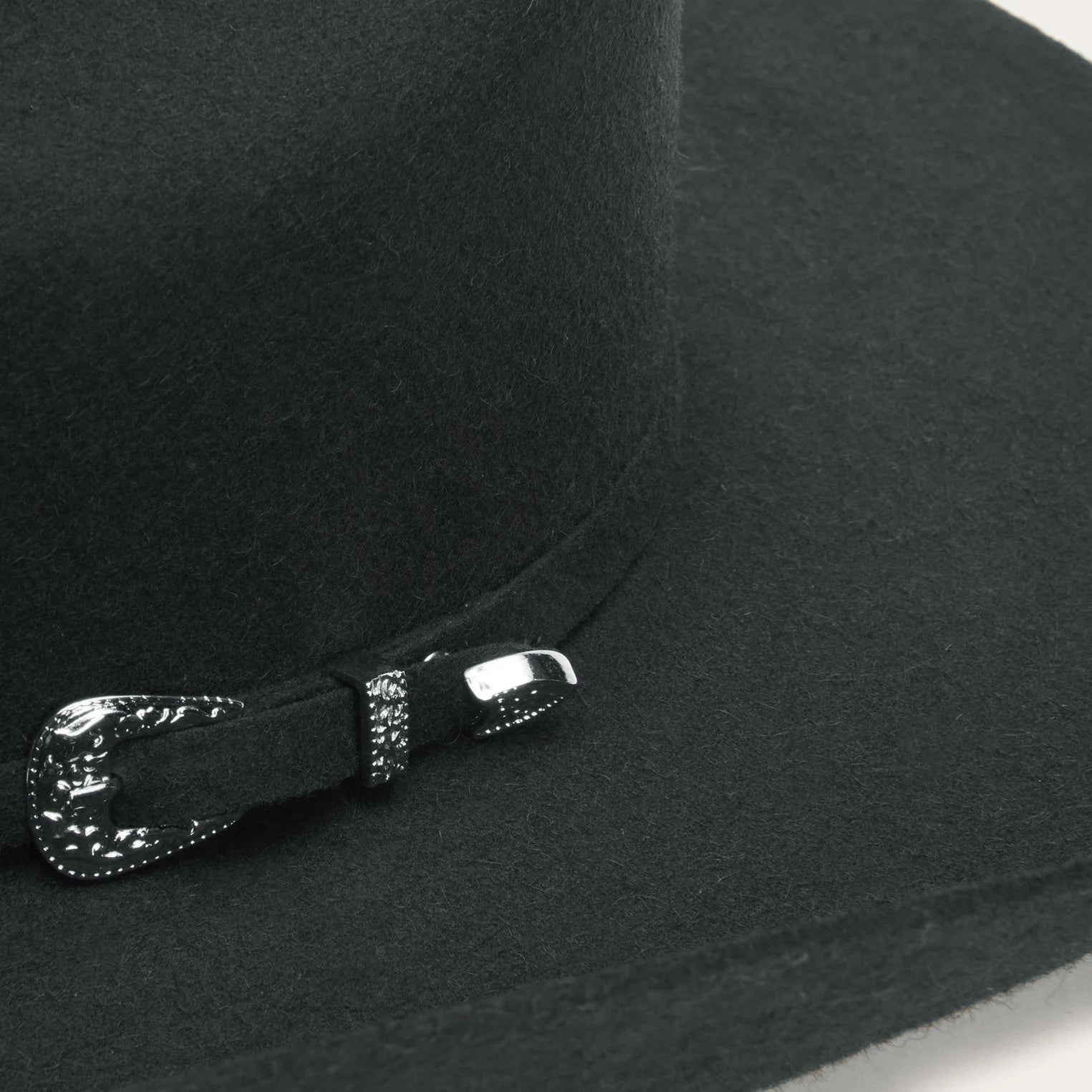 Crafted of high-quality 100% wool felt, this youth cowboy hat features a classic 4" cattleman crown and 4" brim and is finished with a self-felt band and a three-piece silver-tone buckle set. It has a stretch sweatband that's sized to fit most young buckaroos with a head size up to 54cm.