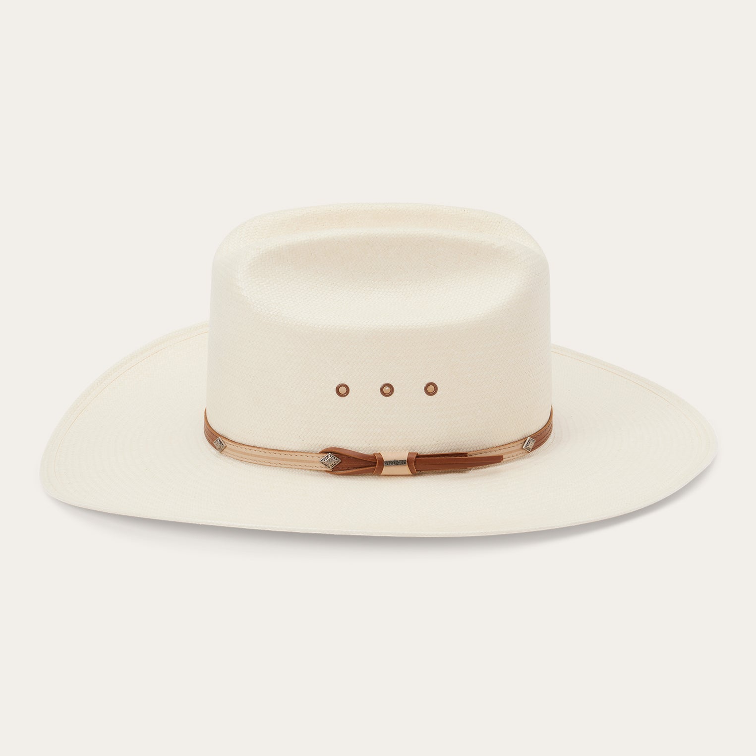 The Grant 10X premium straw cowboy hat is crafted from 10X quality Shantung straw. Lightweight and durable with a smooth feel, it has a 4 1/4" cattleman crown with eyelets and 4" brim, complemented by a stylish tan and natural leather hat band with tails and silver-tone diamond-shaped conchos. An authentic It logo tack adds the perfect finishing touch, while a leatherette sweatband provides fit and comfort. Handmade in the USA with the finest construction and materials, our straw hats are made to stand the test of time.