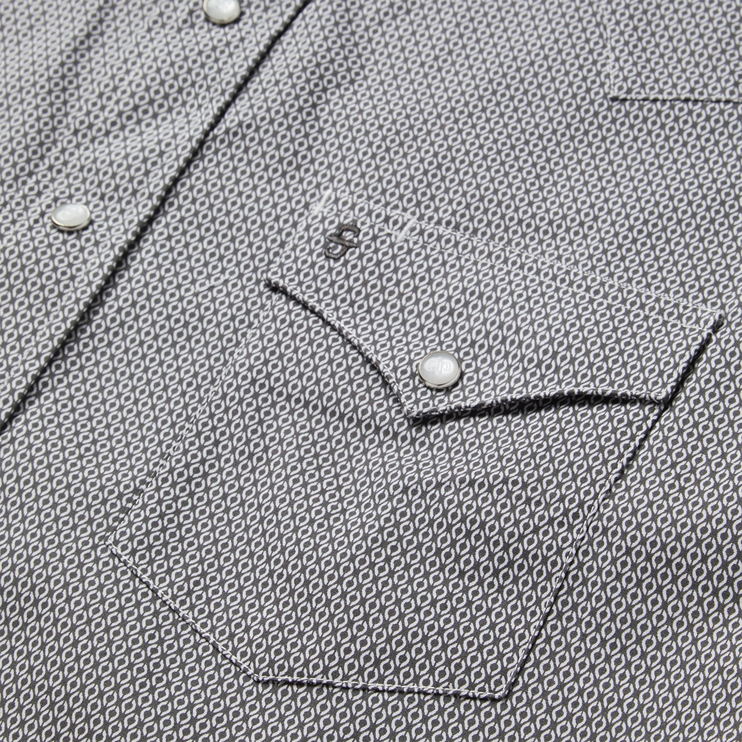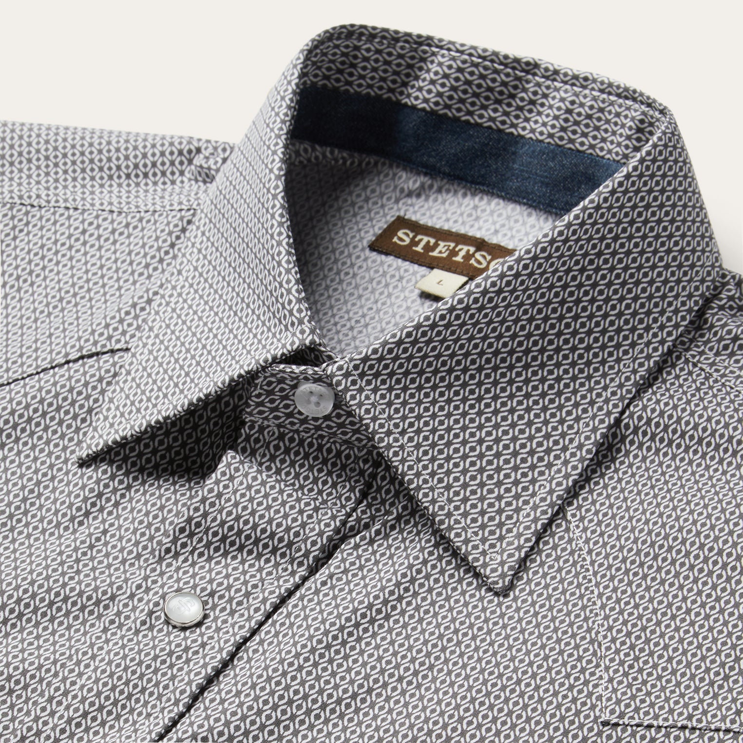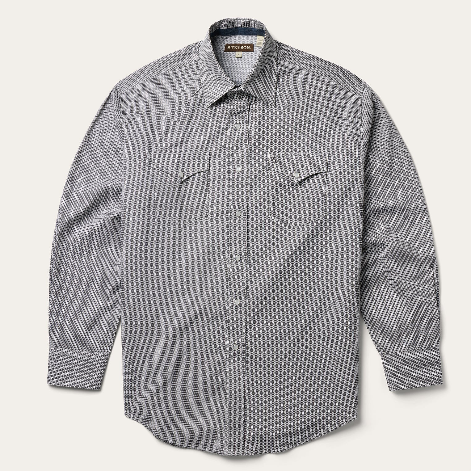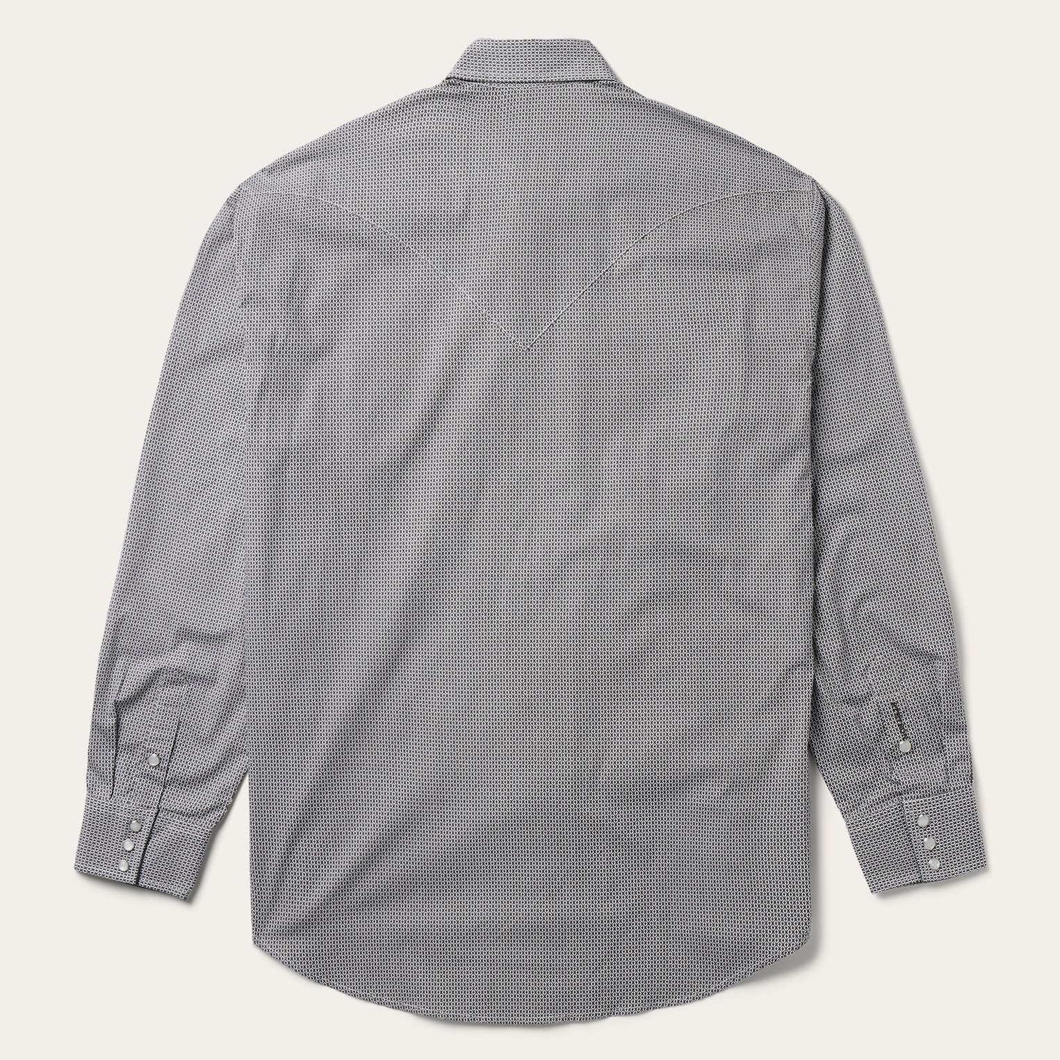This Western shirt is crafted from a lightweight cotton poplin with a Grey Geo allover print. It features a one-point curved back yoke, logo pearl snap front, and three snap cuffs. The signature It "S" logo is featured on the front left pocket and "It" is embossed on the right sleeve placket. It has a denim strip on the inside collar band and is garment washed for a soft feel that only gets better with age. Cut trim for a modern fit and crafted with 100% cotton for quality and breathability.