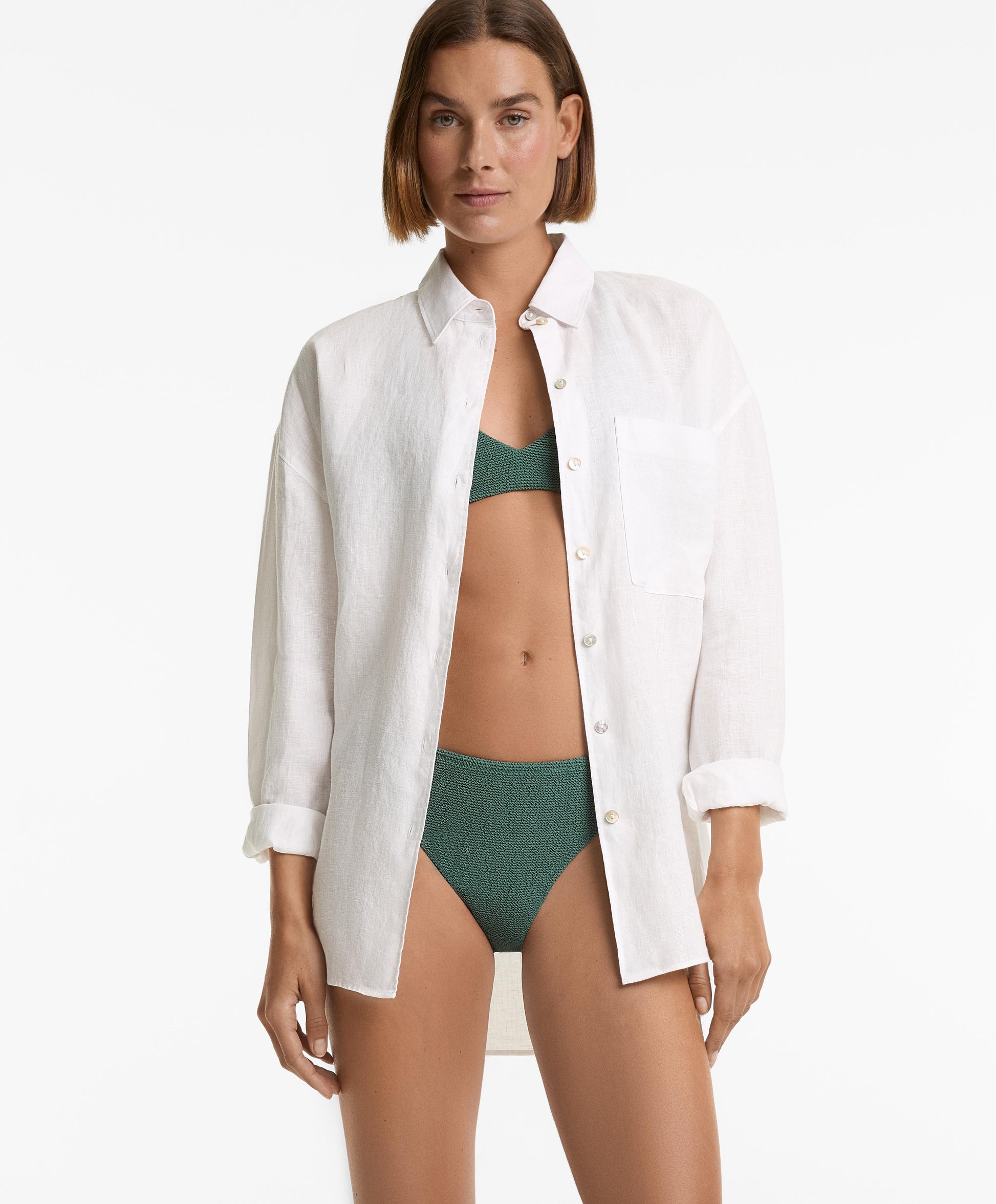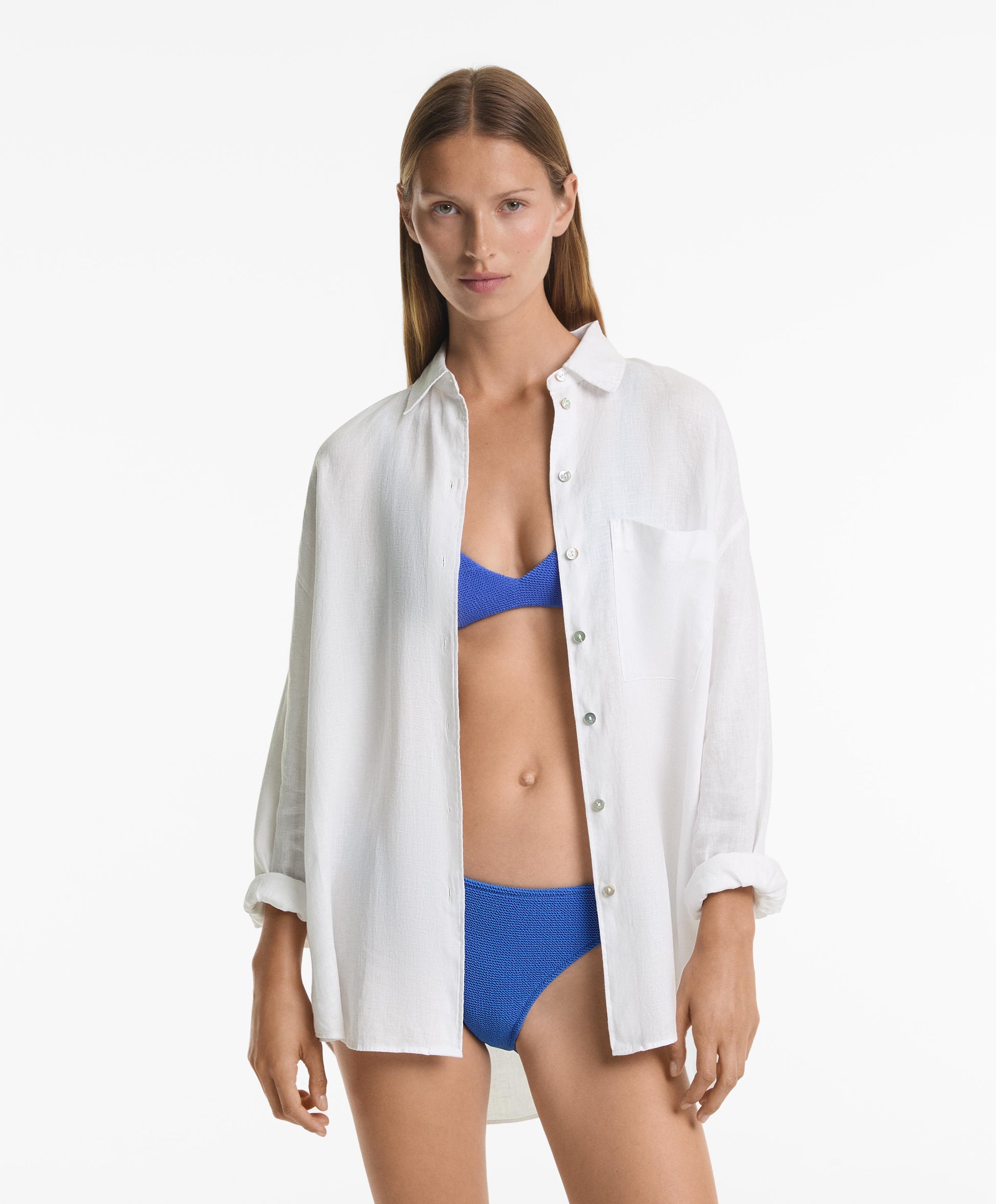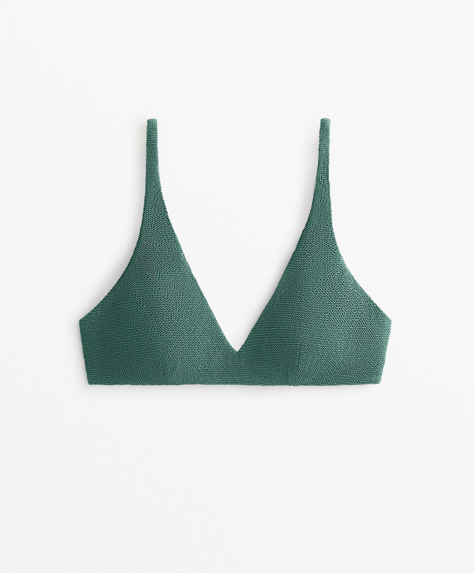 Ref. 0704/382/873 Halterneck bikini top with hook fastening at the back. Wireless and with removable cups. Crinkle fabric with textured finish.Materials and care instructions