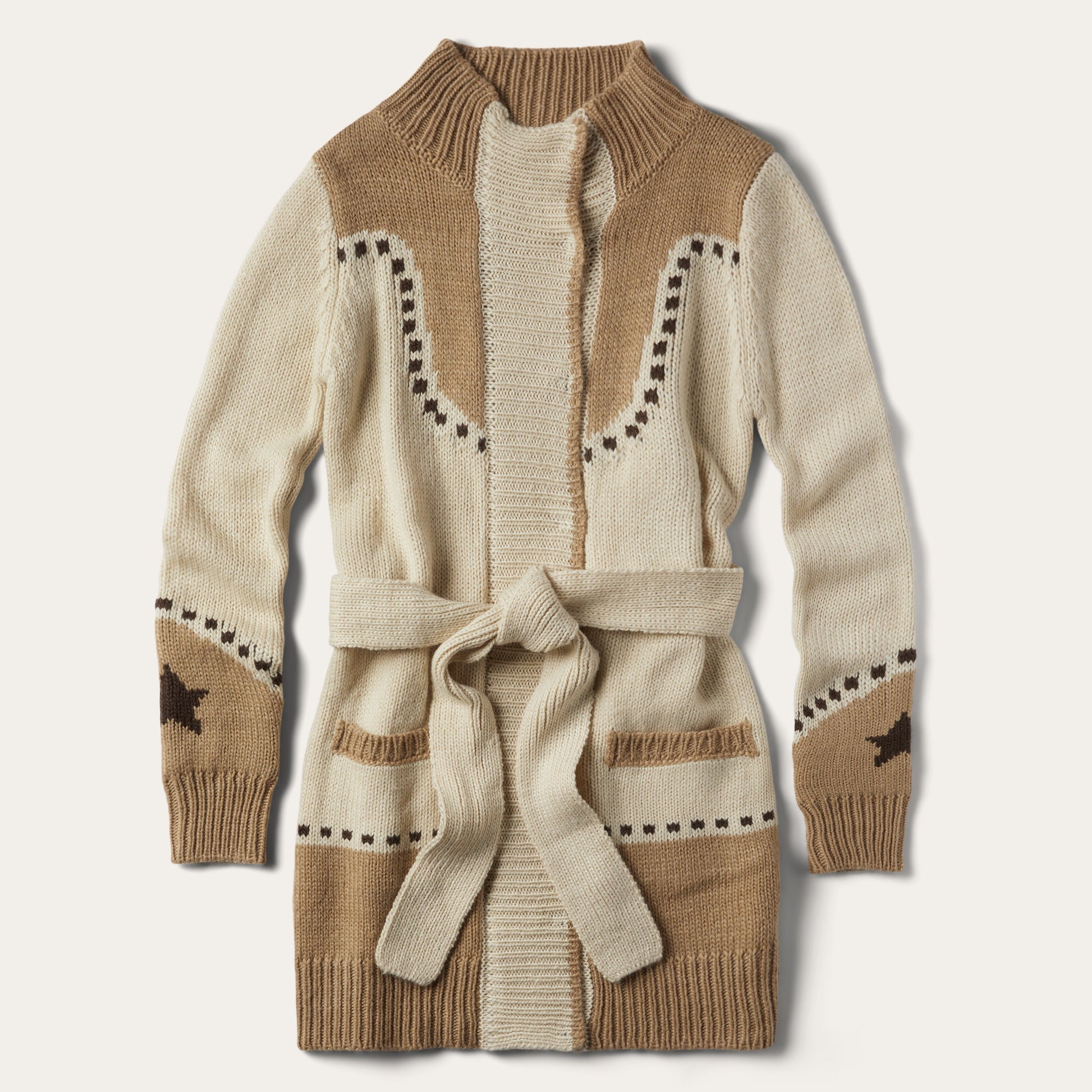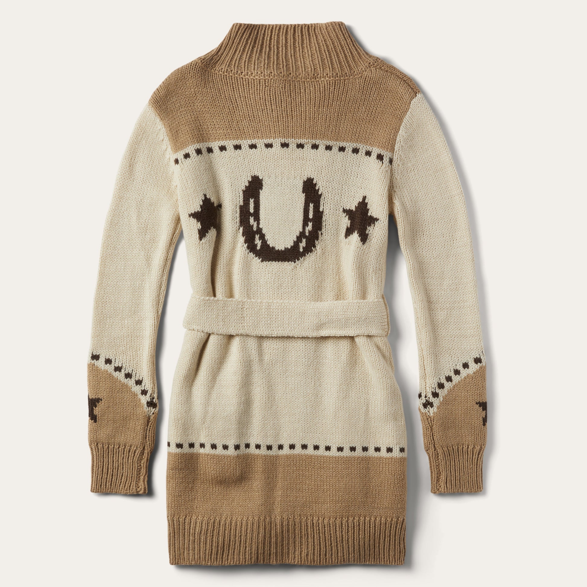 Celebrating It's rich tradition of Western style, this white and cream belted cardigan sweater features a vintage horseshoe and star motif. It has wide-ribbing at the collar, front placket, sleeves and hems, a self tie waist and large dress maker snap closure. Made from a cozy wool blend, it has a flowing, easy drape that pairs perfectly over your favorite jeans.