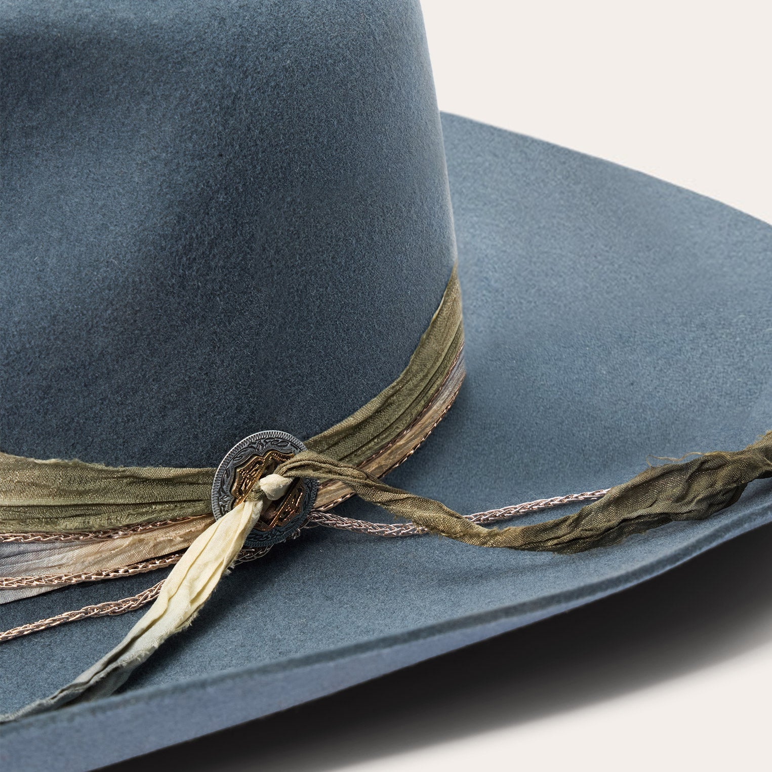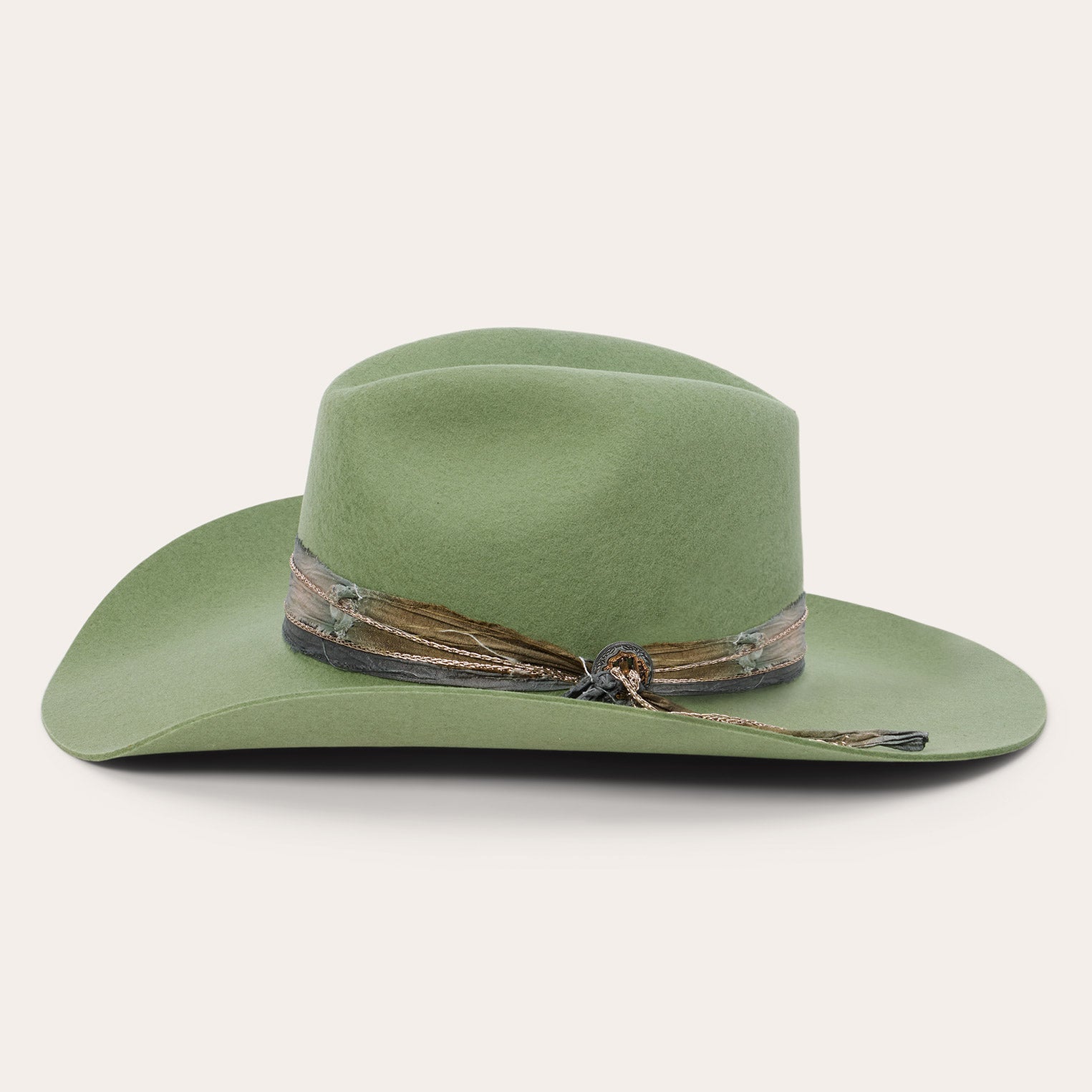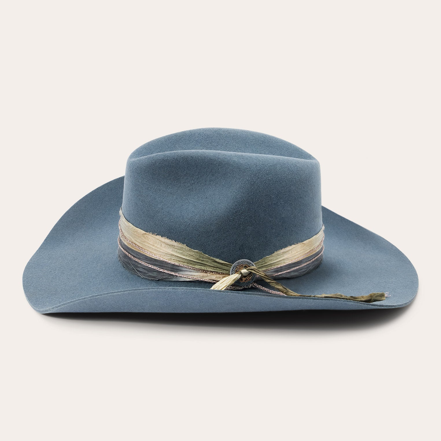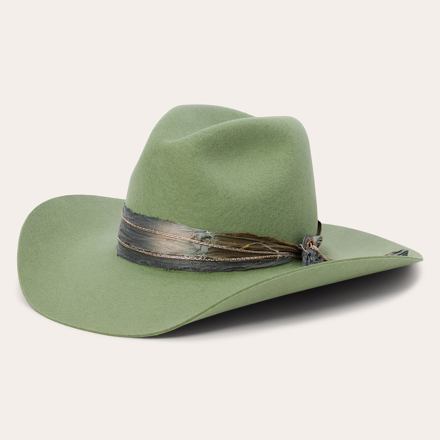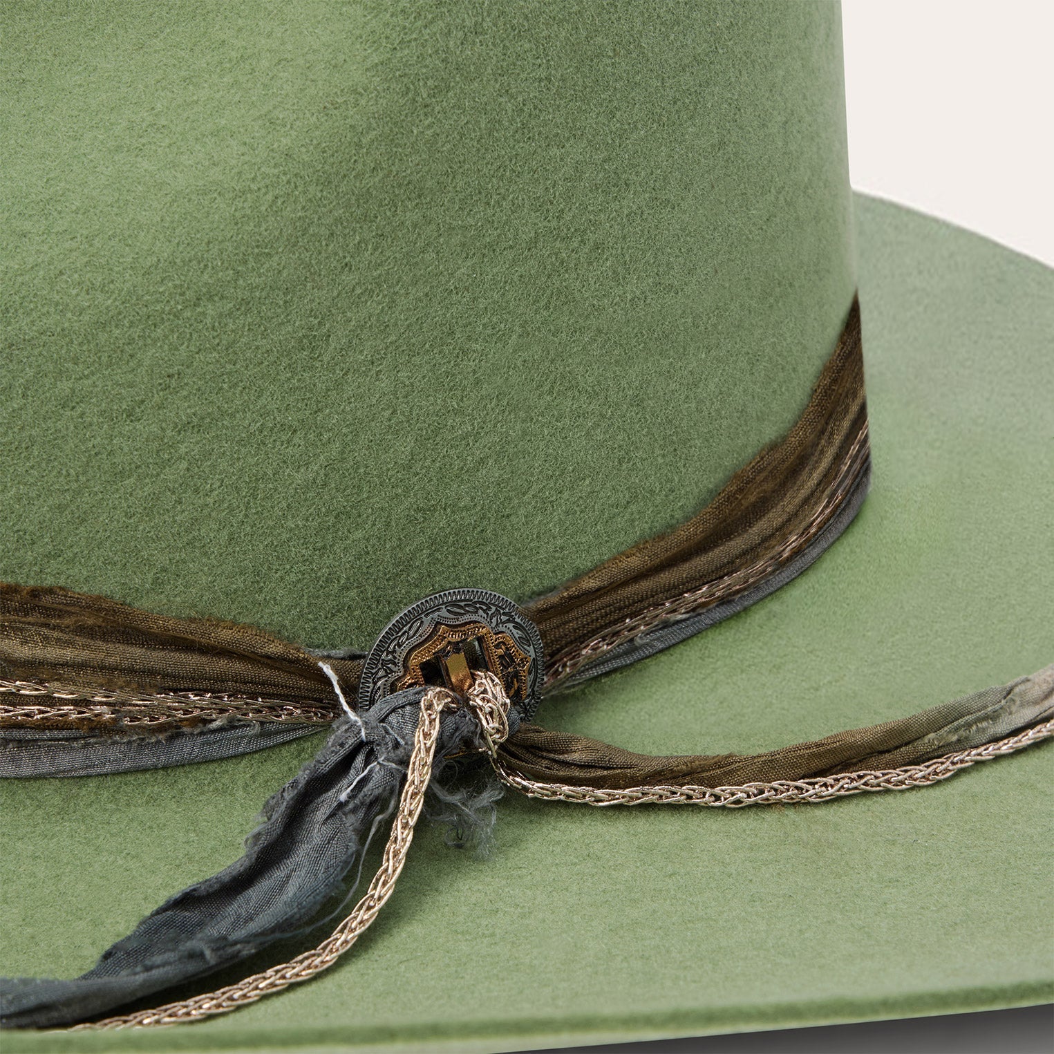 This western-inspired fashion hat makes a statement with its bold silhouette and unique, bohemian style details. It features a 4 1/2" center dent pinch front crown, 3 3/4" brim and a one-of-a-kind hand-dyed silk cord with faux chain double wrap hatband and two-tone concho detail. Handmade in the U.S.A. with a firm finish from high-quality wool felt, it's finished with a moisture-wicking DRI-LEX? sweatband and satin liner for a comfortable, all-day fit.