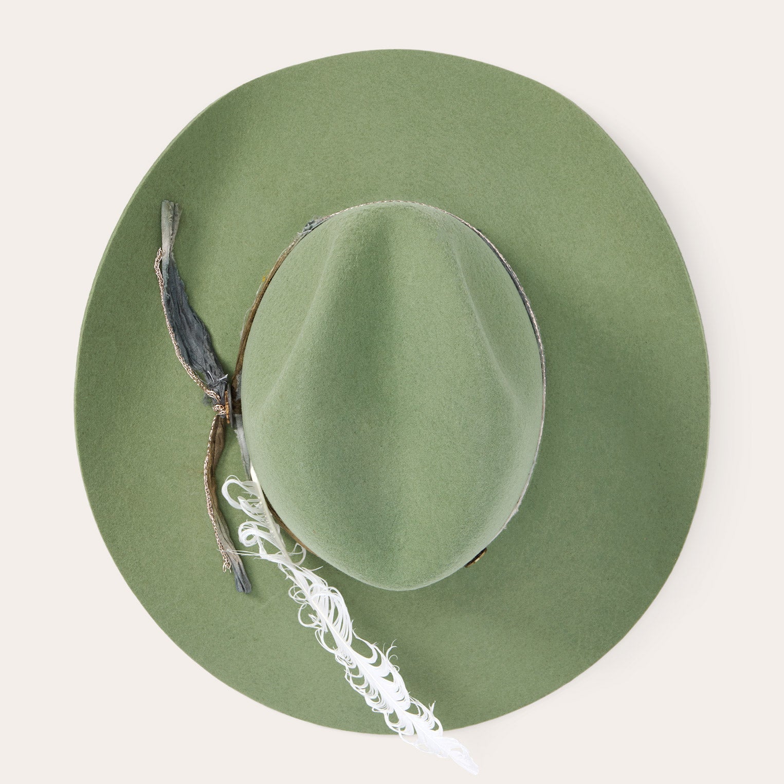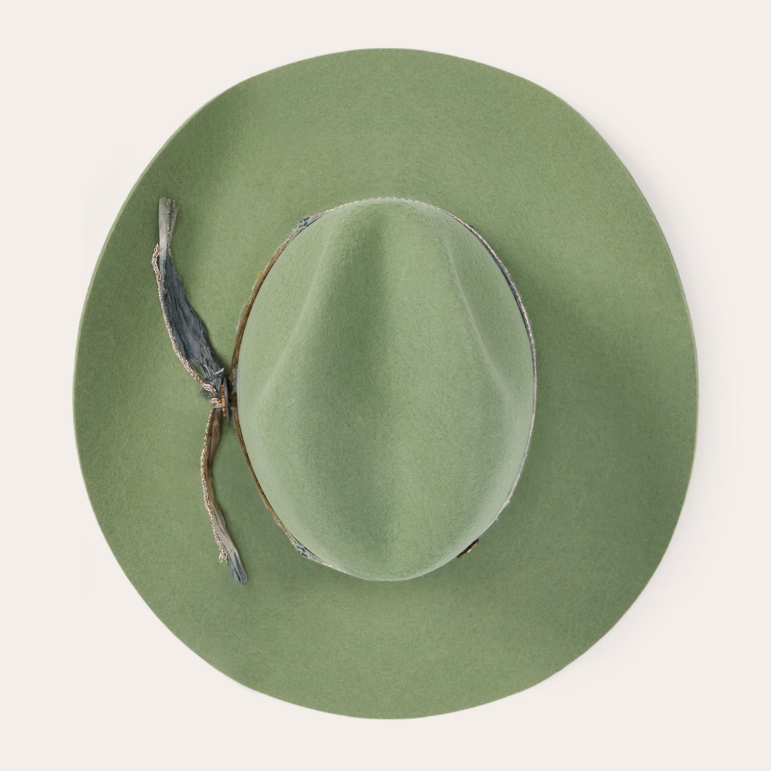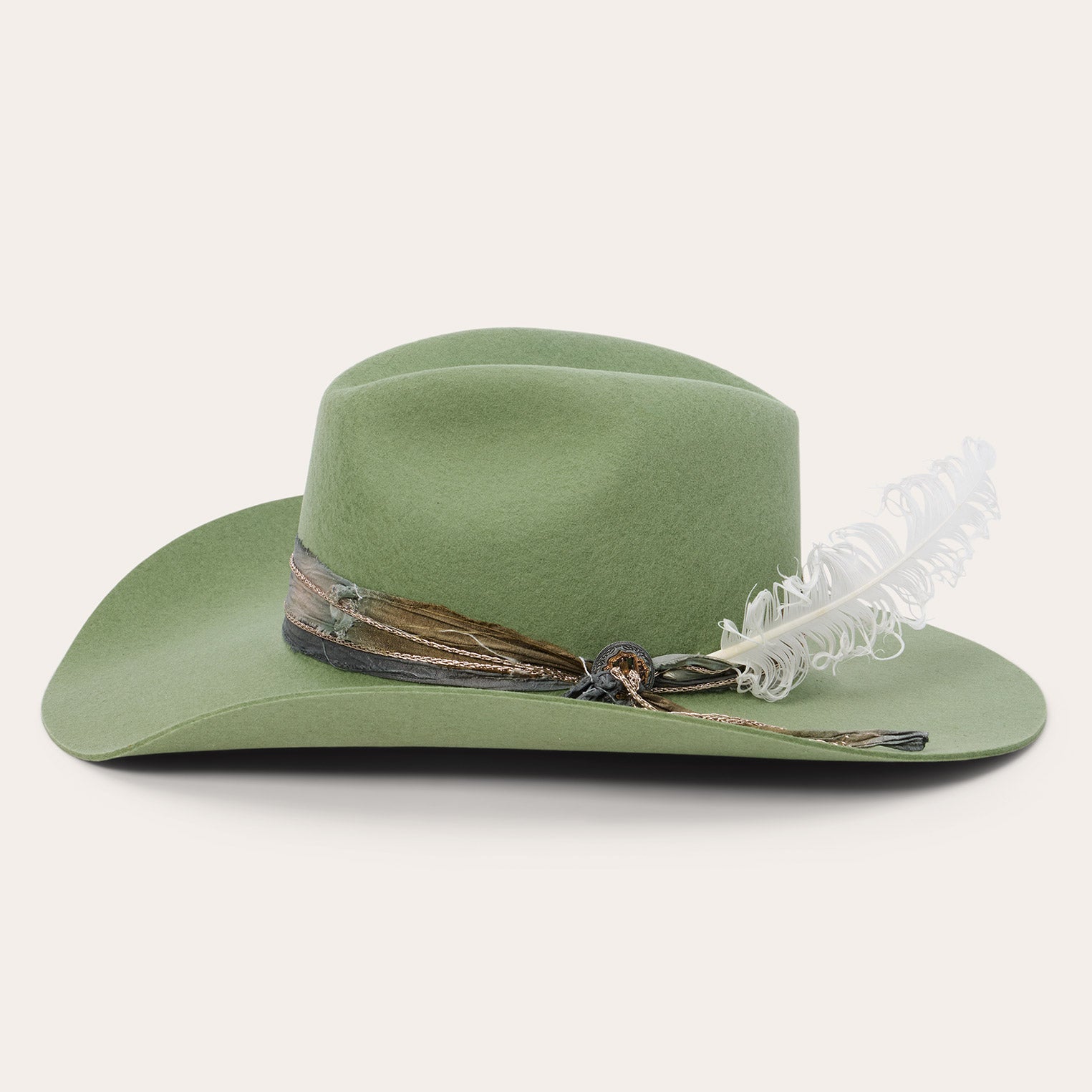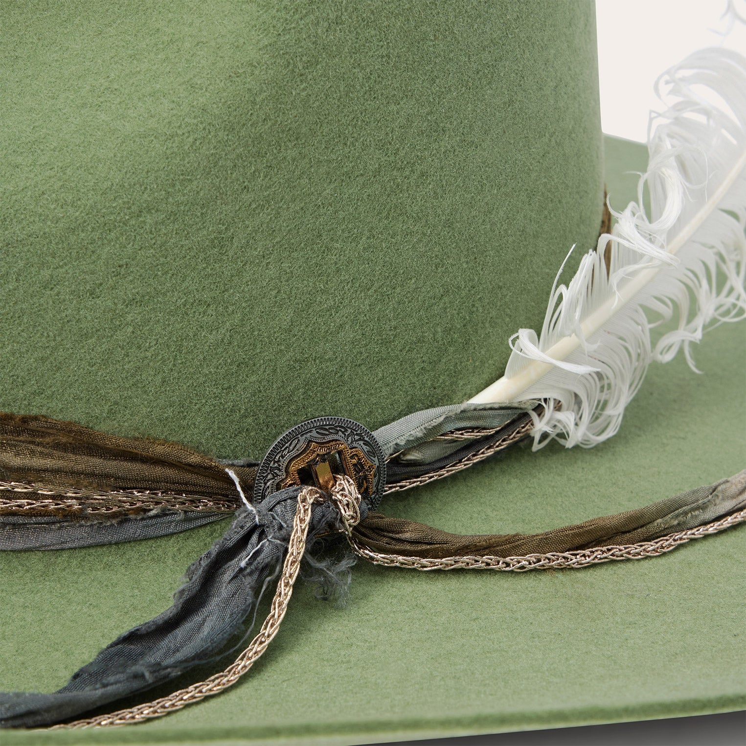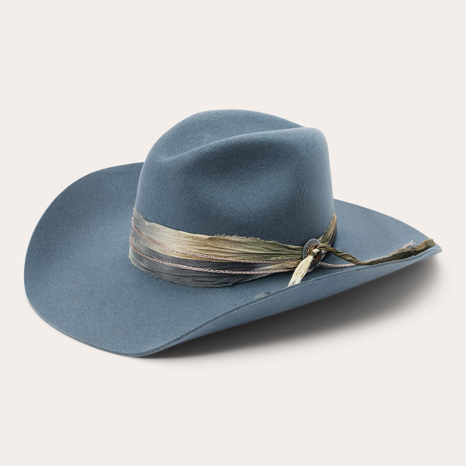 This western-inspired fashion hat makes a statement with its bold silhouette and unique, bohemian style details. It features a 4 1/2" center dent pinch front crown, 3 3/4" brim and a one-of-a-kind hand-dyed silk cord with faux chain double wrap hatband and two-tone concho detail. Handmade in the U.S.A. with a firm finish from high-quality wool felt, it's finished with a moisture-wicking DRI-LEX? sweatband and satin liner for a comfortable, all-day fit.