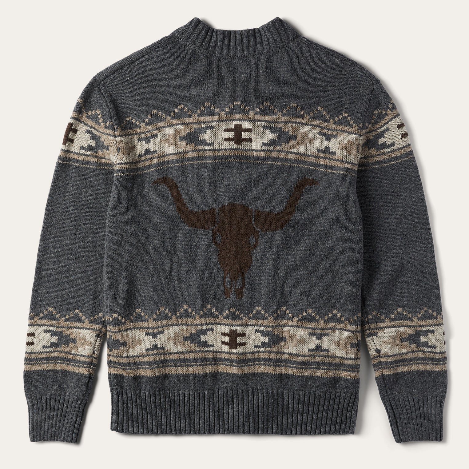This grey zip-front cardigan sweater gives a nod to Stetson¡¯s long-standing Western heritage with a Longhorn Steer motif alongside an Aztec-inspired print. It has two front hand pockets and a self-knitted collar, cuffs and waistband. Made from a wool blend, it provides warmth, comfort, and a dose of rugged style.