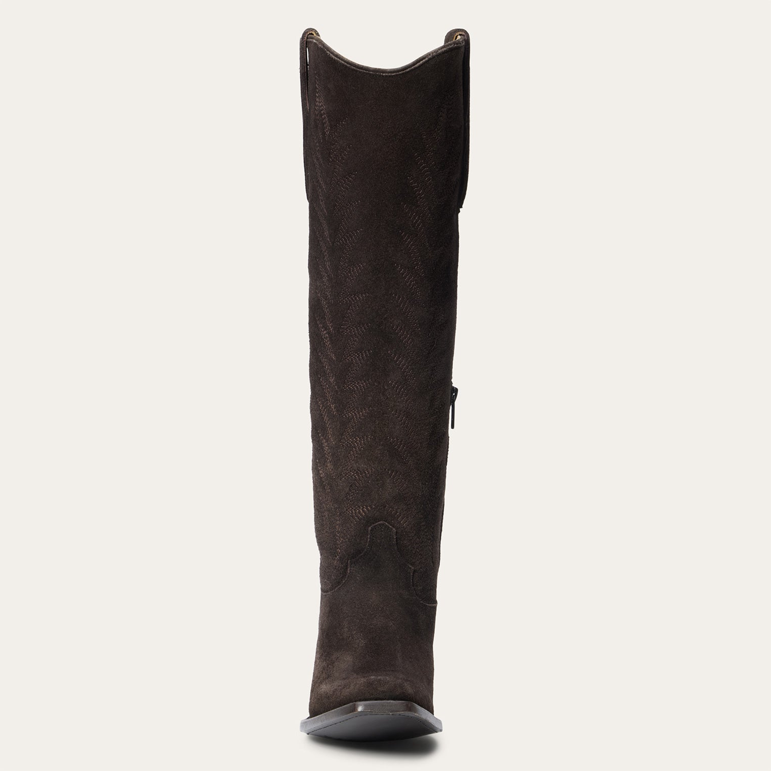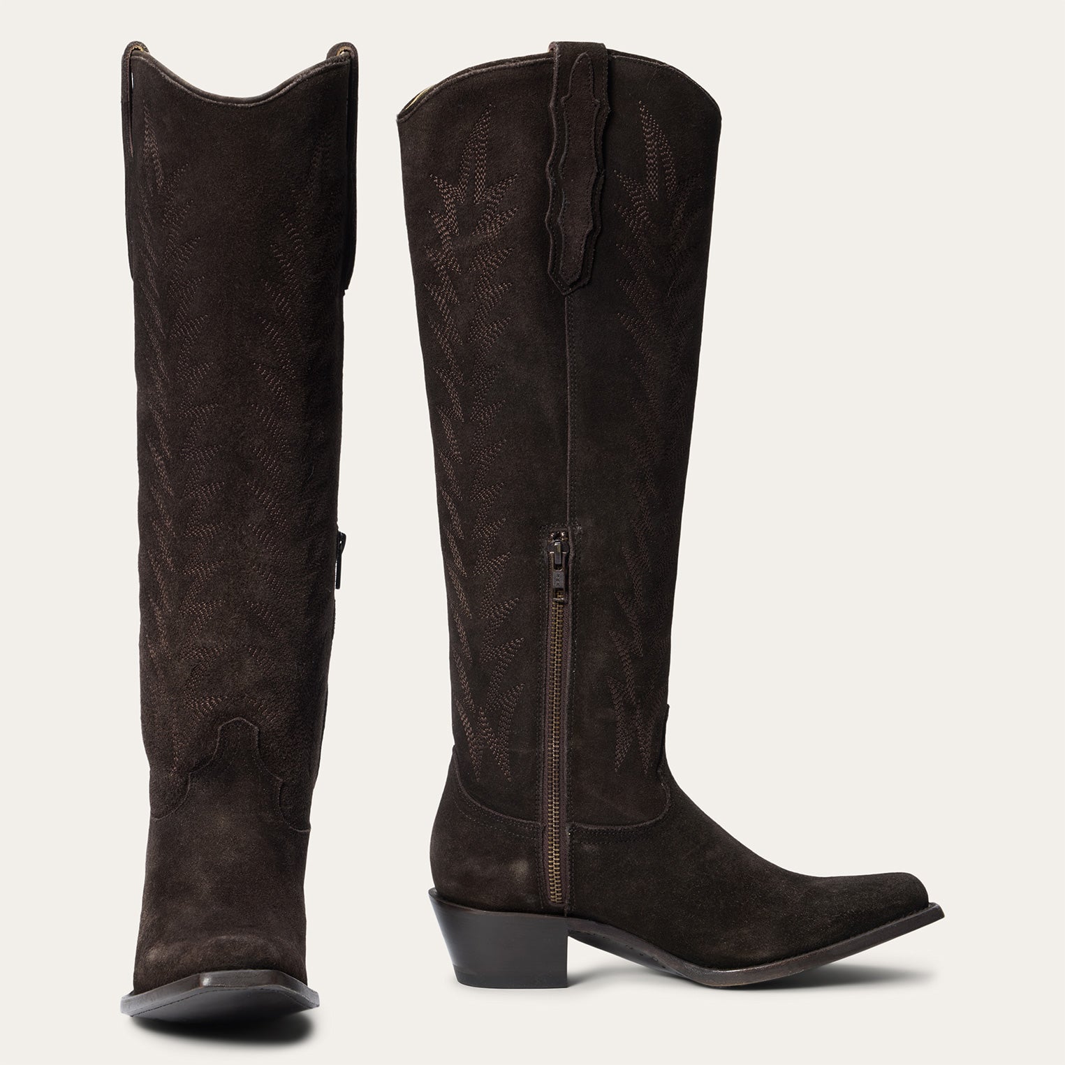 A bold western boot with vintage charm and distinctive details, the Loretta Boot features a suede vamp and an extra-tall 18" shaft with vintage-inspired embroidery. It has a hog nose toe-a rare, heritage-style shape with a rounded, slightly upturned profile-and a hand-stacked leather heel. A discreet ? side zipper offers easy on and off. An all-leather sole, crafted with lemonwood pegs and brass nails, provides a firm foundation, while premium cowhide leather lining and a cushioned leather insole ensure all-day comfort and support.