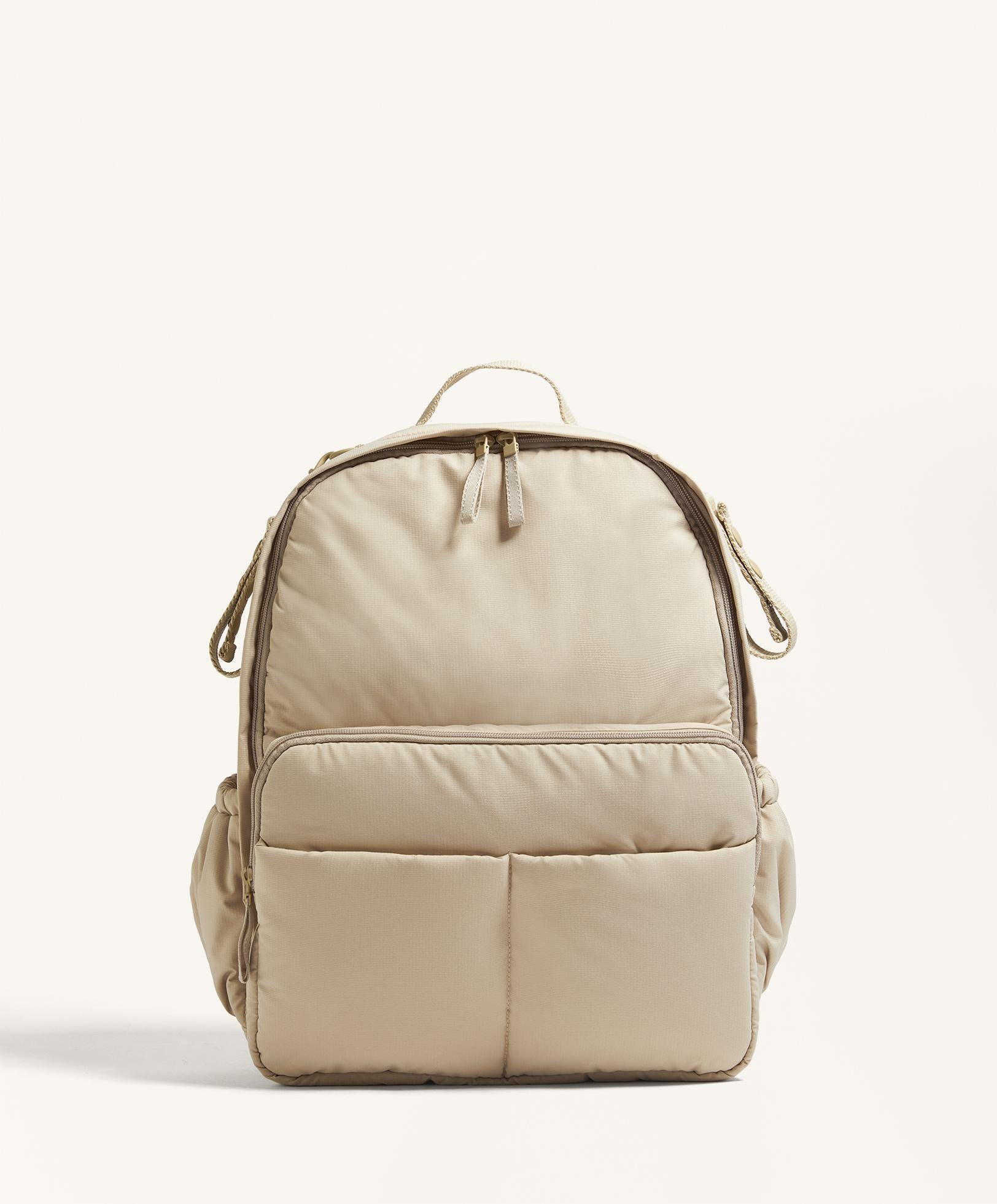 Ref. 4080/380/107 Nylon maternity backpack. There are 3 pockets on the front. The main zip pocket measures 33x24 cm and the interior is made of insulating material. In addition, there are two overlapping pockets that are kept closed by small magnets. The sides have two pockets with elasticated gathered closures. The backpack has two large compartments, a main one and another at the back of the backpack, so it is hidden. This compartment has a pocket suitable for laptops up to 16 inches. The interior has multiple elastic and zipped compartments to facilitate organisation. In addition, a removable strap is included to hold the keys. External measurements: 34 cm x 44 cm. Depth 12 cm.Materials and care instructions