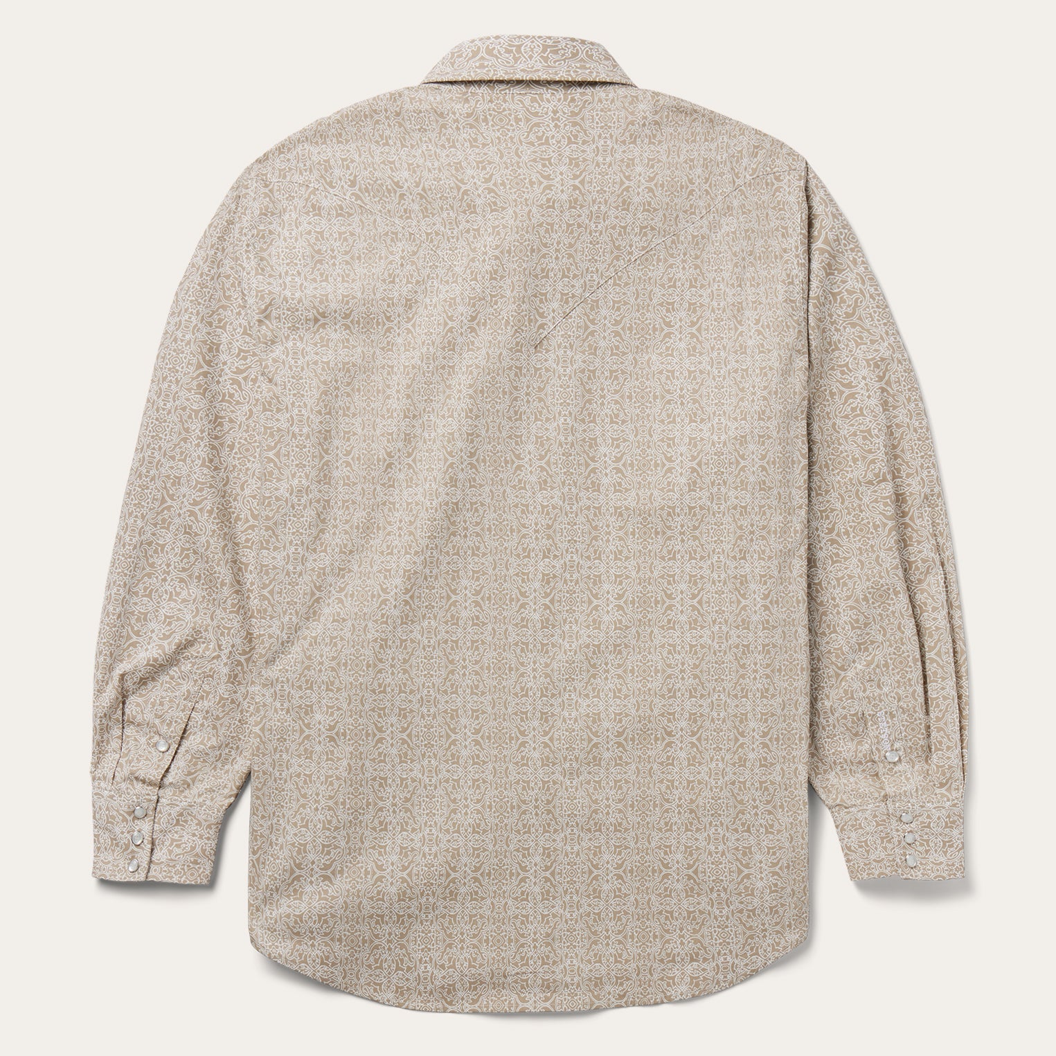 This western shirt is crafted from crisp, lightweight 100% cotton poplin and features an exclusive Sand Medallion print. It has a one point ultra deep curved back yoke, three snap cuffs, the It "S" embroidered on the front left pocket, and "It" embroidered on the right sleeve placket. The classic snap front features logo pearl snaps and is finished with solid poplin contrast inside trim.