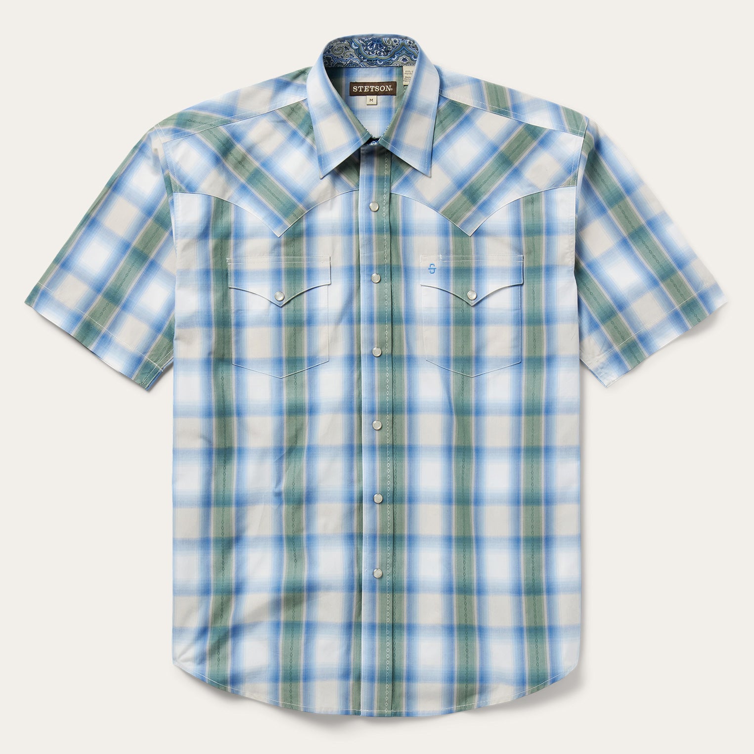 This short-sleeve western shirt is crafted from high-quality 100% cotton dobby and features an exclusive moss plaid with satin stitch. It has a one point ultra-deep curved back yoke, classic snap front with pearl logo snaps, contrasting inside trim fabric, and an embroidered logo detail.