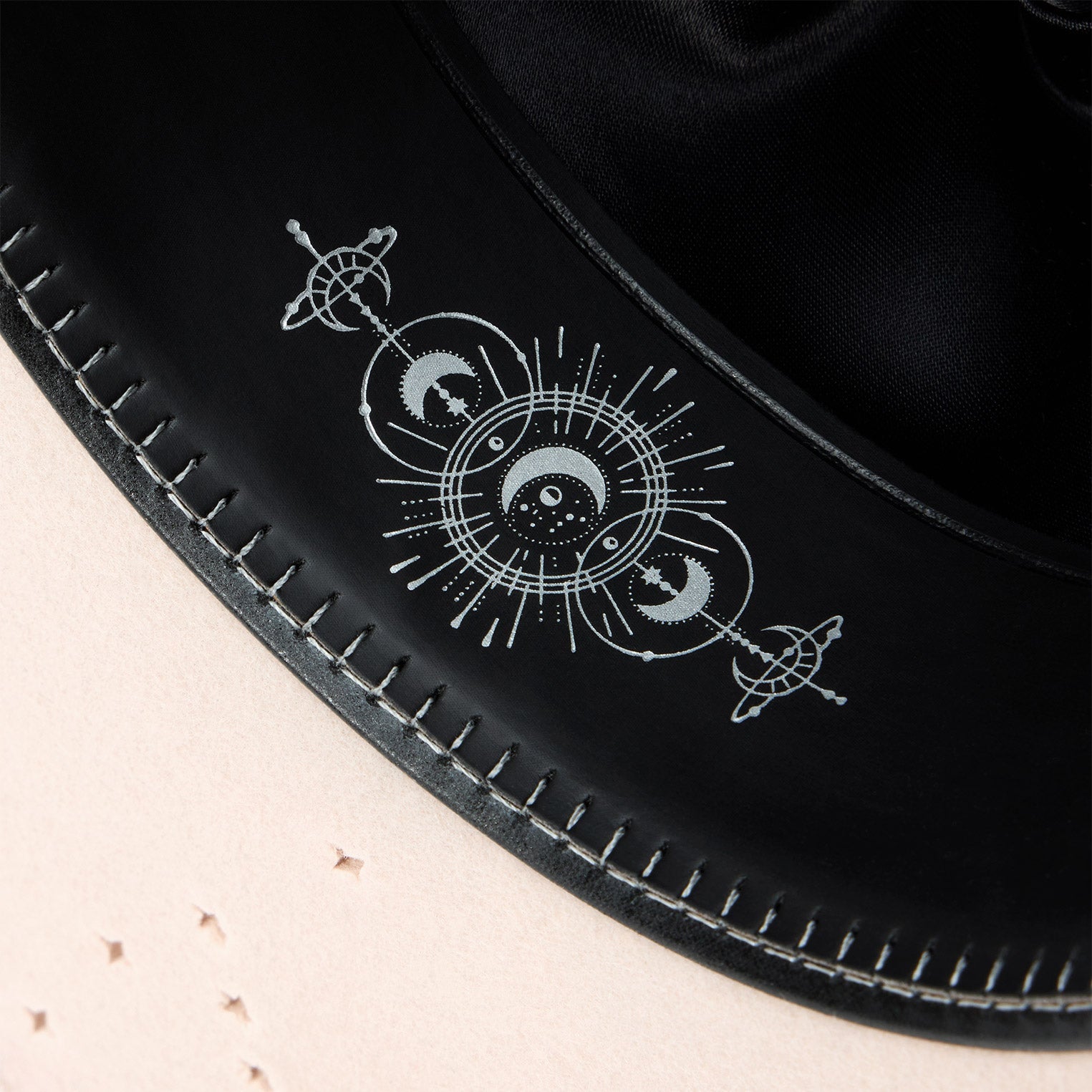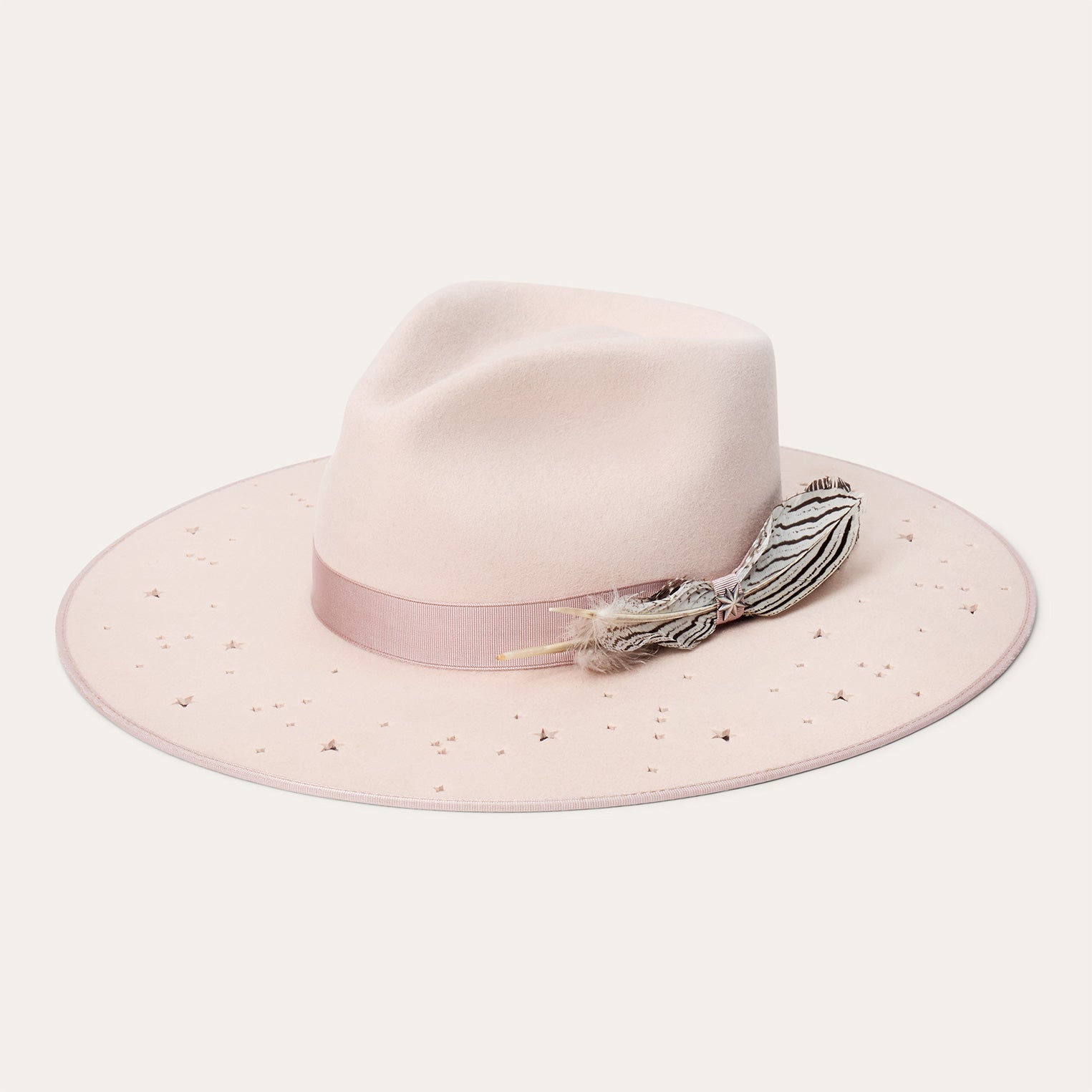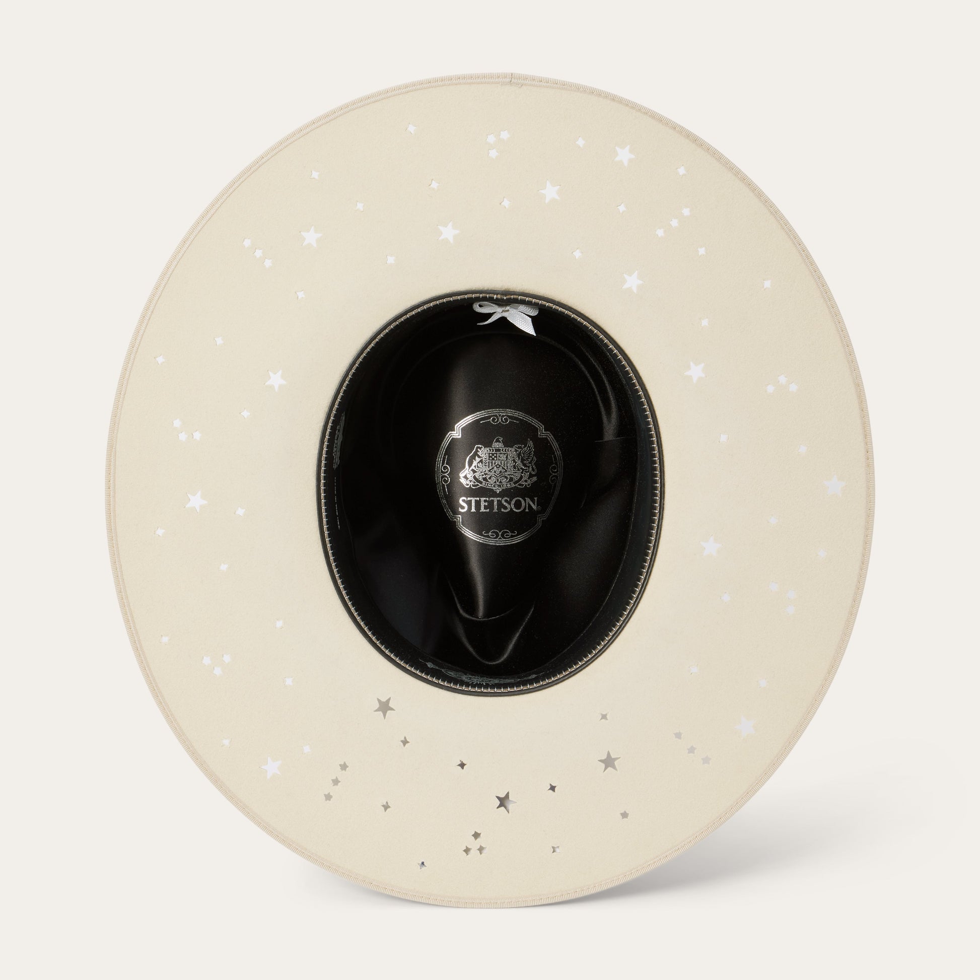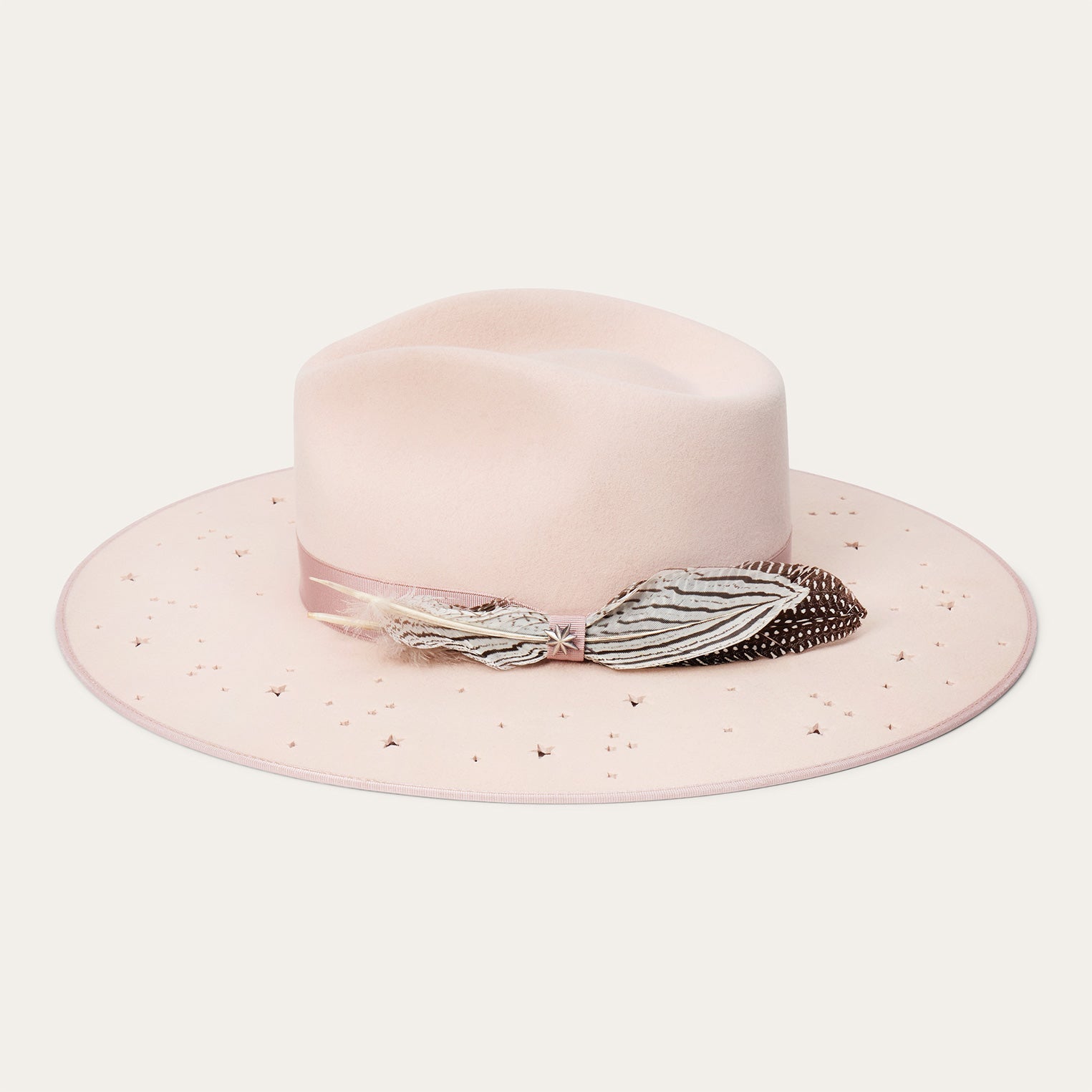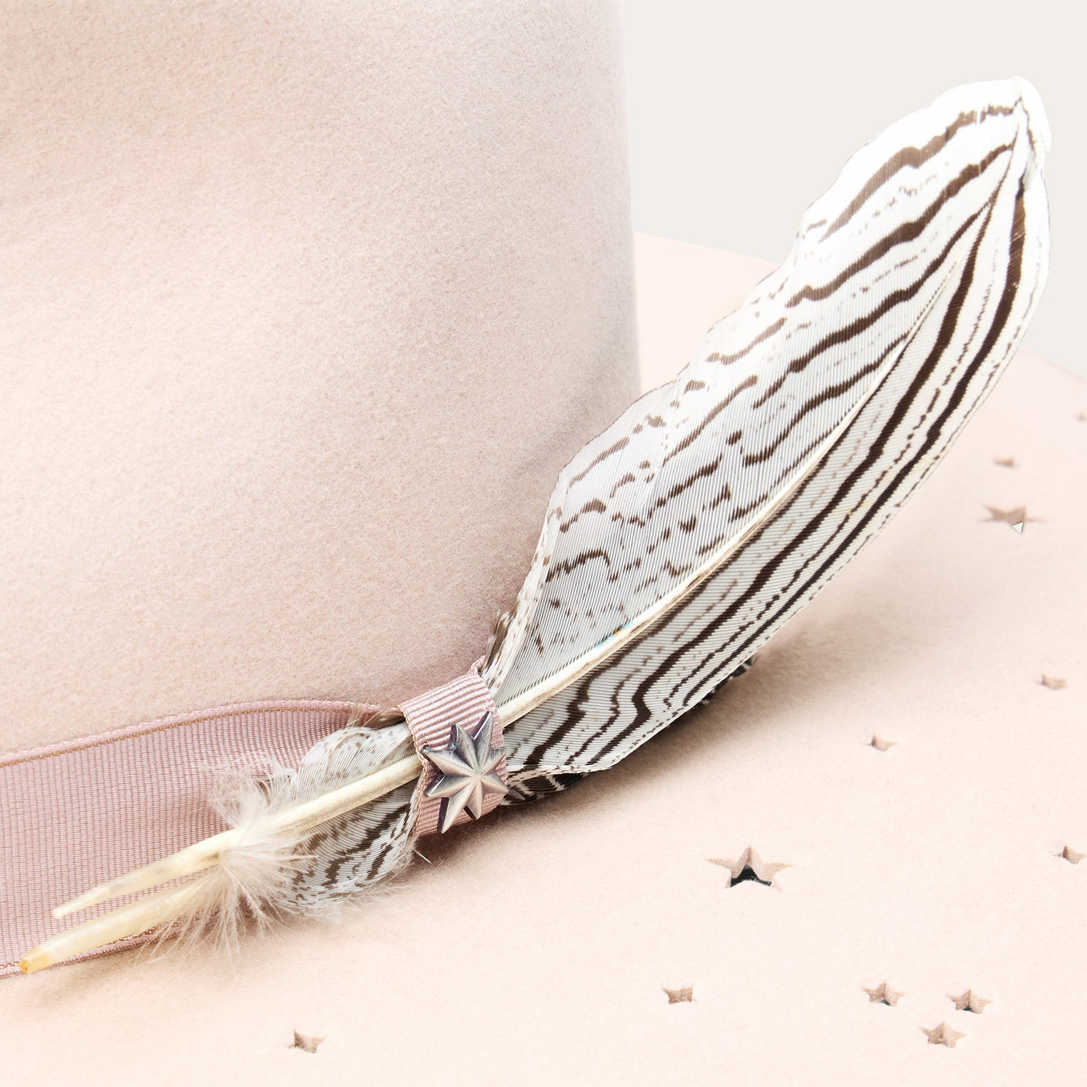 This unique hat features distinctive star cutouts on its wide, flat brim, along with both a feather and a custom It Star Pin on the grosgrain hat band. This hat is crafted with firm felt, and a high-quality leather sweatband at the interior.