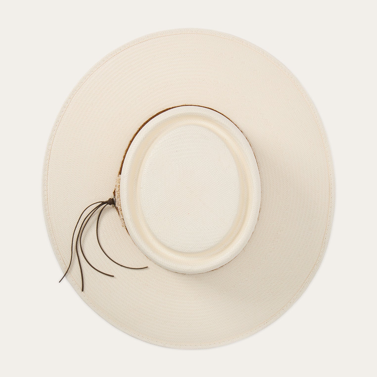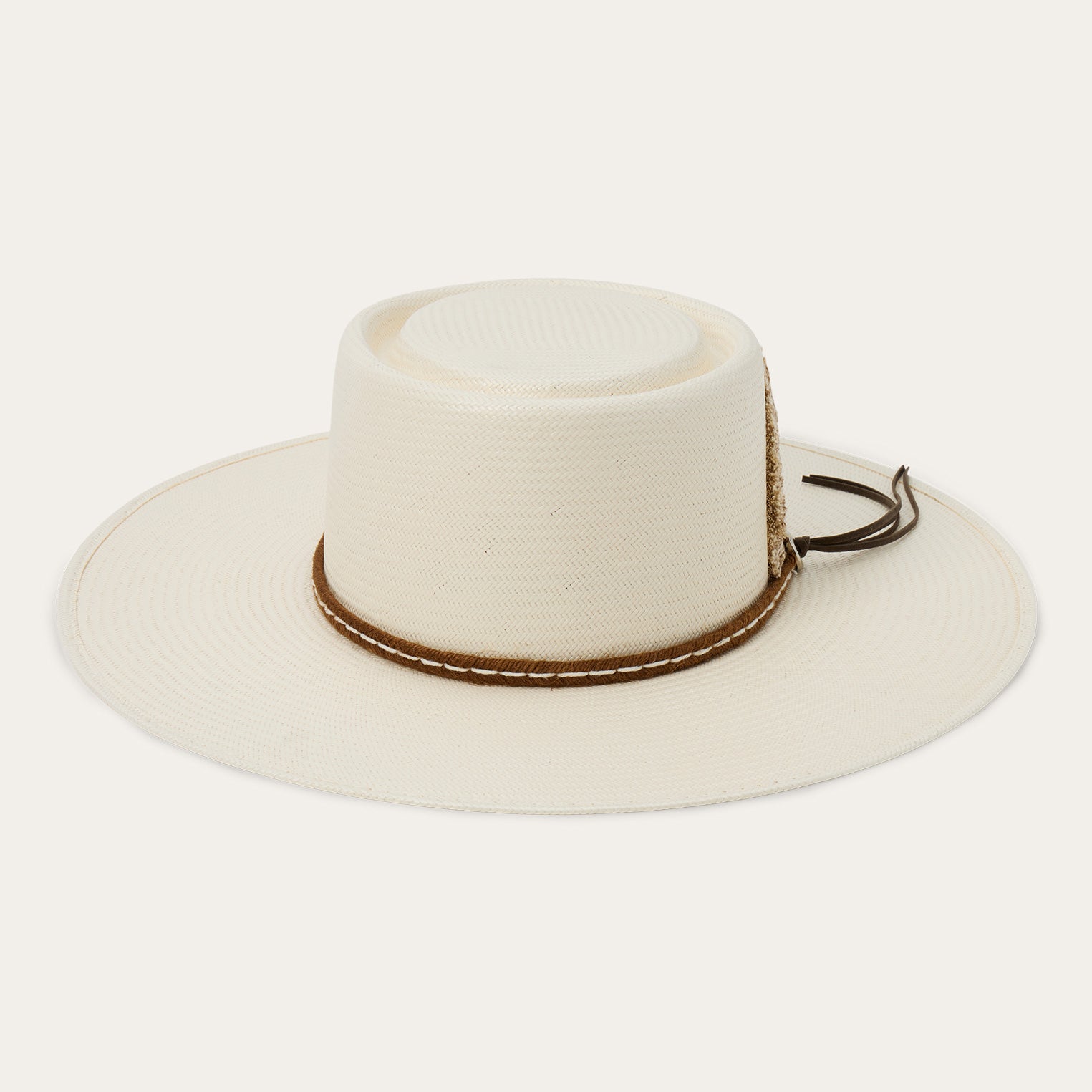A statement-making straw fashion hat, the Oasis combines our legendary craftsmanship with a bold silhouette and eye-catching details. Handwoven one strand at a time from high-quality 100% shantung straw, it has a 4 ?" telescope crown with a 4" flat brim, and it's fitted with a leather hat band with rawhide accent and silver-tone concho and striking knit fabric detail. A cloth sweatband provides a comfortable, time-tested fit..Lightweight, durable, and made to retain its shape, it's an ideal, stylish companion for any warm-weather occasion.