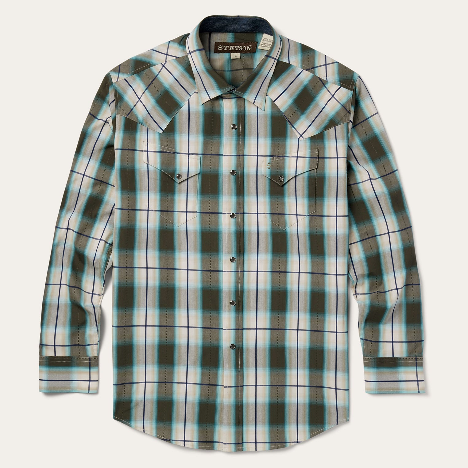This snap front western shirt is crafted from 100% cotton and features a yarn-dyed olive ombre plaid with dobby stitch. It has asymmetrical snap-closure pockets with flaps, a spread collar,contrast denim inside trim and a one point back yoke.