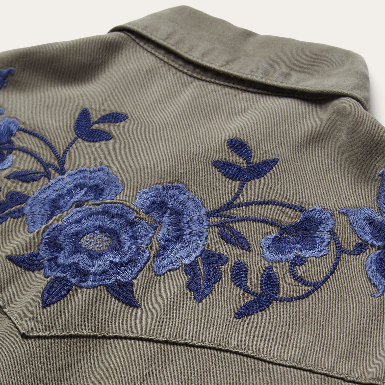 This Western-style boyfriend fit shirt is crafted from durable 100% lyocell denim twill that has been yarn dyed a rich olive tone. A stunning navy and cornflower embroidered floral detail is featured on the traditional Western-style single point curved front and back yokes. Faux pocket flaps, a classic snap front closure and self piping complete this unique, stylish top.