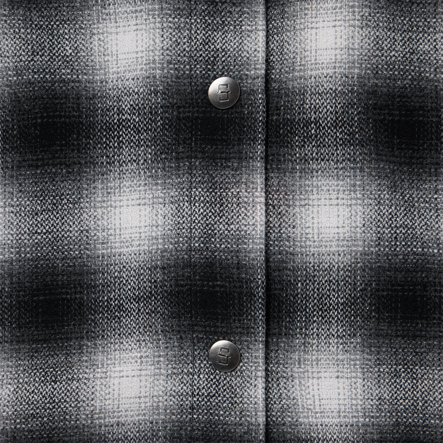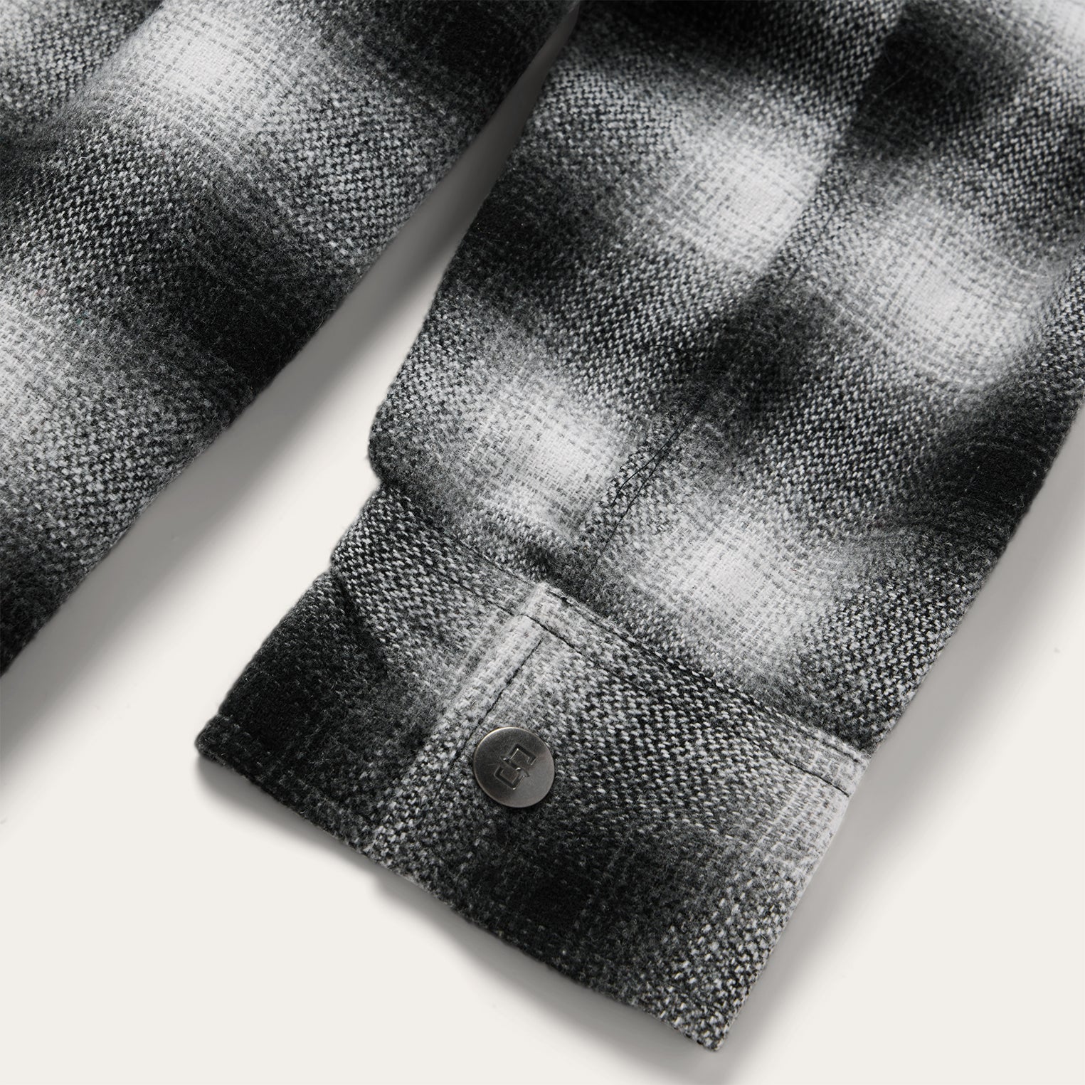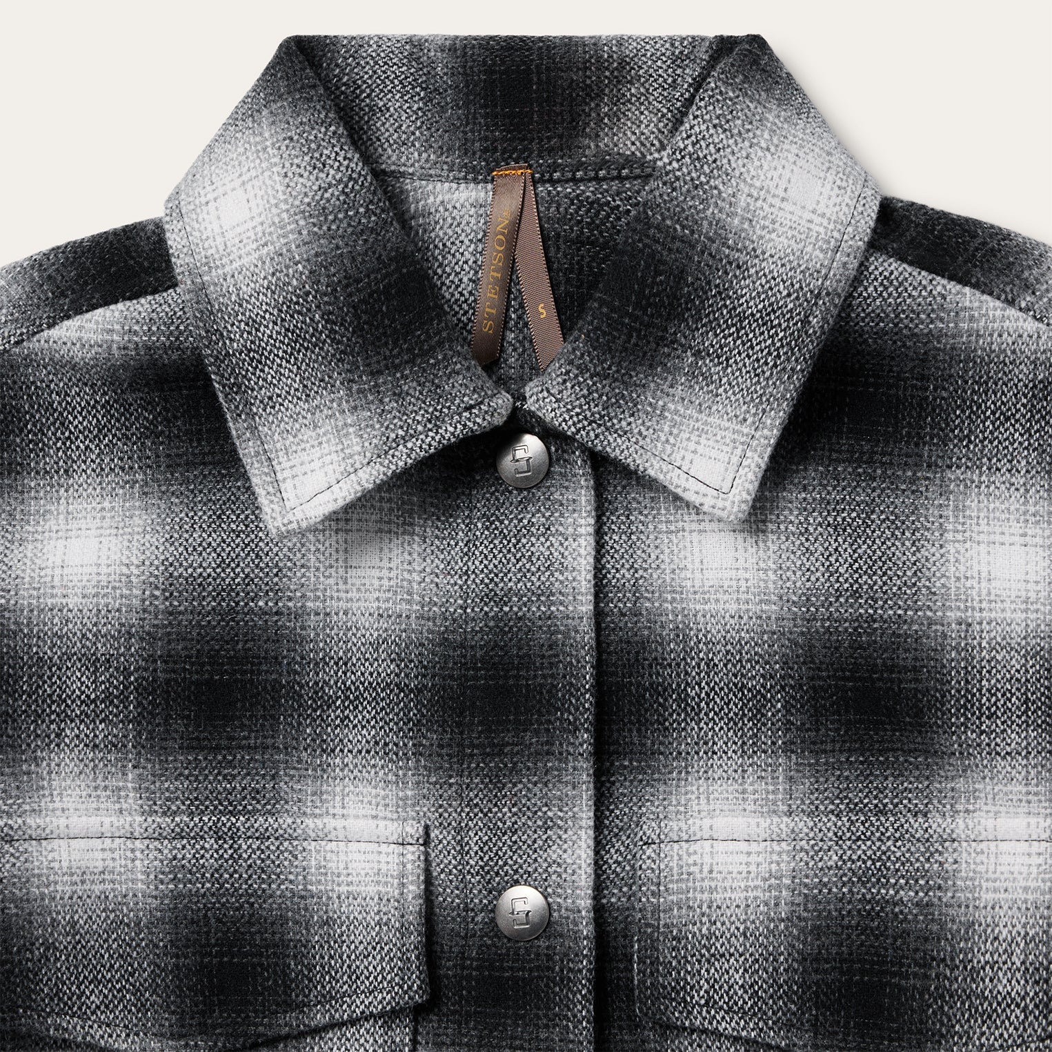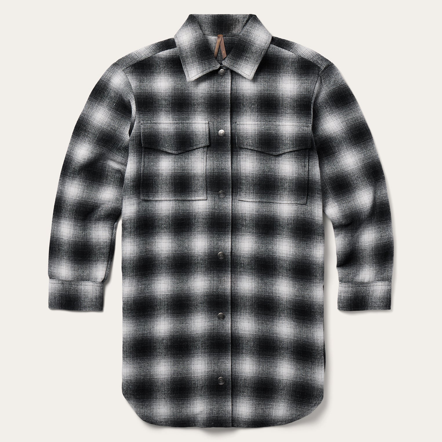 This ombre plaid oversized shirt jacket is crafted from a soft, comfortable high-quality wool blend and makes the perfect versatile layer whenever the weather calls for it. It has a flowing, flattering fit with drop shoulders, large chest patch pockets, side seam pockets and a straight back yoke with inverted box pleats at the back and at the button cuffs.