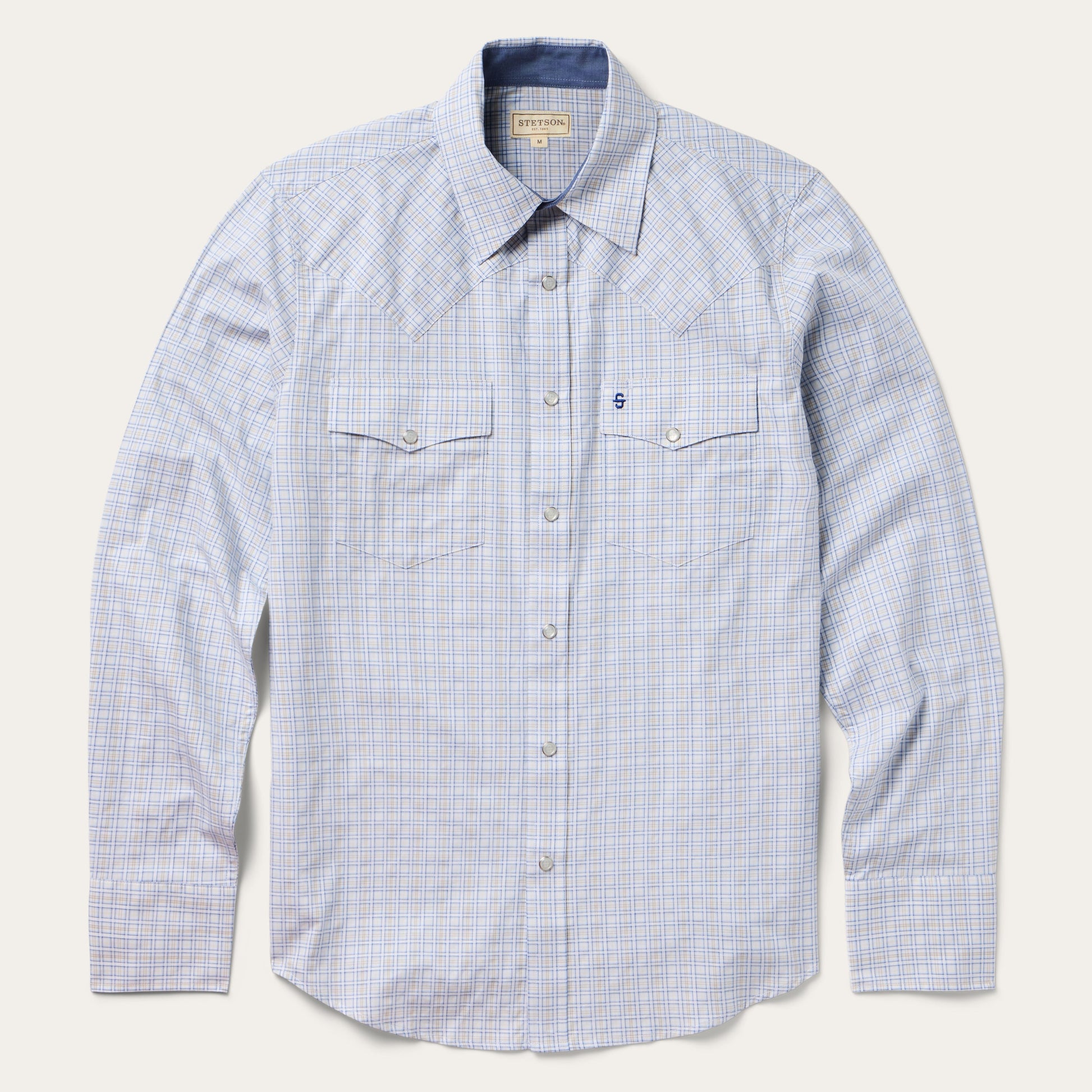 This western shirt is crafted from high-quality 100% cotton and features an exclusive ombre plaid check pattern with satin stitch. It has a one point curved front yoke, two point curved back yoke, contrast chambray inside trim, classic snap front with logo snaps, and three snap cuffs, along with embroidered logo details. It's cut in our Tailored Fit, a versatile style that's slightly tapered at the sides for a streamlined appearance and a shorter length designed to look great tucked or untucked.