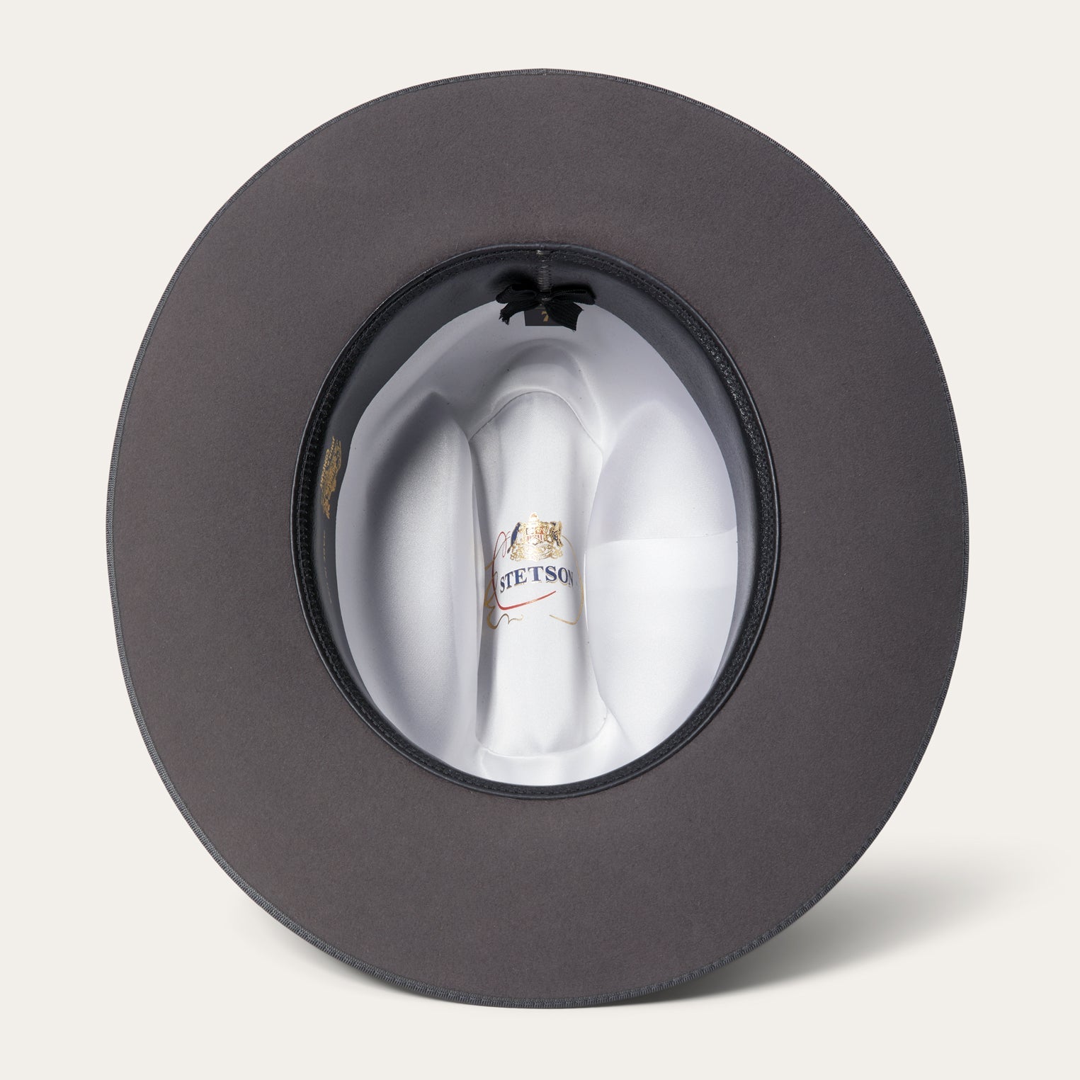 The Open Road Royal Deluxe features a roan leather sweatband and a 4 ?" crown outfitted with a grosgrain hat band and branding-iron hat pin bearing the initials "JBS", a nod to our founder, John B. It, whose pioneering legacy lives on in every hat we sell.